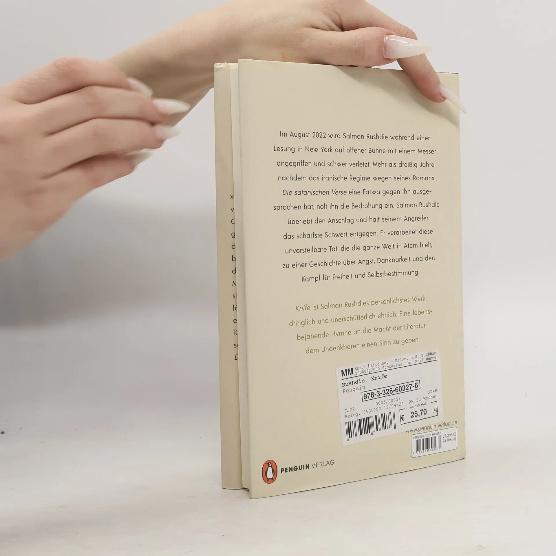 Das Weltereignis: Salman Rushdie erzählt die Geschichte des Attentats auf ihn und schafft daraus große Literatur Im August 2022 wird Salman Rushdie während einer Lesung auf offener Bühne mit einem Messer angegriffen und schwer verletzt. Mehr als dreißig Jahre nachdem das iranische Regime wegen seines Romans »Die satanischen Verse« eine Fatwa gegen ihn ausgesprochen hat, holt ihn die Bedrohung ein. Salman Rushdie überlebt den Anschlag und hält seinem Angreifer das schärfste Schwert entgegen: Er verarbeitet diese unvorstellbare Tat, die die ganze Welt in Atem hielt, zu einer Geschichte über Angst, Dankbarkeit und den Kampf für Freiheit und Selbstbestimmung. »Knife« ist Salman Rushdies persönlichstes Werk, dringlich und unerschütterlich ehrlich. Eine lebensbejahende Hymne an die Macht der Literatur, dem Undenkbaren einen Sinn zu geben.
