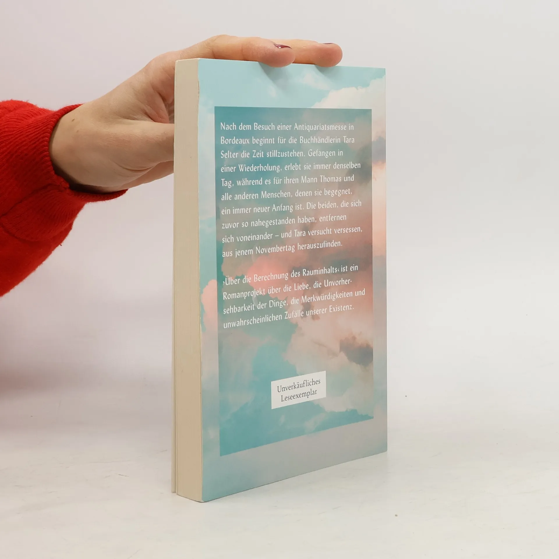 Nach einer Geschäftsreise zu einer Antiquariatsmesse in Bordeaux beginnt für die Buchhändlerin Tara Selter, die mit ihrem Mann Thomas in einem Haus in Nordfrankreich lebt, die Zeit stillzustehen. Gefangen in einer Wiederholung, durchlebt sie stets von Neuem jenen 18. November, während es für Thomas und alle anderen Menschen, denen sie begegnet, ein immer neuer Anfang ist. Sie erinnern sich an nichts, was »gestern« war, erwachen stets zu ihrem ersten 18. November des Jahres. Genießt Tara diese Zeit des »Schwindels« im doppelten Sinne die ersten sechzig Tage noch, offenbart sich langsam ein Problem: Sie wird älter, Thomas nicht. Die beiden, die sich zuvor so nahegestanden haben, entfernen sich voneinander – und Tara versucht versessen, aus dem 18. November herauszufinden. Über die Berechnung des Rauminhalts I ist der erste Band eines groß angelegten Romanprojekts, in dem Solvej Balle die Fiktion von der Wirklichkeit befreit, ohne jedoch Science-Fiction zu schreiben. Mit einem präzisen, stets aufmerksam lauschenden Stil schildert Balle die Mechanik und Monotonie der Zeitschleife, in die ihre Protagonistin gerät, sowie die ungewöhnliche Liebesbeziehung, die sich daraus ergibt. Eindringlich führt sie uns vor Augen, wie jeder in seiner eigenen Blase lebt, und lehrt uns – wie es große Literatur oft tut –, die Welt mit neuen Augen zu sehen.