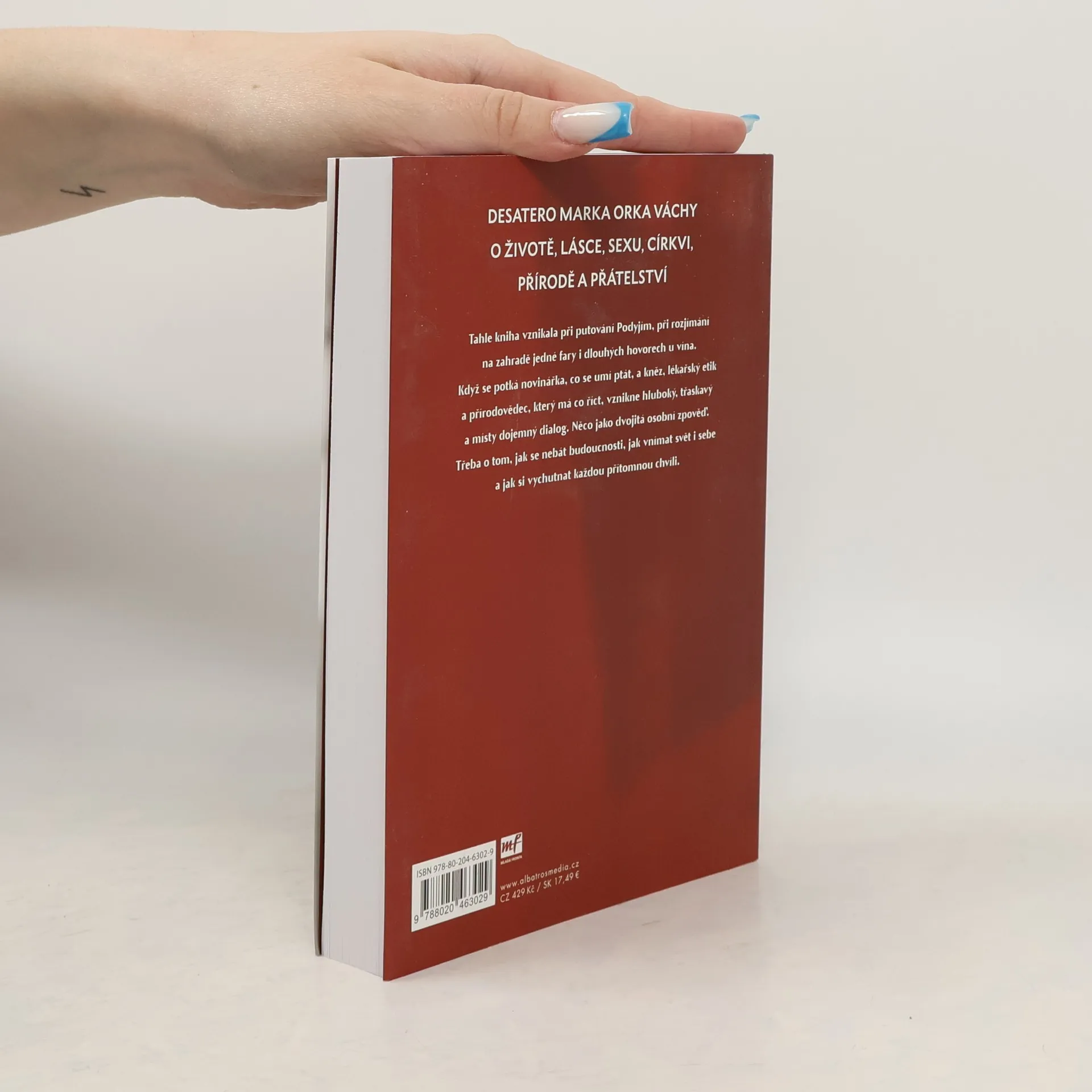 Desatero Marka Orko Váchy o životě, lásce, sexu, církvi, přírodě a přátelství Tahle kniha vznikala při putování Podyjím, při rozjímání na zahradě jedné fary i dlouhých hovorech u vína. Když se potká novinářka, co se umí ptát, a kněz, lékařský etik a přírodovědec, který má co říct, vznikne hluboký, třaskavý a místy dojemný dialog. Něco jako dvojitá osobní zpověď. Třeba o tom, jak se nebát budoucnosti, jak vnímat svět i sebe a jak si vychutnat každou přítomnou chvíli. Marek Orko Vácha a Renata Kalenská zvou čtenáře k empatickému a otevřenému knižnímu rozhovoru, volně inspirovanému biblickým desaterem.