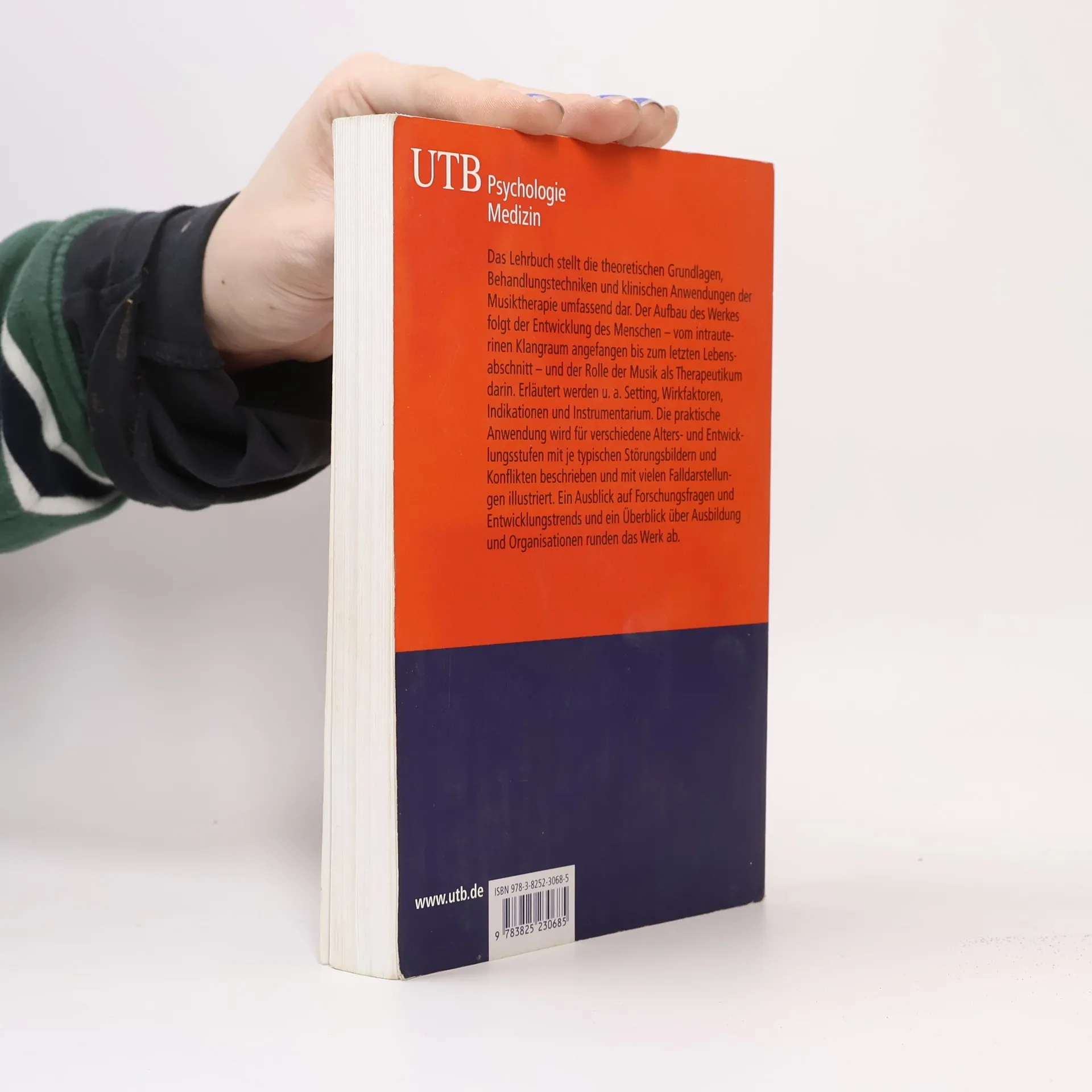 Das Lehrbuch stellt die theoretischen Grundlagen, Behandlungstechniken und klinischen Anwendungen der Musiktherapie umfassend dar. Der Aufbau des Werkes folgt der Entwicklung des Menschen - vom intrauterinen Klangraum angefangen bis zum letzten Lebensabschnitt - und der Rolle der Musik als Therapeutikum darin. Erläutert werden u. a. Setting, Wirkfaktoren, Indikationen und Instrumentarium. Die praktische Anwendung wird für verschiedene Alters- und Entwicklungsstufen mit je typischen Störungsbildern und Konflikten beschrieben und mit vielen Falldarstellungen illustriert. Ein Ausblick auf Forschungsfragen und Entwicklungstrends und ein Überblick über Ausbildung und Organisationen runden das Werk ab.