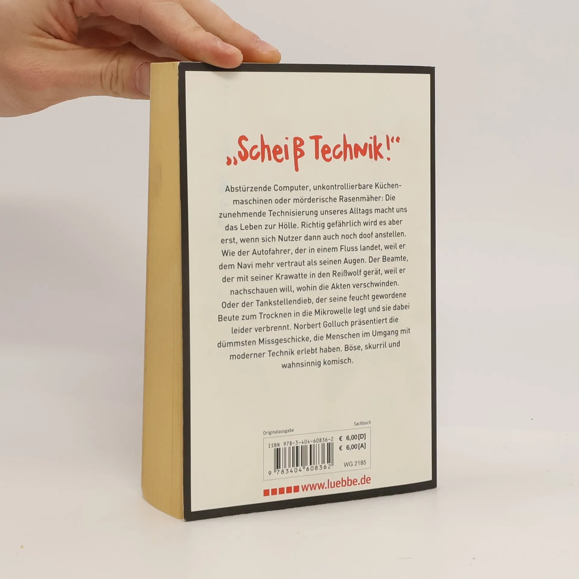 Scheiß Technik: Ein Autofahrer lässt sich von seinem Navi in den Fluss lenken. Ein gewissenhafter Beamter landet mit seiner Krawatte im Reißwolf. Und ein Rentner muss von der Feuerwehr befreit werden, weil er in die Fänge seines elektronischen Klappbetts gerät. Norbert Golluch präsentiert die dümmsten Missgeschicke, die Menschen im Umgang mit der modernen Technik erlebt haben. Was für eine Erleichterung, wenn man liest, dass sich andere Zeitgenossen genauso doof anstellen wie man selbst. Ein Buch für alle Technikhasser. Böse, skurril und wahnsinnig komisch.