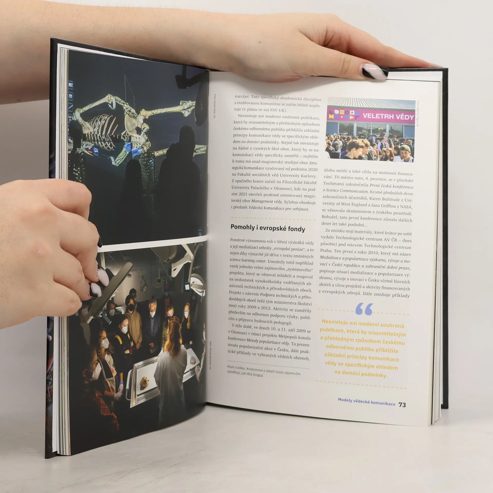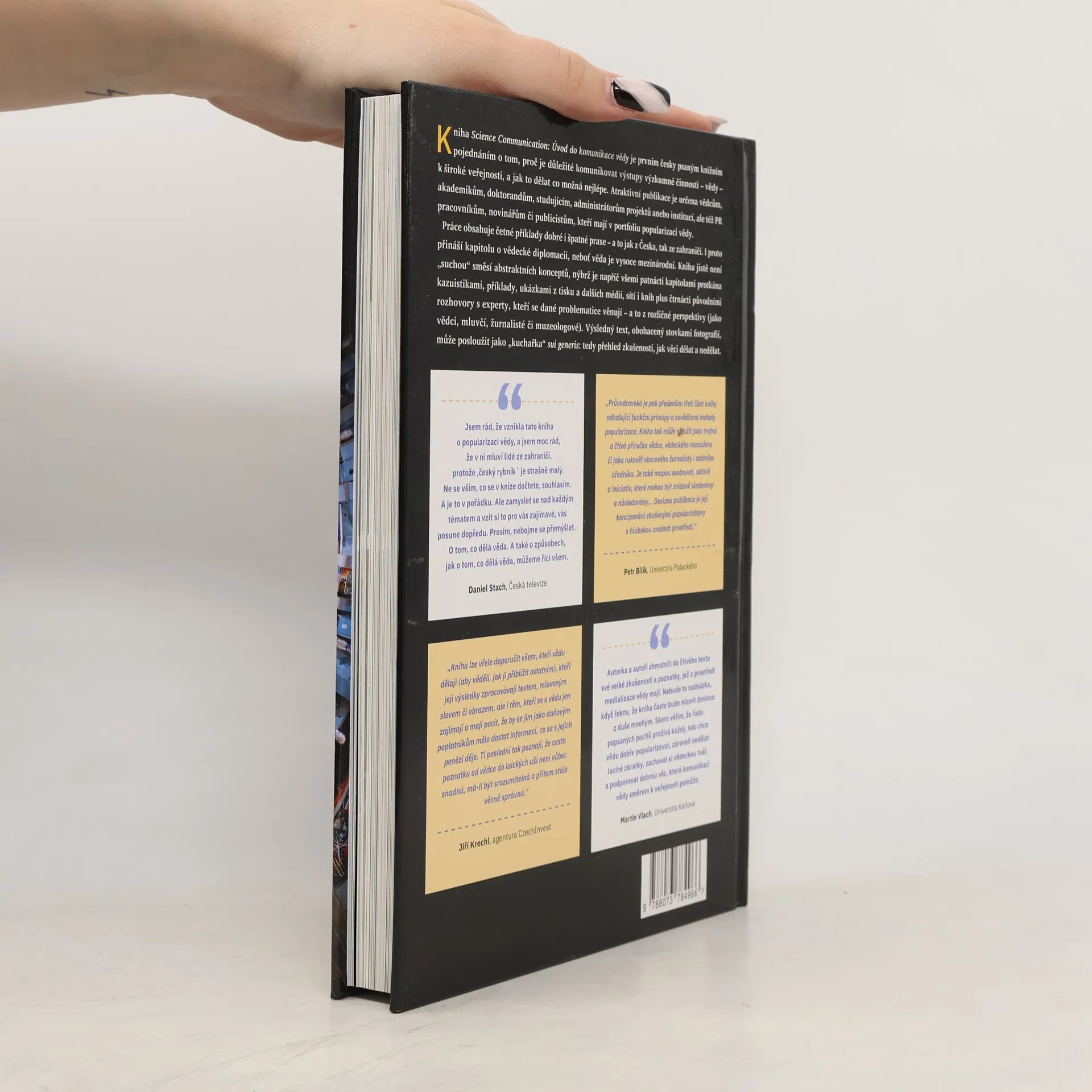 V českých výzkumných organizacích je čím dál tím více lidí, kteří si uvědomují, že komunikace vědy není pouze nějakou módní frází, ale naprostou nutností. Platí zde totiž stejně jako v jiných oblastech lidské činnosti – když o sobě nebudete dávat vědět, tak o vás zkrátka nikdo vědět nebude. Komunikace vědy se i v Česku postupně stává zajímavým a přitažlivým oborem. Kniha s předmluvou známého popularizátora vědy Daniela Stacha odráží skutečnost, že komunikovat vědecké výstupy lze hned na několika různých úrovních: na úrovni individuálního vědce, dále na úrovni dané instituce, její součásti či projektu a ovšem také na úrovni většího územního celku – regionu, národního státu, popřípadě sdružení států (typu Evropské unie). Kniha je rozdělena do patnácti kapitol tak, aby se kniha dala číst celá, od začátku do konce, jako jeden „příběh komunikace vědy“. Cílem nebylo napsat vrcholné akademické dílo plné (nudných) teorií, pouček a abstraktních konceptů. Autoři se snažili o vskutku praktický a užitečný návod, za kterým jsou dekády zkušeností z různých oblastí vědy, výzkumu a médií. Proto je kniha protkána konkrétními příklady dobré, ale i špatné praxe ze všech uvedených úrovní – a to jak z Česka, tak ze zahraničí.
