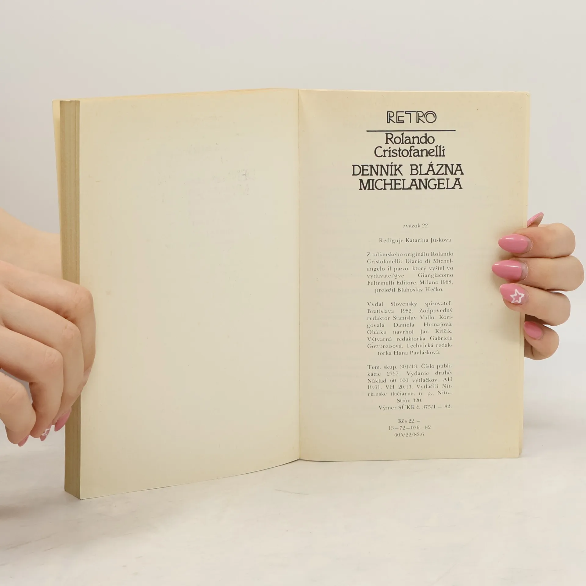 O veľkom renesančnom maliarovi, sochárovi, architektovi a básnikovi Michelangelovi jestvuje naozaj veľa životopisov. Cristofanelliho Denník pocháb-ľa Michelangela sa však vymyká z bežného rámca toho, čo bolo o tomto umelcovi doposiaľ napísané. Autor nám tu vo forme fiktívneho denníka, fingovaných zápiskov, ktoré mohol napísať sám umelec, nielen dokresľuje túto veľkú osobnosť, ale usiluje sa zároveň, pravdaže, na základe štúdia archívnych materiálov, preniknúť aj do jeho intimity ľudskej i umeleckej. Doba, v ktorej Michelangelo žil a tvoril, bola, ako je známe, veľmi búrlivá, plná zmätkov i nádejí. No a Cristofanelli nám predstavuje v nej Michelangela ako človeka práve tak hlboko milujúceho ľud ako umenie, o slobodu ľudu aj umenia zá-pasiaceho a víťaziaceho. Z tohto hľadiska kritizuje nielen florentských tyranov a pápežov, ale aj Savonarolu, Leonarda, Rafaela, vôbec všetko, čo prekáža človeku v slobodnom živote a v úsilí o orginálny, svojrázny a svojský umelecký výraz. Je pozoruhodné, ako prirodzene vie autor udržiavať našu zvedavosť, aj udržiavať nás v napätí, hoci sa pohybuje v hĺbkach duše génia a kráča po vrcholoch jeho tvorivých zápasov. Z tohto hľadiska nastavil zrkadlo nielen umeleckej renesancii, ale aj životu ľudí v nej. Preto je toto dielo nielen zaujímavé, ale aj poučné. Vydanie druhé