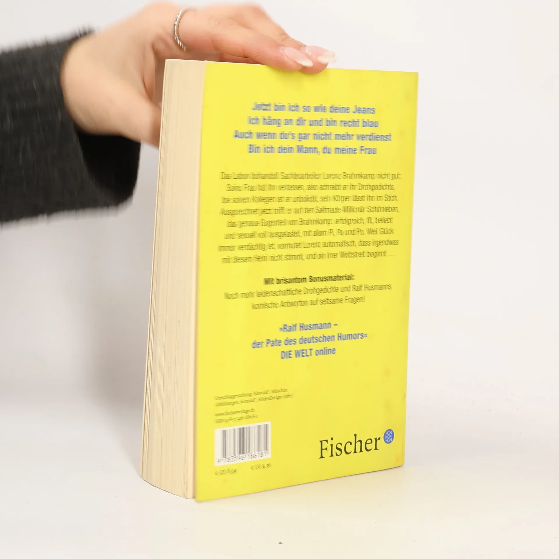 Jetzt bin ich so wie deine Jeans Ich häng an dir und bin recht blau Auch wenn du’s gar nicht mehr verdienst Bin ich dein Mann, du meine Frau Das Leben behandelt Sachbearbeiter Lorenz Brahmkamp nicht gut – vielleicht als Quittung dafür, dass er es häufig mit der Wahrheit nicht so genau nimmt: Seine Frau hat ihn verlassen, also schreibt er ihr Drohgedichte, bei seinen Kollegen ist er unbeliebt und tut alles dafür, dass das so bleibt, sein Körper lässt ihn vermehrt im Stich, aber er wird keinesfalls mit Sport oder gesunder Ernährung gegensteuern. Ausgerechnet jetzt trifft er auf den Selfmade-Millionär Alexander Schönleben. Der Mann ist das genaue Gegenteil von Lorenz: erfolgreich, fit, beliebt und sexuell voll ausgelastet, mit allem Pi, Pa und Po. Weil Glück immer verdächtig ist, vermutet Lorenz automatisch, dass irgendwas mit diesem Schönleben ganz und gar nicht stimmt, und plötzlich steht der renitente Sachbearbeiter aus Osthofen vor einer Entscheidung, die sein Leben völlig auf den Kopf stellen kann … »Ralf Husmann – der Pate des deutschen Humors« Die Welt online Taschenbuch mit brisantem Bonusmaterial! Nie dagewesene Drohgedichte und Exklusivinterview: Ralf Husmann gibt komische Antworten auf seltsame Fragen …