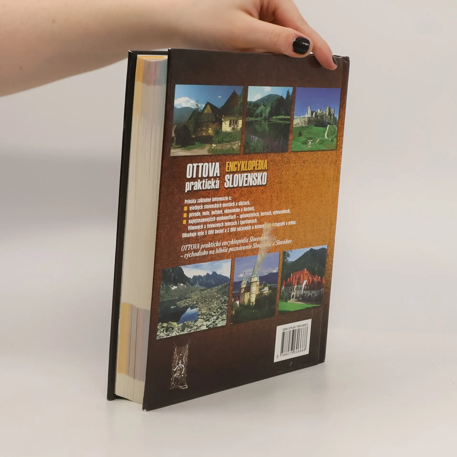 OTTOVA praktická encyklopédia SLOVENSKO vychádza z databázy hesiel vytvorených odborníkmi z vysokých škôl a kultúrnych pracovísk Slovenskej republiky. Obsahuje vyše 5 000 hesiel a približne 2 000 fotografií, vrátane portrétov a erbov. Encyklopédia ponúka základné údaje o všetkých slovenských mestách a obciach, ako sú poloha, počet obyvateľov a vzdialenosť od Bratislavy, ako aj významné archeologické nálezy a historické udalosti. Zohľadňuje aj osobnosti, ktoré sa v týchto lokalitách narodili alebo pôsobili. Historické heslá objektívne mapujú dôležité míľniky a predstavujú aj kontroverzné osobnosti a udalosti. V oblasti kultúry sú zahrnuté najvýznamnejšie osobnosti ako spisovatelia, herci, výtvarníci, hudobníci, filmoví a televízni tvorcovia, tanečníci a športovci. Encyklopédia tiež obsahuje informácie o najdôležitejších slovenských inštitúciách a stručne charakterizuje demografický a územný vývoj, ekonomiku, priemysel, poľnohospodárstvo a školstvo. Veríme, že táto encyklopédia bude cenným pomocníkom pri hľadaní informácií a rýchlej orientácii v základných poznatkoch o Slovensku.