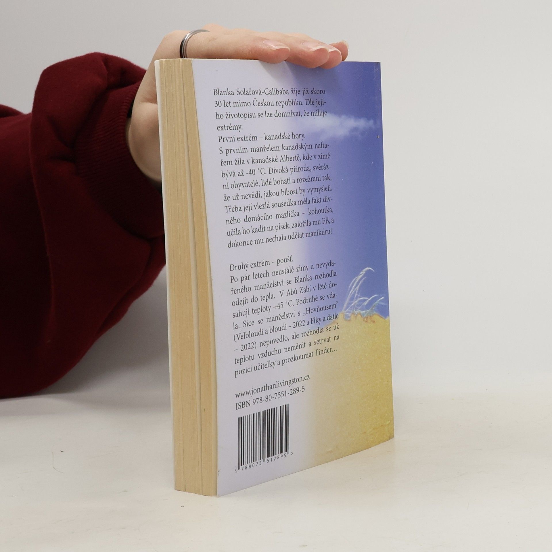 Pokračování nevážně autobiografických vyprávění české autorky, žijící v Spojených arabských emirátech i po dalším nevydařeném zahraničním manželství... Blanka Solařová-Calibaba žije již skoro třicet let mimo Českou republiku. Dle jejího životopisu se lze domnívat, že miluje extrémy. S prvním manželem kanadským naftařem žila v kanadské Albertě, kde v zimě bývá až mínus 40 C°. Divoká příroda, svérázní obyvatelé, lidé bohatí a rozežraní tak, že už nevědí, jakou blbost by vymysleli. Třeba její vlezlá sousedka měla fakt divného domácího mazlíčka - kohoutka, učila ho kadit na písek, založila mu FB, a dokonce mu nechala udělat manikúru! Po pár letech neustálé zimy a nevydařeného manželství se Blanka rozhodla odejít do tepla. V Abú Zabí v létě dosahují teploty plus 45 C°. Podruhé se vdala. Sice manželství se s "Hovňousem" (popsané v knihách Velbloudi a bloudi a Fíky a datle) nepovedlo, ale rozhodla se už teplotu vzduchu neměnit, setrvat na pozici učitelky a prozkoumat Tinder... Nakladatelská anotace. Kráceno.