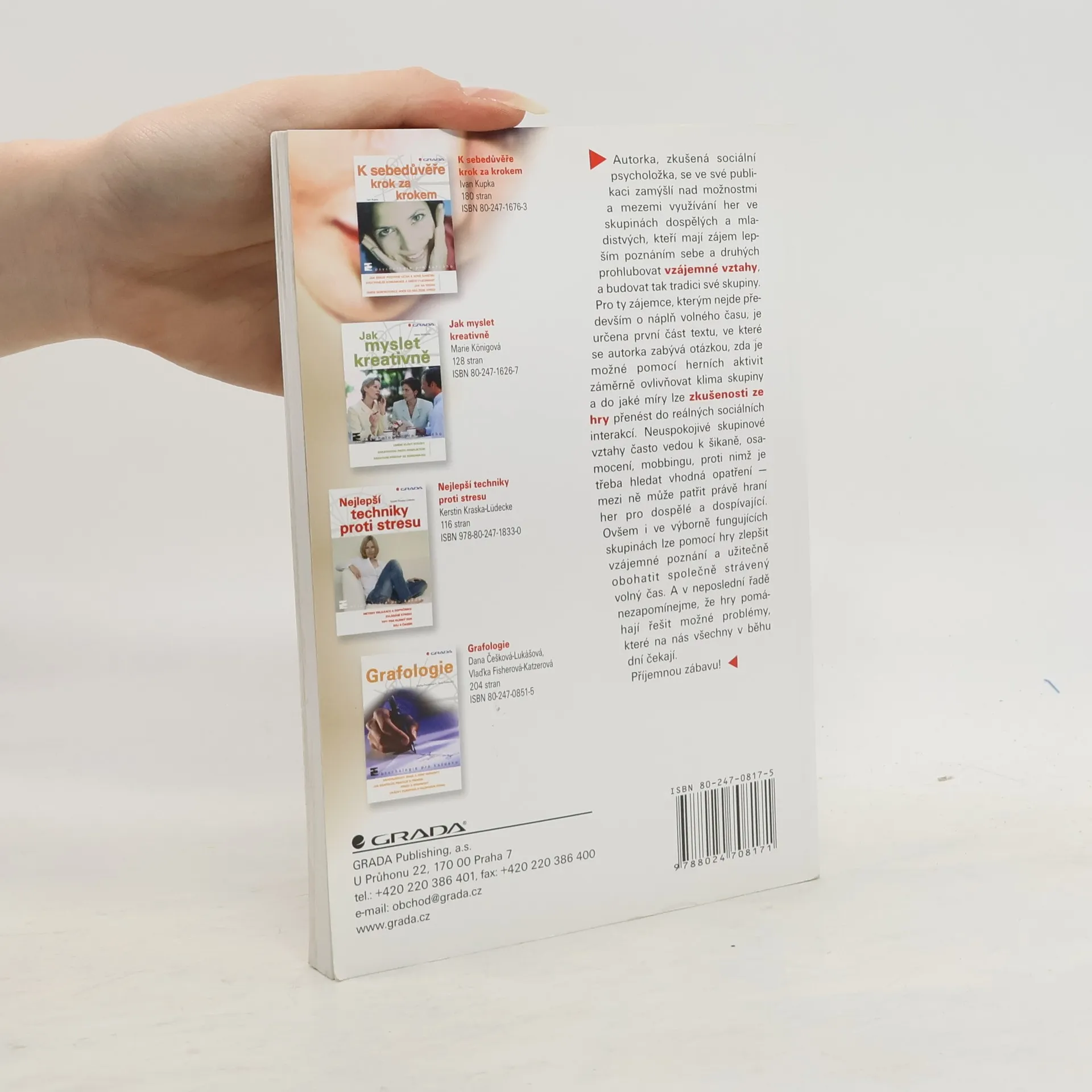 Publikace naší přední sociální psycholožky prezentuje hry, kterých lze využít k výcviku a rozvoji sociálních dovedností. Kniha je koncipována jako sborník interakčních her a her pro rozvoj skupiny, úvodní kapitola poskytuje nezbytný teoretický vhled do dané tematiky, v závěru autorka vybízí k reflexi herních aktivit ve skupině. Kniha je určena skupinám přátel, studentům různých oborů společenských věd, učitelům a vedoucím zájmových skupin, ti všichni v ní naleznou inspiraci pro obohacení společně stráveného času, kultivaci mezilidských vztahů a prohloubení vzájemného poznání.