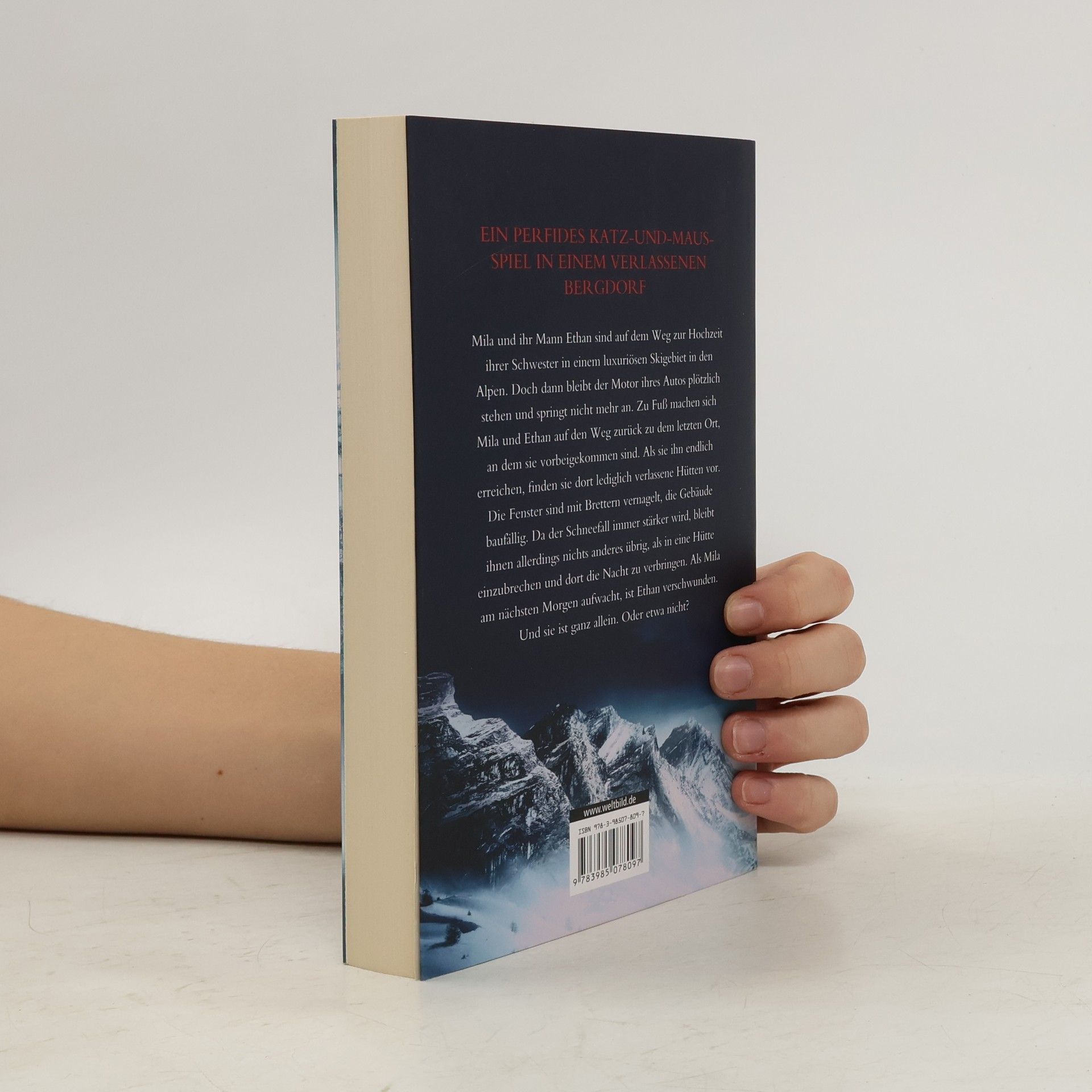 Ein perfides Katz-und-Maus-Spiel in einem verlassenen Bergdorf Mila und ihr Mann Ethan sind auf dem Weg zur Hochzeit ihrer Schwester in einem luxuriösen Skigebiet in den Alpen. Doch dann bleibt ihr Mietwagen plötzlich stehen und springt nicht mehr an. Zu Fuß machen sich Mila und Ethan auf den Weg zurück zu dem letzten Ort, an dem sie vorbeigekommen sind. Als sie ihn endlich erreichen, finden sie dort lediglich verlassene Hütten vor. Da der Schneefall immer stärker wird, bleibt ihnen nichts anderes übrig, als in eine Hütte einzubrechen und dort die Nacht zu verbringen. Als Mila am nächsten Morgen aufwacht, ist Ethan verschwunden. Und sie ist ganz allein. Oder etwa nicht? Denn schon bald nimmt sie dunkle Schatten zwischen den Bäumen wahr ...