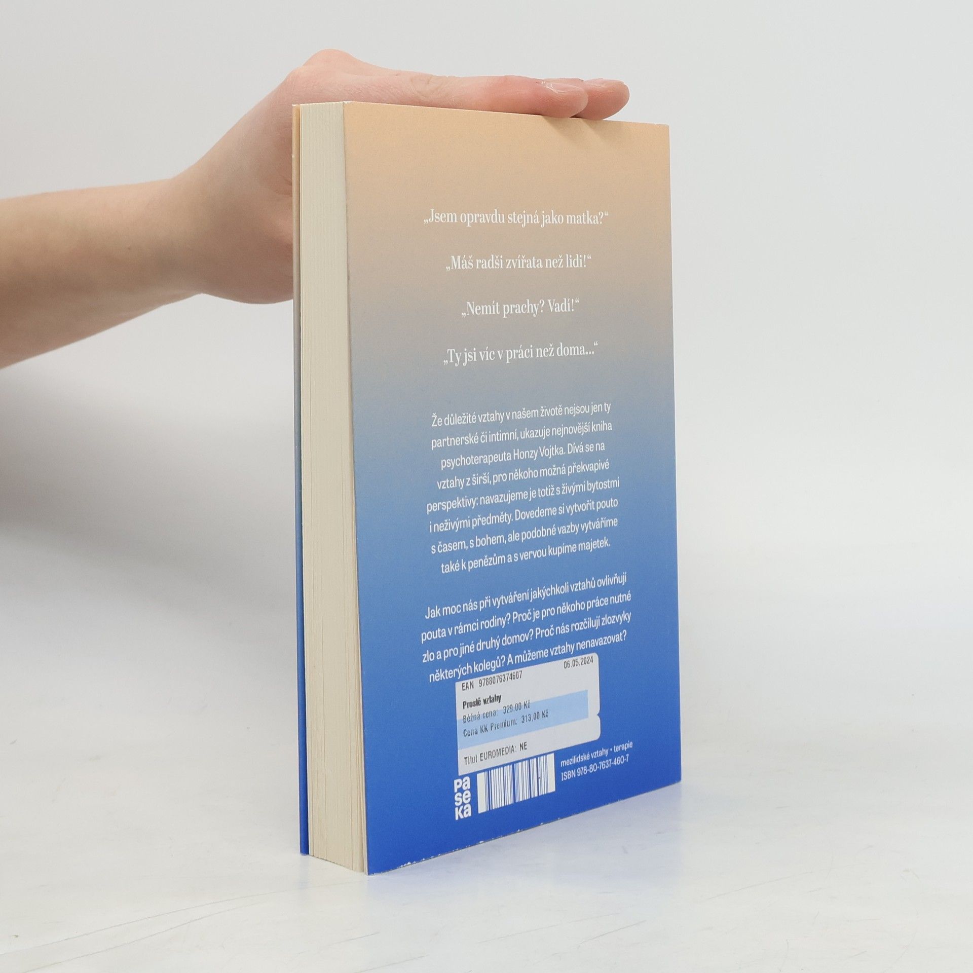 „Jsem opravdu stejná jako matka? „Máš radši zvířata než lidi! „Nemít prachy? Vadí! „Ty jsi víc v práci než doma Že důležité vztahy v našem životě nejsou jen ty partnerské či intimní, ukazuje nejnovější kniha psychoterapeuta Honzy Vojtka. Dívá se na vztahy z širší, pro někoho možná překvapivé perspektivy: navazujeme je totiž s živými bytostmi i neživými předměty. Dovedeme si vytvořit pouto s časem, s bohem, ale podobné vazby vytváříme také k penězům a s vervou kupíme majetek. Jak moc nás při vytváření jakýchkoliv vztahů ovlivňují pouta v rámci rodiny? Proč je pro někoho práce nutné zlo a pro jiné druhý domov? Proč nás rozčilují zlozvyky některých kolegů? A můžeme vztahy nenavazovat?