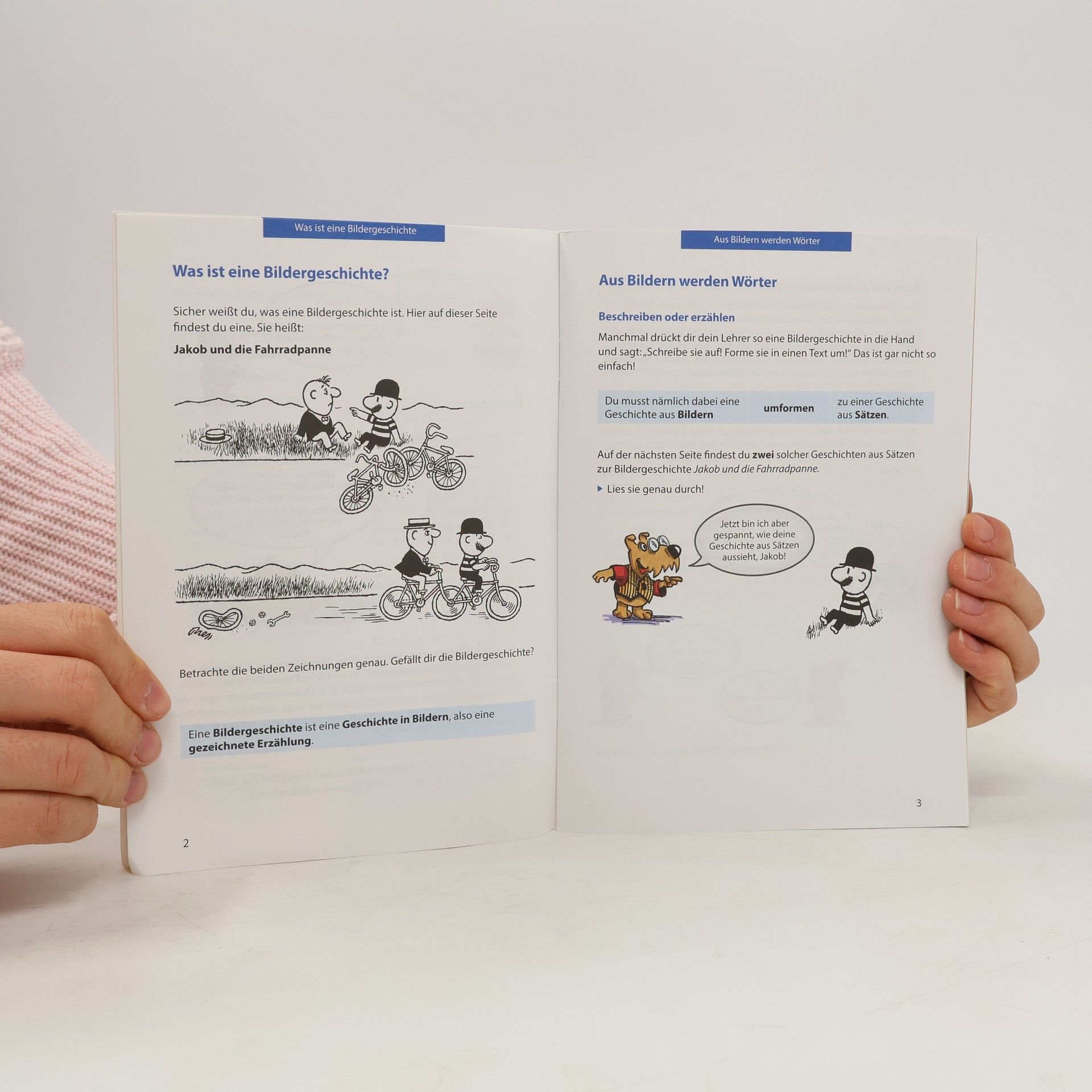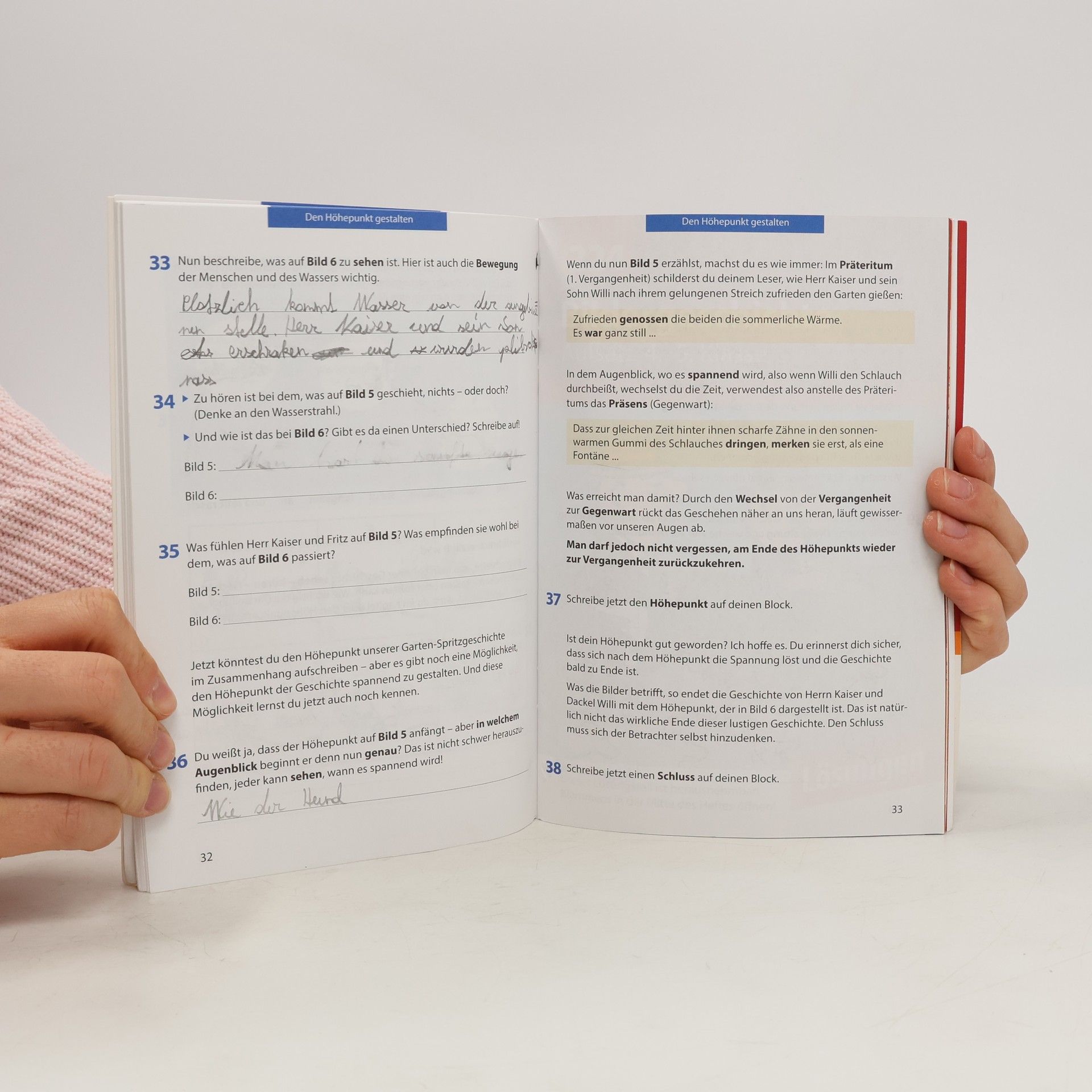 Was macht eine gute Bildergeschichte aus? Wie werden aus Bildern Wörter und Sätze? Und wie baue ich meine Erzählung sinnvoll auf? Diese Lernhilfe klärt alle Fragen rund um das Thema Bildergeschichte. Viele unterschiedliche Aufgaben motivieren die Schüler zum eigenen Schreiben und zeigen sinnvolle Vorgehensweisen auf. Das langsam ansteigende Niveau der Aufgaben bietet immer wieder neue Herausforderungen und ermöglicht den Einsatz der Lernhilfe von der 4. bis zur 5. Klasse. Am Ende des Heftes warten 4 unterschiedliche Bildergeschichten, anhand derer die Kinder das Gelernte anwenden können. Der Lösungsteil bietet hierzu Musteraufsätze, die nochmals eine klar strukturierte Bildergeschichte verdeutlichen.