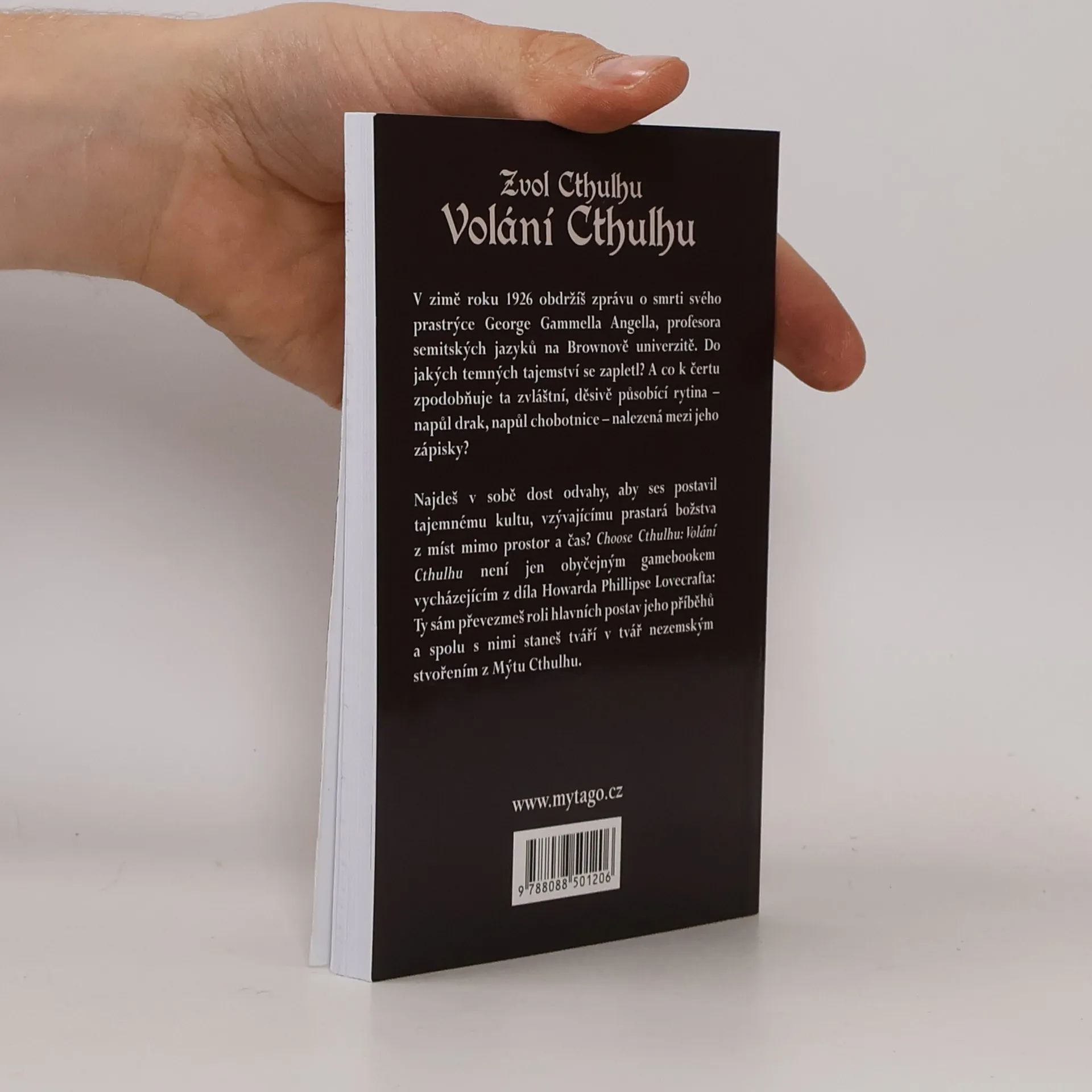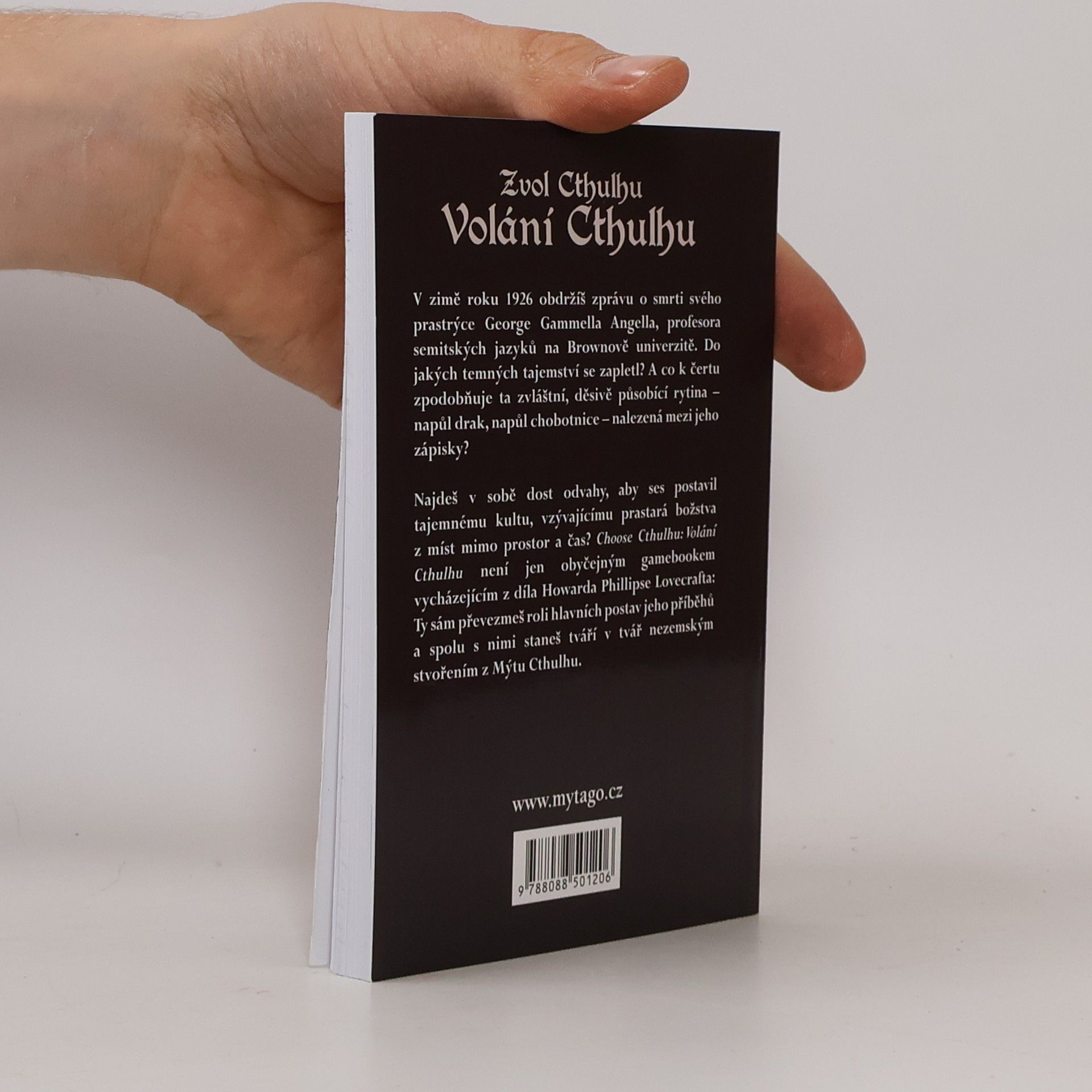 V zimě roku 1926 obdržíš zprávu o smrti svého prastrýce George Gammella Angella, profesora semitských jazyků na Brownově univerzitě. Do jakých temných tajemství se zapletl? A co k čertu zpodobňuje ta zvláštní, děsivě působící rytina – napůl drak, napůl chobotnice – nalezená mezi jeho zápisky? Najdeš v sobě dost odvahy, aby ses postavil tajemnému kultu, vzývajícímu prastará božstva z míst mimo prostor a čas? Choose Cthulhu: Volání Cthulhu není jen obyčejným gamebookem vycházejícím z díla Howarda Phillipse Lovecrafta: Ty sám převezmeš roli hlavních postav jeho příběhů a spolu s nimi staneš tváří v tvář nezemským stvořením z Mýtu Cthulhu.