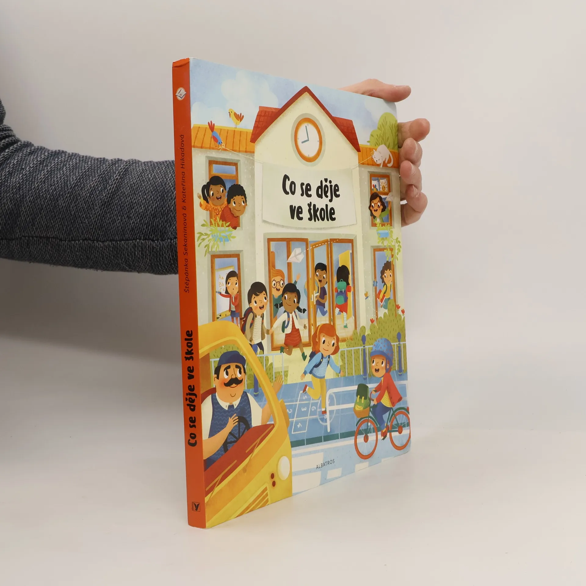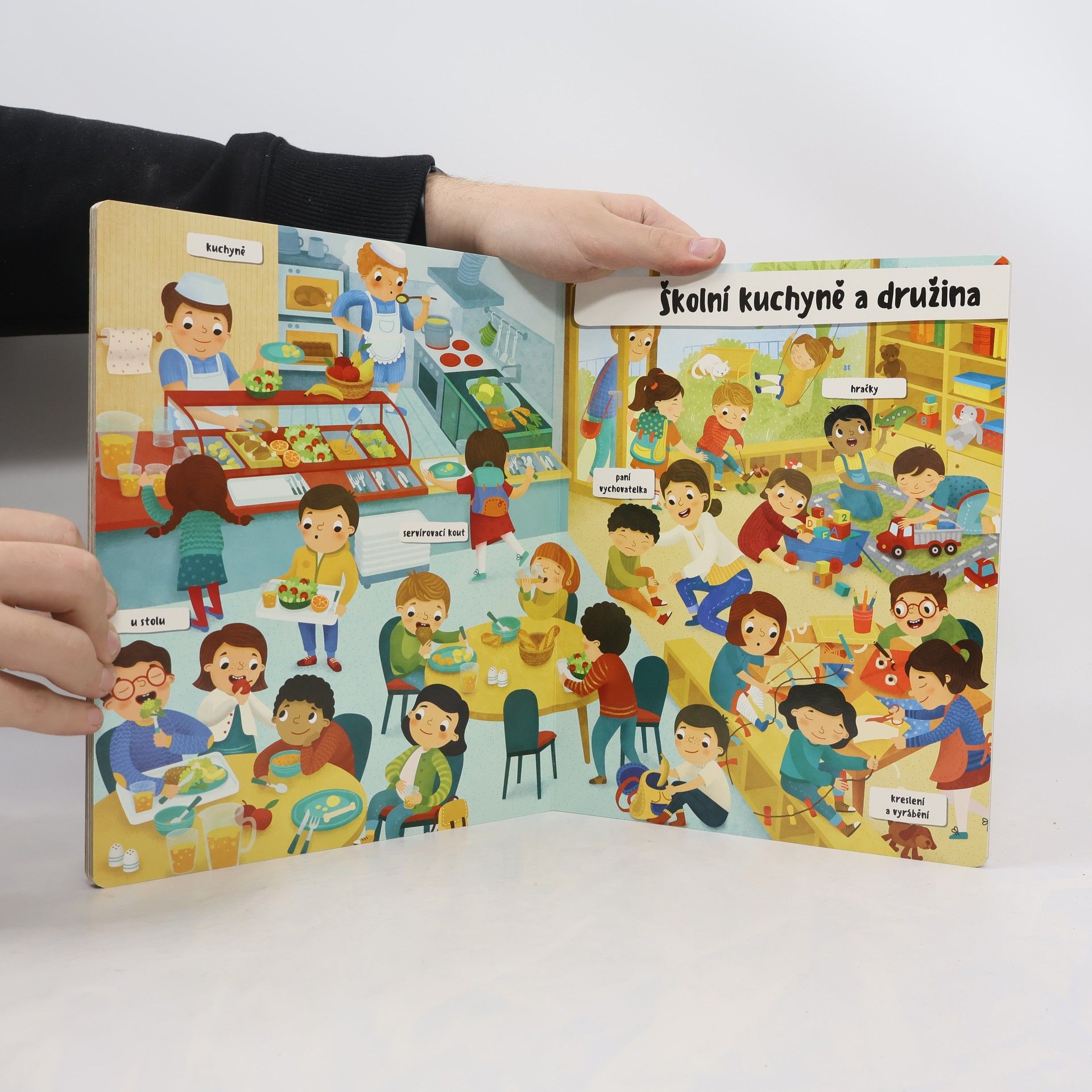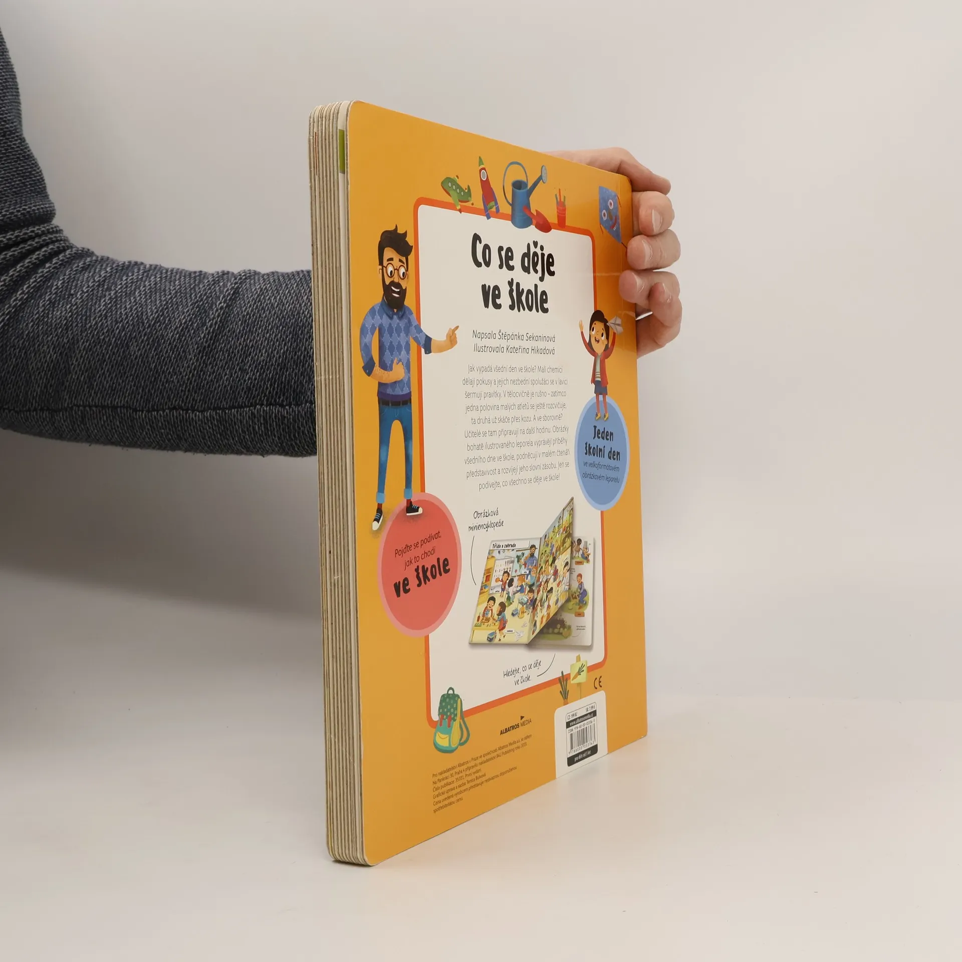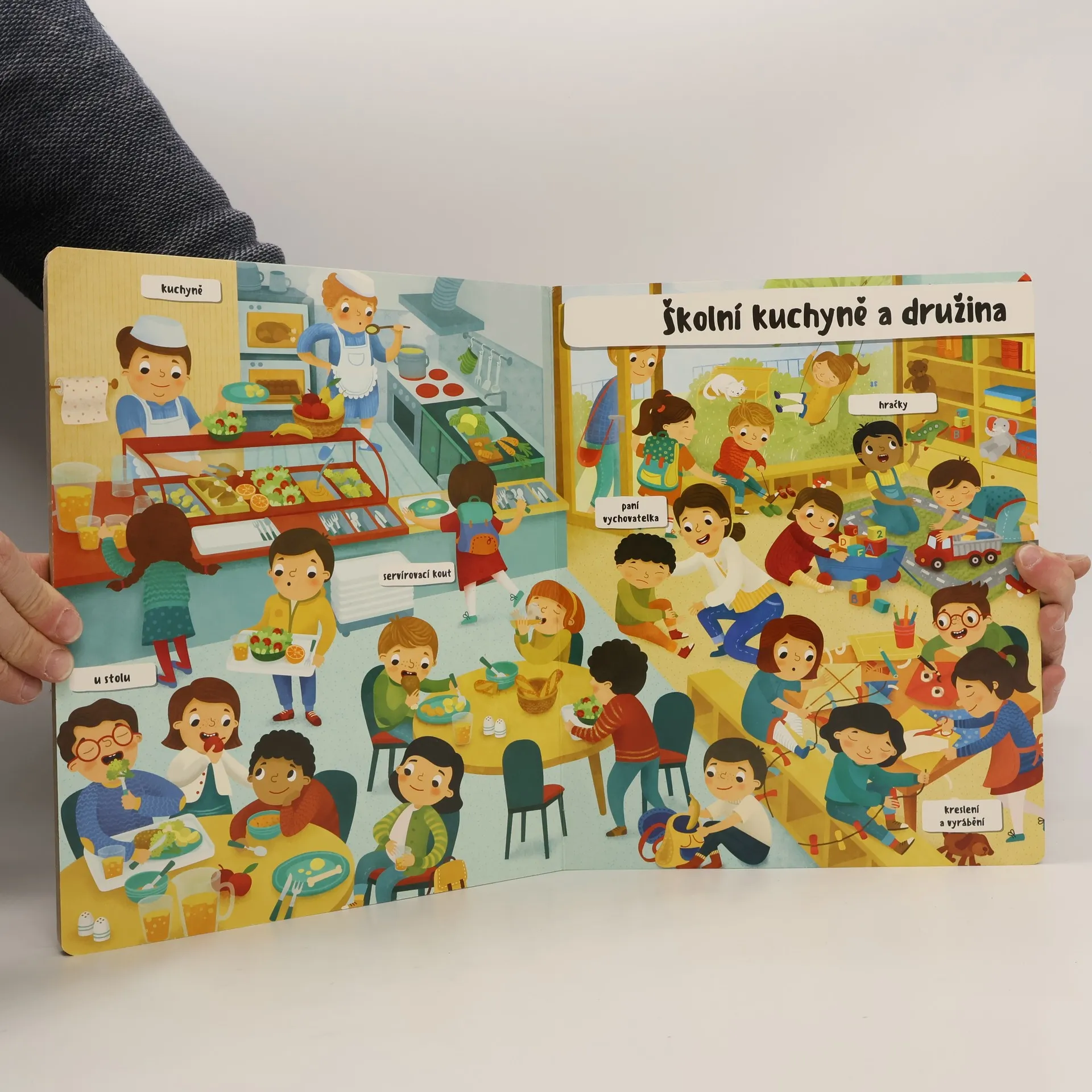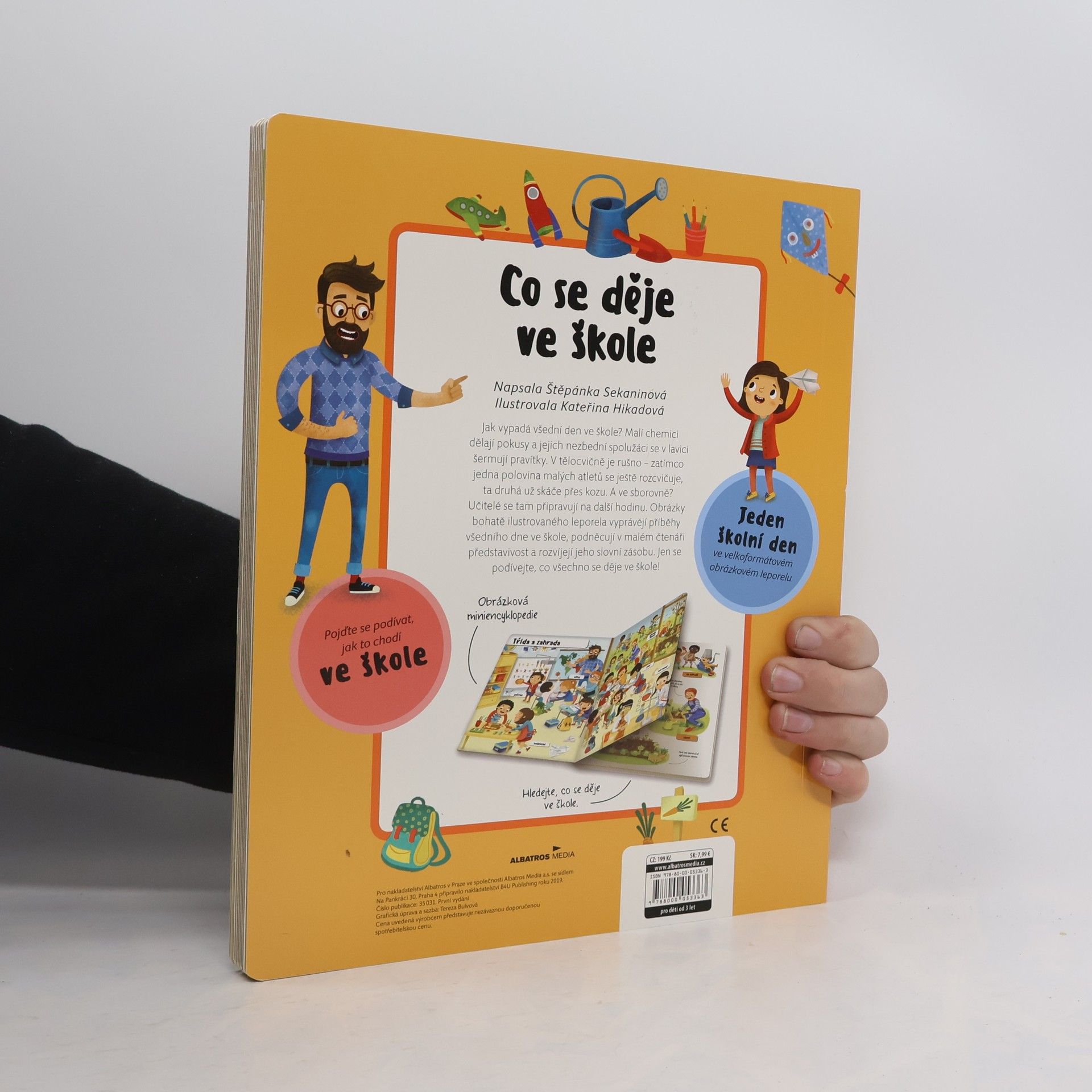Jak vypadá všední den ve škole? Malí chemici dělají pokusy a jejich nezbední spolužáci se v lavici šermují pravítky. Venku na zahradě děti hrabou listí a paní učitelka jim ukazuje, jak sázet rostlinu do země. Obrázky, které vyprávějí příběhy všedního dne ve škole, podněcují v malém čtenáři představivost a pomáhají mu rozvíjet slovní zásobu.