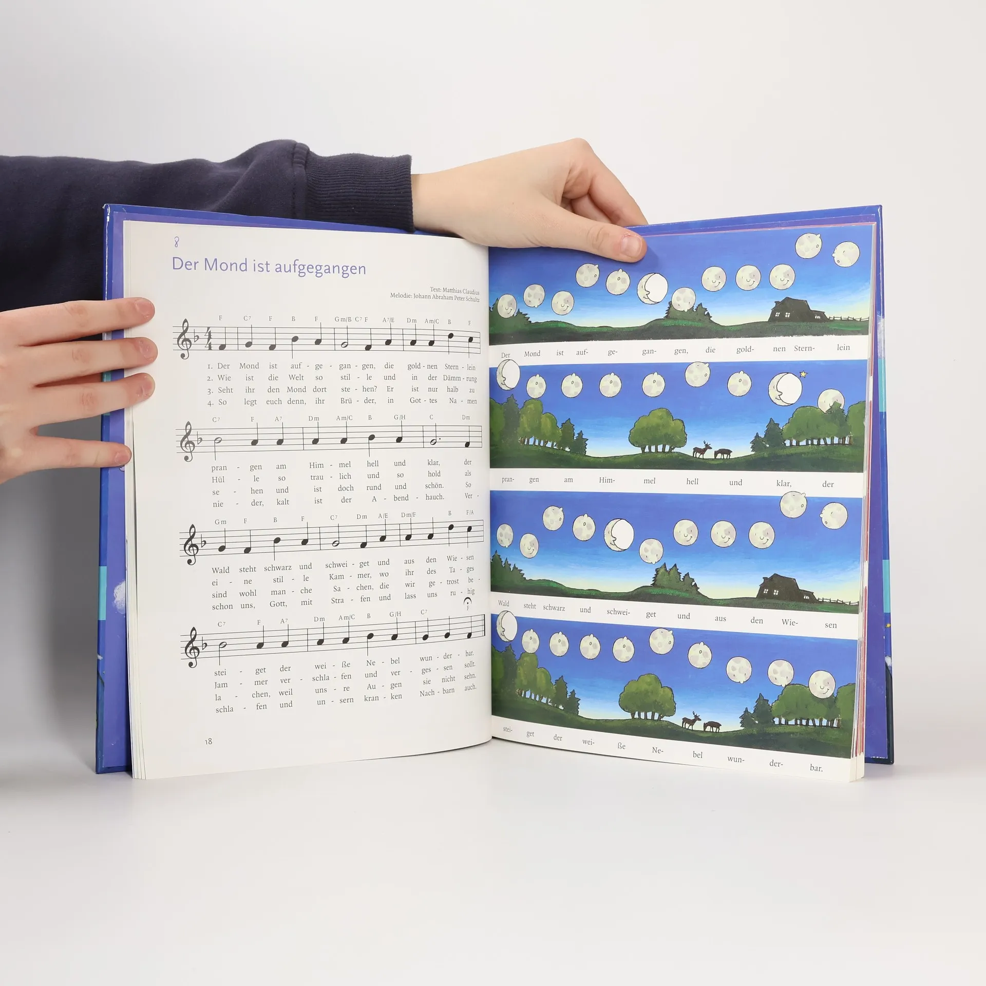 Von Siebenschläfern, Sandmännchen und schlafenden Wäldern: Traumhafte Gutenachtlieder mit Bildernoten. 31 große Farbtafeln und zahlreiche Vignetten mit einfachen Notensätzen und Gitarrengriffen. Alle Eltern kennen das: Immer wenn Kinder schlafen sollen, sind sie überhaupt nicht müde. Es ist für sie sehr beruhigend, wenn Eltern ihnen dann ein Gutenachtlied vorsingen. Dieses Liederbuch enthält die schönsten und bekanntesten Schlaflieder, dazu moderne Lieder von Fredrik Vahle, Bernd Kohlhepp und Jürgen Treyz, Dorothée Kreusch-Jacob u. a. Die farbenfrohen Bildernoten laden zum Schauen ein, denn dank der lustigen Figuren lassen sich die Melodien spielerisch verfolgen. Mitsingen wird kinderleicht – für Kinder und Erwachsene. Aus dem Inhalt: Abendstille • Aber heidschi, bum beidschi • Ade zur guten Nacht • Das Sandmännchen ist da • Die Blümelein, sie schlafen • Guten Abend, gut’ Nacht • Guter Mond, du gehst so stille • La-le-lu • Müde bin ich, geh zur Ruh • Sultans Schlummerlied • Zauberlied gegen böse Träume und viele andere.