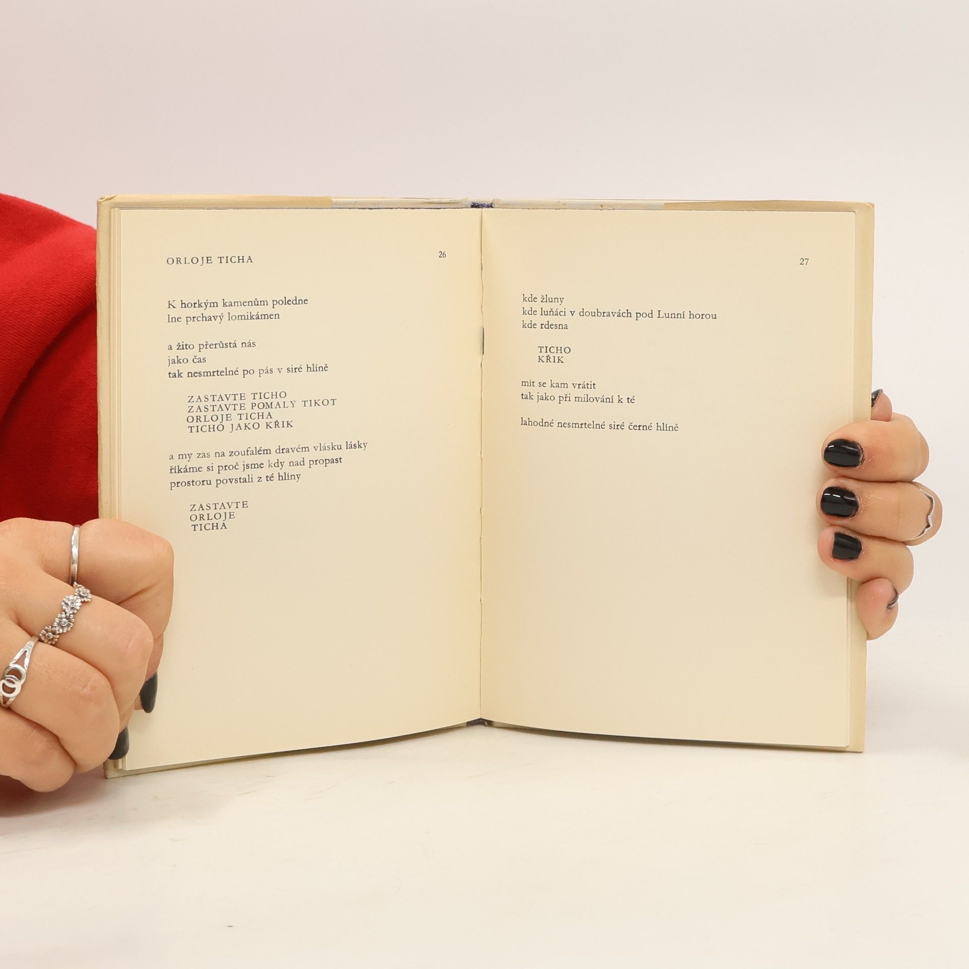 Sbírka rýmovaných i volných veršů s charakteristickými otázkami, zámlkami a nápověďmi a s asociační technikou obsahuje milostnou a přírodní lyriku i zamyšlení nad „chladnou“ současností (Věky se tisknou k tvému rameni ... / Potopy, války, hladomory. / Pořád pád náhrobního kamení /z vrcholu vytoužené hory, / poryvy hlíny: všude na zemi / rovy - ta křivda hlíny / létu.).