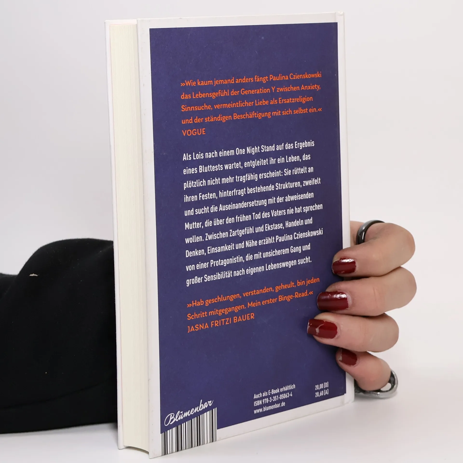 „Wie kaum jemand anderes fängt Paulina Czienskowski das Lebensgefühl der Generation Y zwischen Anxiety, Sinnsuche, vermeintlicher Liebe als Ersatzreligion und der ständigen Beschäftigung mit sich selbst ein.“ Vogue Als Lois nach einem One-Night-Stand auf das Ergebnis eines Bluttests wartet, entgleitet ihr ein Leben, das plötzlich nicht mehr tragfähig erscheint: Sie rüttelt an ihren Festen, hinterfragt bestehende Strukturen, zweifelt und sucht die Auseinandersetzung mit der abweisenden Mutter, die über den frühen Tod des Vaters nie hat sprechen wollen. Zwischen Zartgefühl und Ekstase, Handeln und Denken, Einsamkeit und Nähe erzählt Paulina Czienskowski von einer Protagonistin, die mit unsicherem Gang und großer Sensibilität nach dem eigenen Lebensweg sucht. „Hab geschlungen, verstanden, geheult, bin jeden Schritt mitgegangen. Mein erster Binge-Read.“ Jasna Fritzi Bauer „Wir glauben, die Welt ist gesund und wir sind krank. Dieses Buch bescheinigt uns das Gegenteil.“ Helene Hegemann