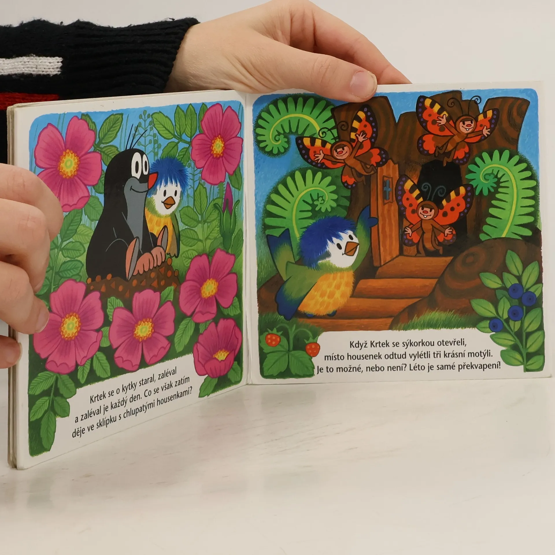 Krtek a malá sýkorka se stali nerozlučnými kamarády. V létě se radují ze zahrádky, ošetřují rostlinky, zalévají a mají radost, že zahrádka pěkně rozkvetla. Nestarají se však sami. Šťavnaté listy také náramně zachutnaly třem tlustým housenkám, a kdyby nebylo Krtka, všechno zelené by dočista okousaly a ze zahrádky by nezbylo nic. Jak si s nimi poradí, a jak to nakonec dopadne, si děti prohlédnou v leporelu Krtek a léto.