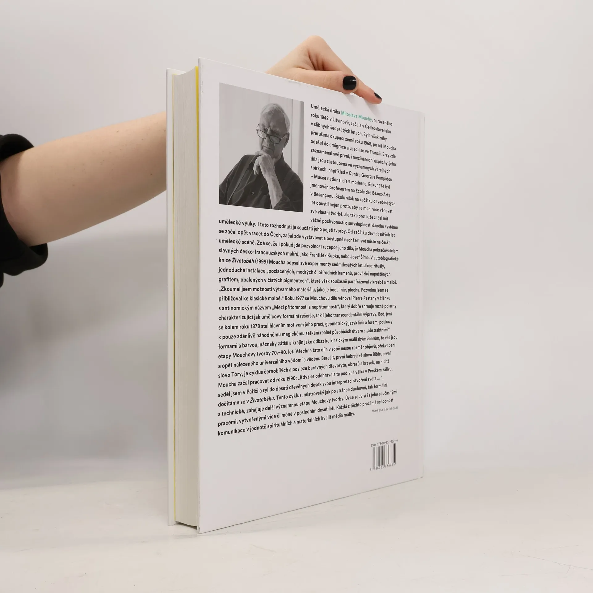 Obrazy – grafiky – objekty. Miloslav Moucha je světově uznávaný malíř, grafik a spisovatel. V této publikaci najdete jeho cestu od začátků v Litvínově přes emigraci do Paříže v roce 1968 a návrat do Čech po sametové revoluci až po nedávné lockdowny. Zároveň s tím mapuje cestu jeho tvorby, otázky, jimiž se jako umělec zabýval, a jeho inspirace: filozofii, geometrii a Bibli.