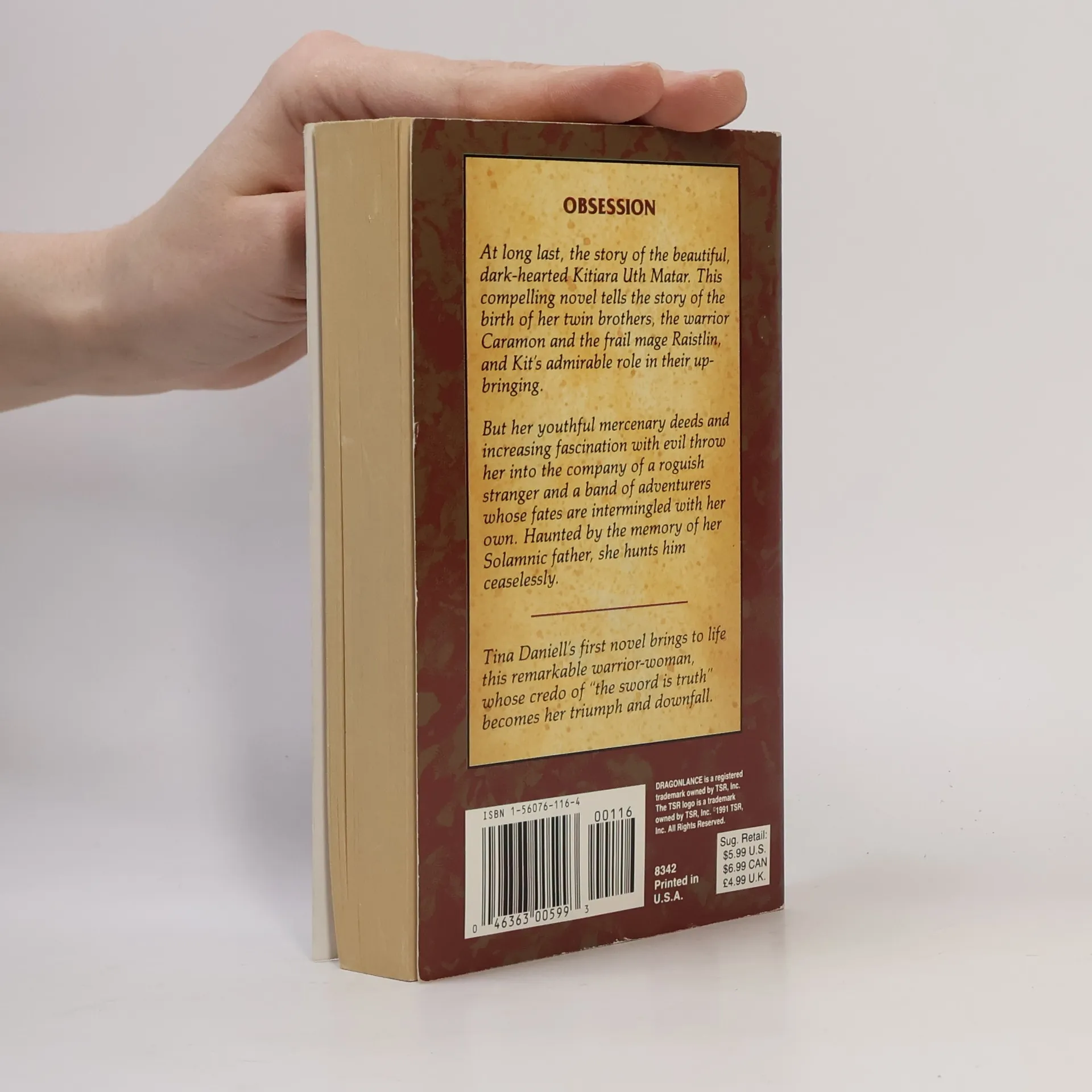 Obsession At long last, the story of the beautiful dark-hearted Kitiara Uth Matar. This compelling novel tells the story of the birth of her twin brothers, the warrior Caramon and the frail mage Raistlin, and Kit's admirable role in their upbringing. But her youthful mercenary deeds and increasing fascination with evil throw her into the company of a roguish stranger and band of adventurers whose fates are intermingled with her own. Haunted by the memory of her Solamnic father, she hunts him ceaselessly. Tina Daniell's first novel brings to life this remarkable warrior-woman, whose credo of "the sword is truth" becomes her triumph and downfall.