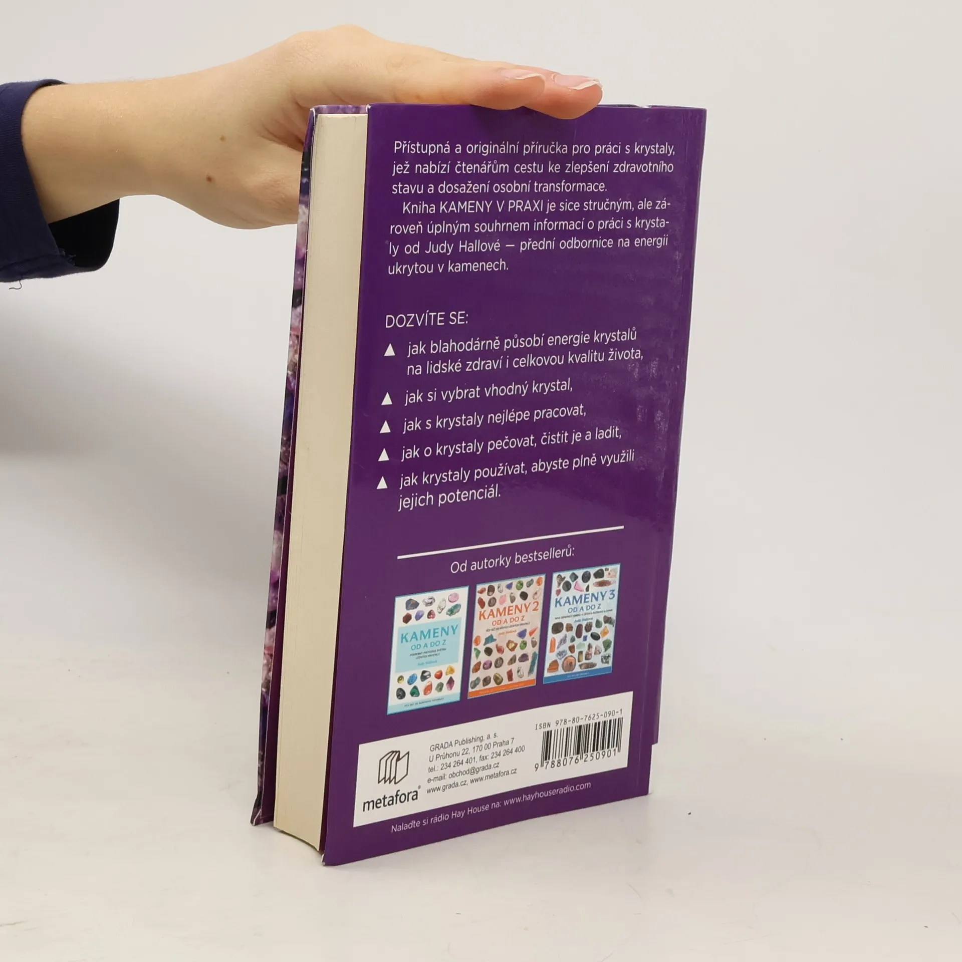 Judy Hallová na stránkách této knihy nabízí souhrn svých znalostí, což z publikace činí ideálního průvodce pro práci s krystaly, která je díky přístupnému a srozumitelnému výkladu vhodná i pro úplného začátečníka. Čtenáři se v této knize dozvědí komplexní informace o blahodárném působení energie krystalů na lidské zdraví i na celkovou kvalitu lidského života. Judy Hallová vysvětluje způsobem pochopitelným i pro začátečníky, jak s krystaly nejlépe pracovat, jak si vybrat vhodný krystal pro individuální použití, jak ho před zahájením práce očistit, jak kámen nabít energií a jak ho naladit. Kniha KAMENY V PRAXI je sice stručným, ale zároveň úplným souhrnem informací o práci s krystaly od přední odbornice na energii ukrytou v kamenech, která o hloubce svých znalostí již v minulosti přesvědčila čtenáře předchozích úspěšných knižních titulů.