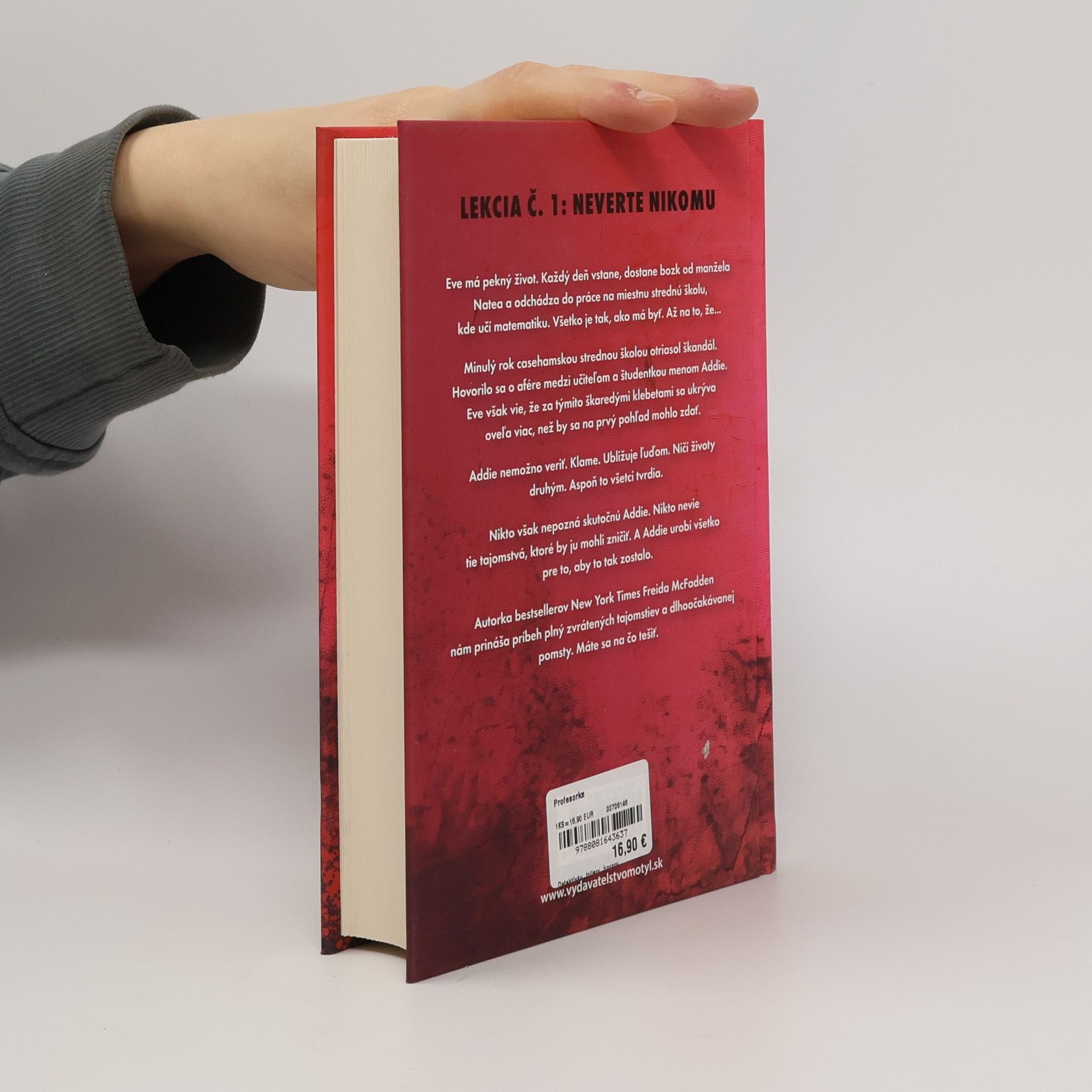 Eve má pekný život. Každý deň vstane, dostane bozk od manžela Natea a odchádza do práce na miestnu strednú školu, kde učí matematiku. Všetko je tak, ako má byť. Až na to, že... Minulý rok casehamskou strednou školou otriasol škandál. Hovorilo sa o afére medzi učiteľom a študentkou menomAddie. Eve však vie, že za týmito škaredými klebetami sa ukrýva oveľa viac, než by sa na prvý pohľad mohlo zdať. Addie nemožno veriť. Klame. Ubližuje ľuďom. Ničí životy druhým. Aspoň to všetci tvrdia. Nikto však nepozná skutočnú Addie. Nikto nevie tie tajomstvá, ktoré by ju mohli zničiť. A Addie urobí všetko pre to, aby to tak zostalo. Autorka bestsellerov New York Times Freida McFadden nám prináša príbeh plný zvrátených tajomstiev a dlho očakávanej pomsty. Máte sa na čo tešiť.