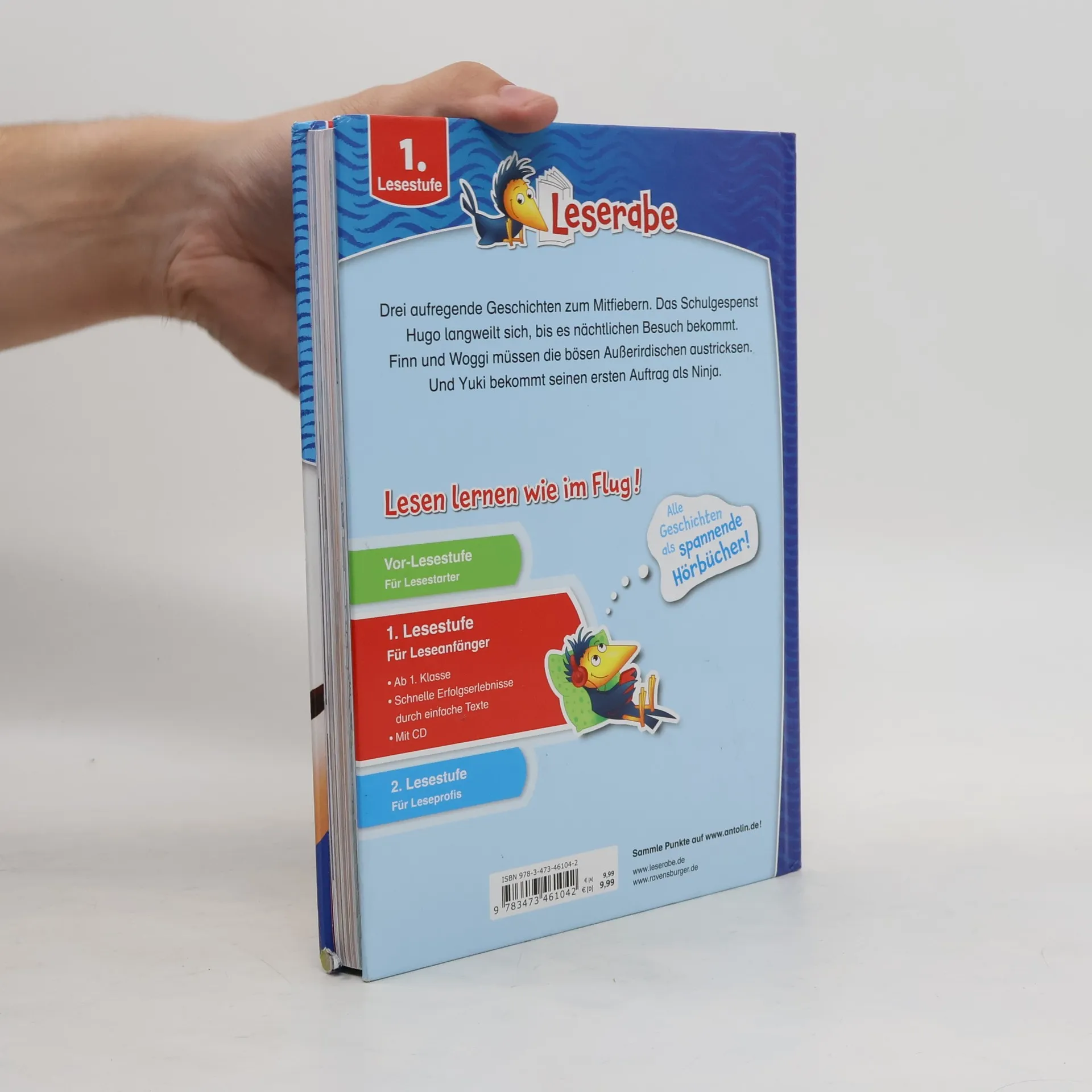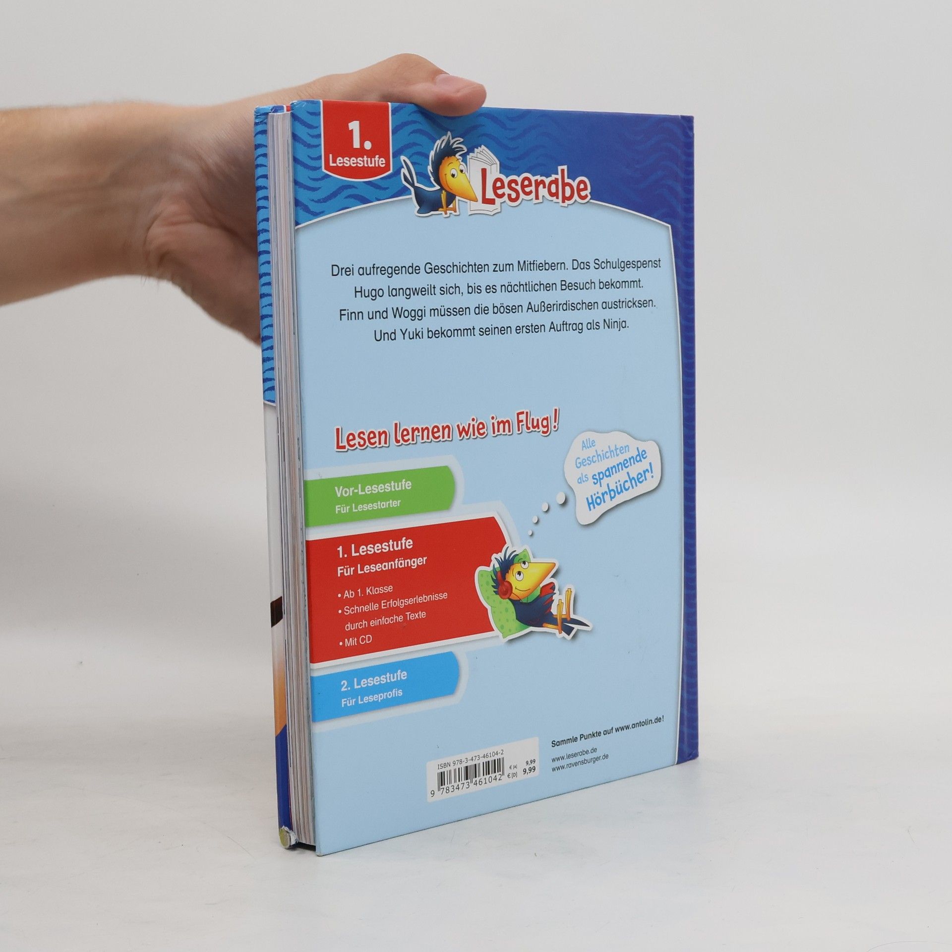 Die besten Abenteuergeschichten in einem Band! Zum Anhören und Mitlesen! Lesen lernen wie im Flug! Die Kinderbücher der Reihe Leserabe – 1. Lesestufe wurden mit Pädagogen entwickelt und richten sich an Leseanfänger ab der 1. Klasse. Kurze Texte in großer Fibelschrift sichern erste Leseerfolge und steigern die Lesekompetenz von Mädchen und Jungen ab 6 Jahren. Mit Belohnungsstickern. Empfohlen von Stiftung Lesen, gelistet bei Antolin. Weitere Informationen auf leserabe. de. Drei tolle Geschichten über Ninjas, Gespenster und Außerirdische in einem Band: Yuki ist ein Junge mit magischen Kräften. Nach einer Ausbildung zum Ninja wartet der erste gefährliche Auftrag auf Yuki: Er soll einen Feuerdrachen aus einem Kloster vertreiben! Gespenst Hogo lebt in einer Schule. Als Kinder im Schulhaus übernachten, kann Hugo gemeinsam mit Freund Willi endlich mal wieder so richtig spuken! Eine ganz besondere Lesenacht beginnt... Finn düst mit seinem Weltraumhund Woggi durchs Weltall, als die beiden von Außerirdischen angegriffen werden! Sie müssen auf einem Schrottplatz notlanden. Was sie dort wohl erwartet?