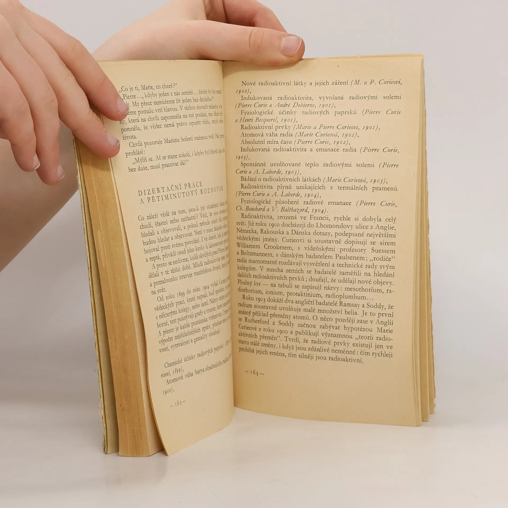 Životopisný román o objevitelce radioaktivity, vyšlý z pera její dcery. Je to psaný příběh o neobyčejné píli a houževnatosti ženy, která se stala objevitelkou světového jména, dvojnásobnou nositelkou Nobelovy ceny a řady jiných čestných titulů. Byla to dlouhá a krušná cesta, která jivedla z chudého a porobeného Polska do Paříže na sorbonskou univerzitu, kde se seznámila s Pierrem Curie, svým pozdějším manželem. Spolu v neuvěřitelných podmínkách udělali první ze svých velkých objevů - objev prvku radia. Po manželově smrti pokračovala sama v práci. Lhostejná k poctám a bohatství žila jen prací, věnovala se svým žákům a rodině, a v tomto ústraní také zemřela. 23-076-71