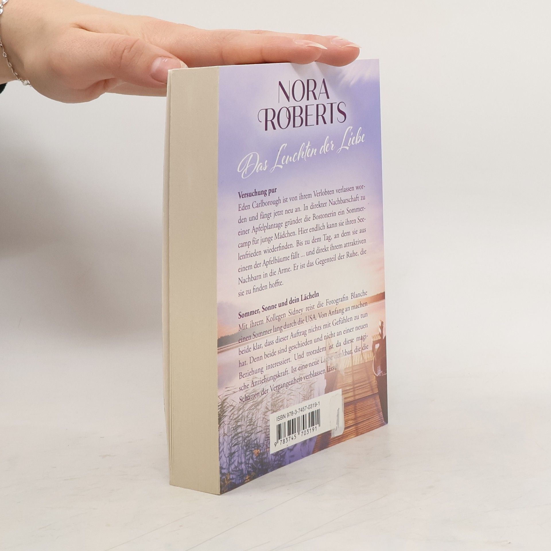 Versuchung pur Eden Carlborough ist von ihrem Verlobten verlassen worden und fängt jetzt neu an. In direkter Nachbarschaft zu einer Apfelplantage gründet die Bostonerin ein Sommercamp für junge Mädchen. Hier endlich kann sie ihren Seelenfrieden wiederfinden. Bis zu dem Tag, an dem sie aus einem der Apfelbäume fällt ... und direkt ihrem attraktiven Nachbarn in die Arme. Er ist das Gegenteil der Ruhe, die sie zu finden hoffte. Sommer, Sonne und dein Lächeln Mit ihrem Kollegen Sidney reist die Fotografin Blanche einen Sommer lang durch die USA. Von Anfang an machen beide klar, dass dieser Auftrag nichts mit Gefühlen zu tun hat. Denn beide sind geschieden und nicht an einer neuen Beziehung interessiert. Und trotzdem ist da diese magische Anziehungskraft. Ist eine neue Liebe denkbar, die die Schatten der Vergangenheit verblassen lässt? »Man kann Wunschträume leider nicht in Flaschen abfüllen. Aber Nora Roberts weiß genau, wie man sie zu Papier bringt.« New York Times »Die erfolgreichste Autorin auf dem Planeten Erde« Washington Post