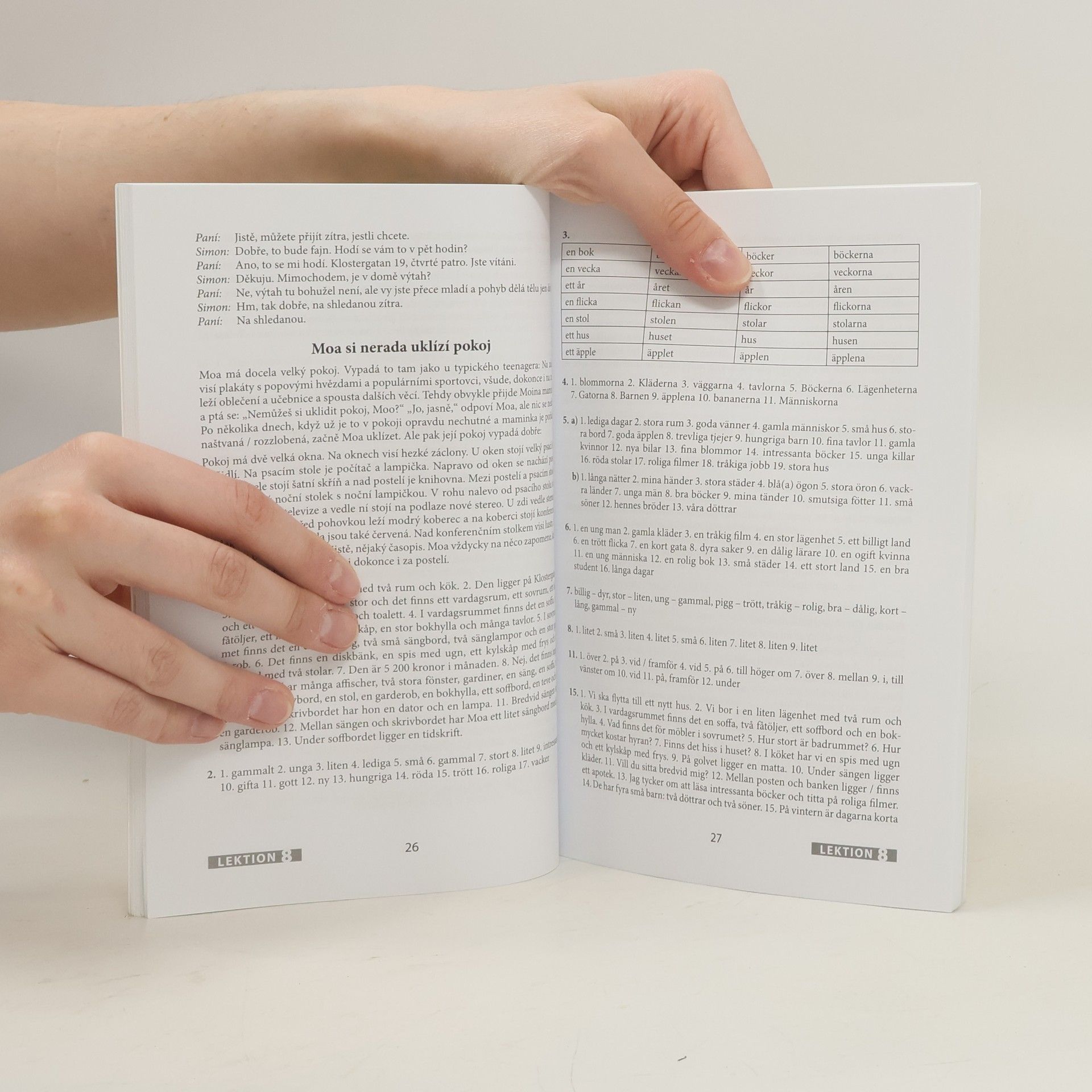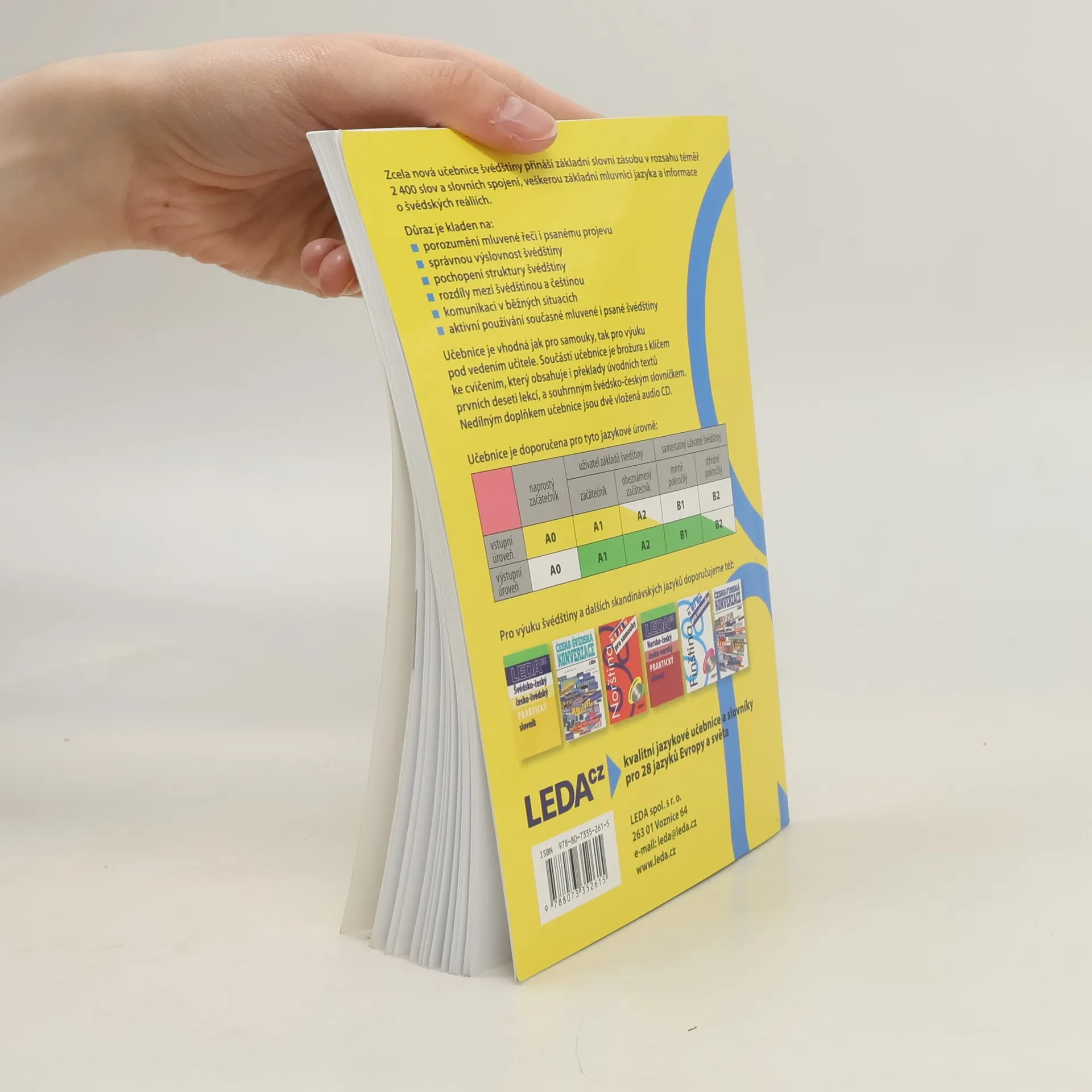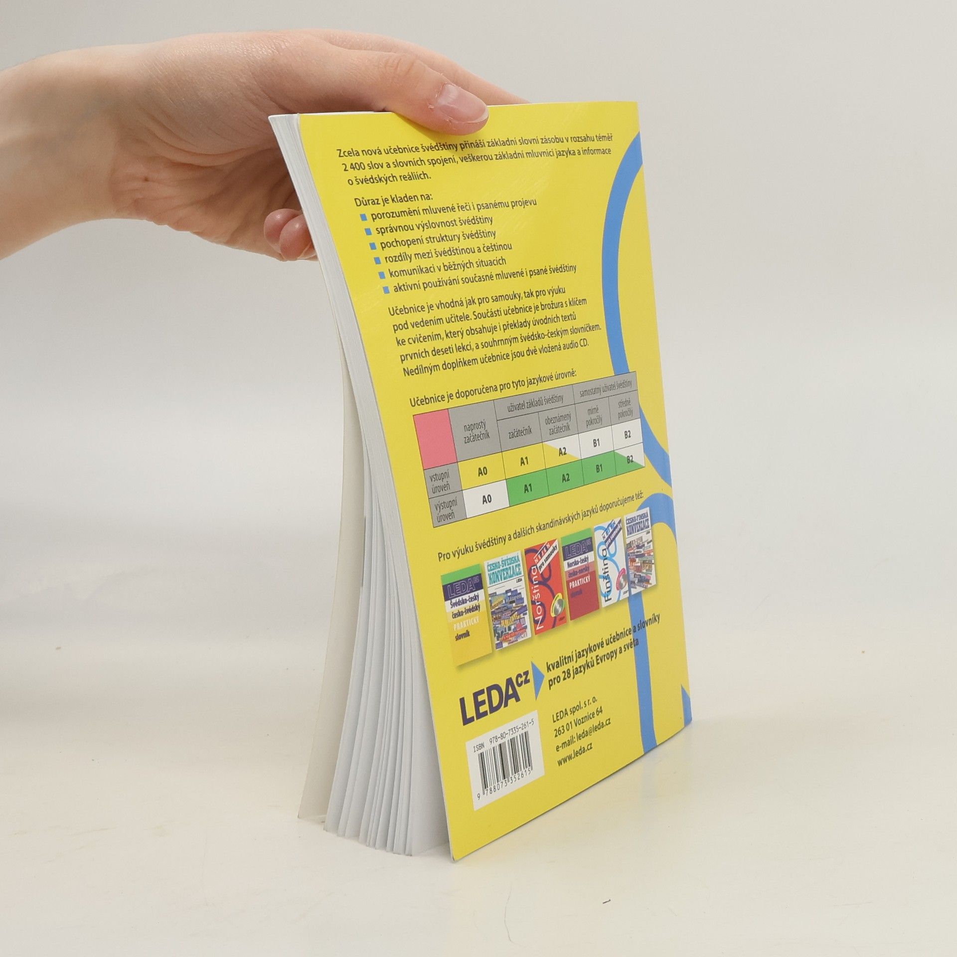 Zcela nová učebnice švédštiny je určena jak pro samostatné studium, tak pro výuku pod vedením učitele. S její pomocí si osvojíte základní slovní zásobu v rozsahu téměř 2 400 slov, frazeologii, gramatiku a výslovnost švédštiny. Naučíte se komunikovat v běžných situacích a dozvíte se také hodně o švédských reáliích. Samostatná úvodní kapitola je věnována výslovnosti švédštiny. Každá z následujících dvaceti tematicky zaměřených lekcí obsahuje dva úvodní dialogy či texty, slovní zásobu, mluvnickou část, cvičení a doplňkovou část. Součástí učebnice je brožura s klíčem ke cvičením, který uvádí i překlady úvodních textů prvních deseti lekcí, a souhrnným švédsko-českým slovníčkem..