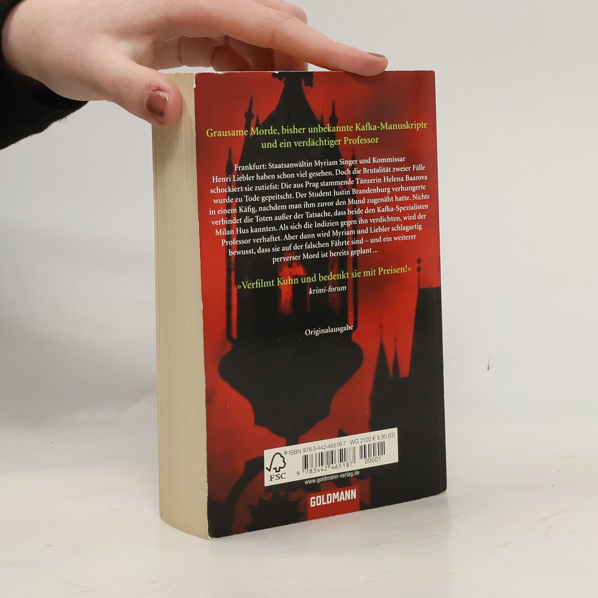 Drei grausame Todesfälle, ein bisher unbekanntes Kafka-Manuskript und ein verdächtiger Professor Staatsanwältin Myriam Singer und Kommissar Henri Liebler stehen vor einem Rätsel: Die aus Prag stammende Tänzerin Helena Baarova wurde zu Tode gepeitscht, der Student Justin Brandenburg in seiner Wohnung in einen Käfig gesperrt, wo er verhungerte. Nichts verbindet die Toten außer einem eingeritzten Kreuz im Nacken; außerdem kannten beide den Kafka-Spezialisten Milan Hus. Dann verschwindet der Assistent von Hus spurlos, und der Professor wird verhaftet. Aber Myriam glaubt nicht an seine Schuld. Sie hat vielmehr das ungute Gefühl, dass sie und Liebler auf der ganz falschen Fährte sind … Der Krimi zum Kafka-Jahr 2008!