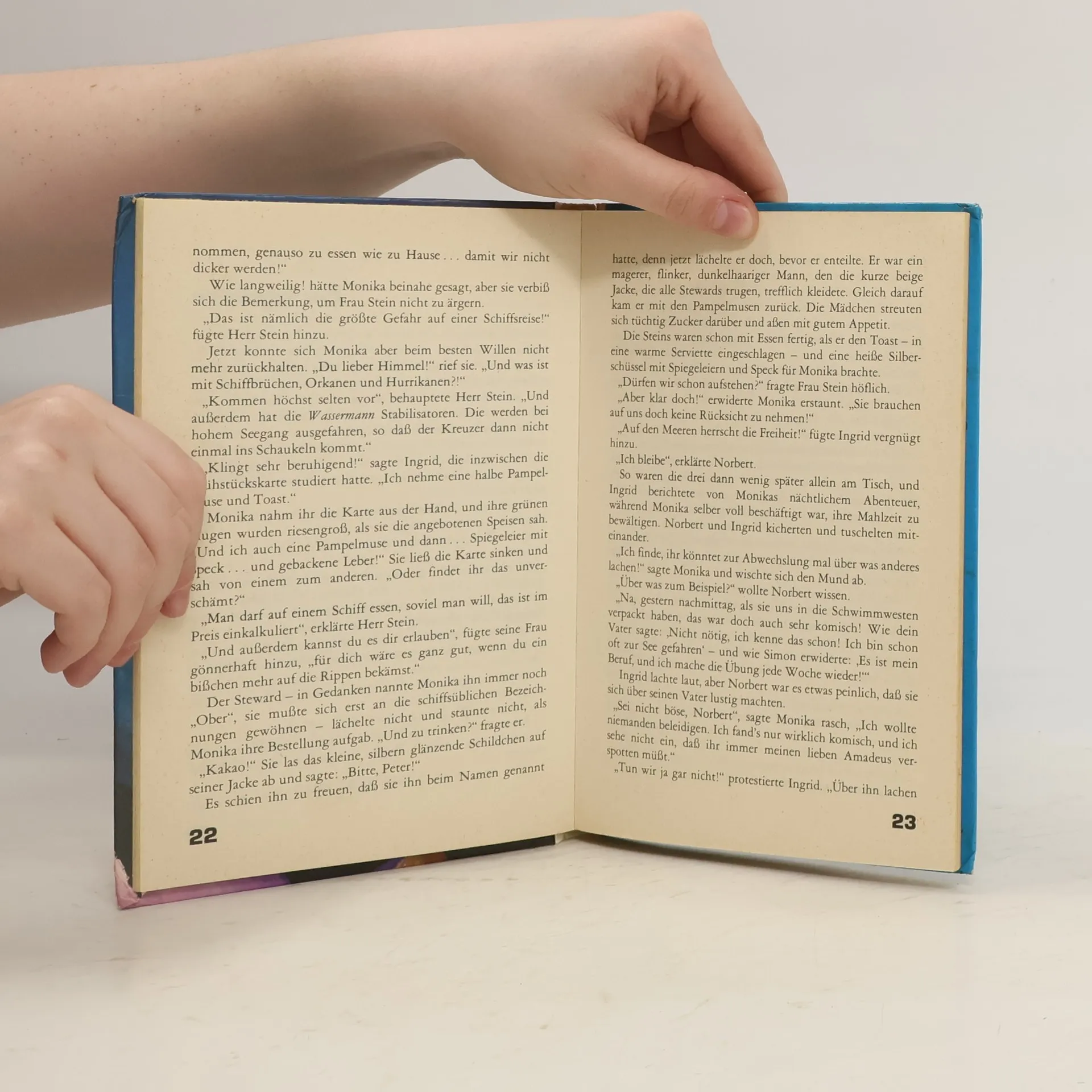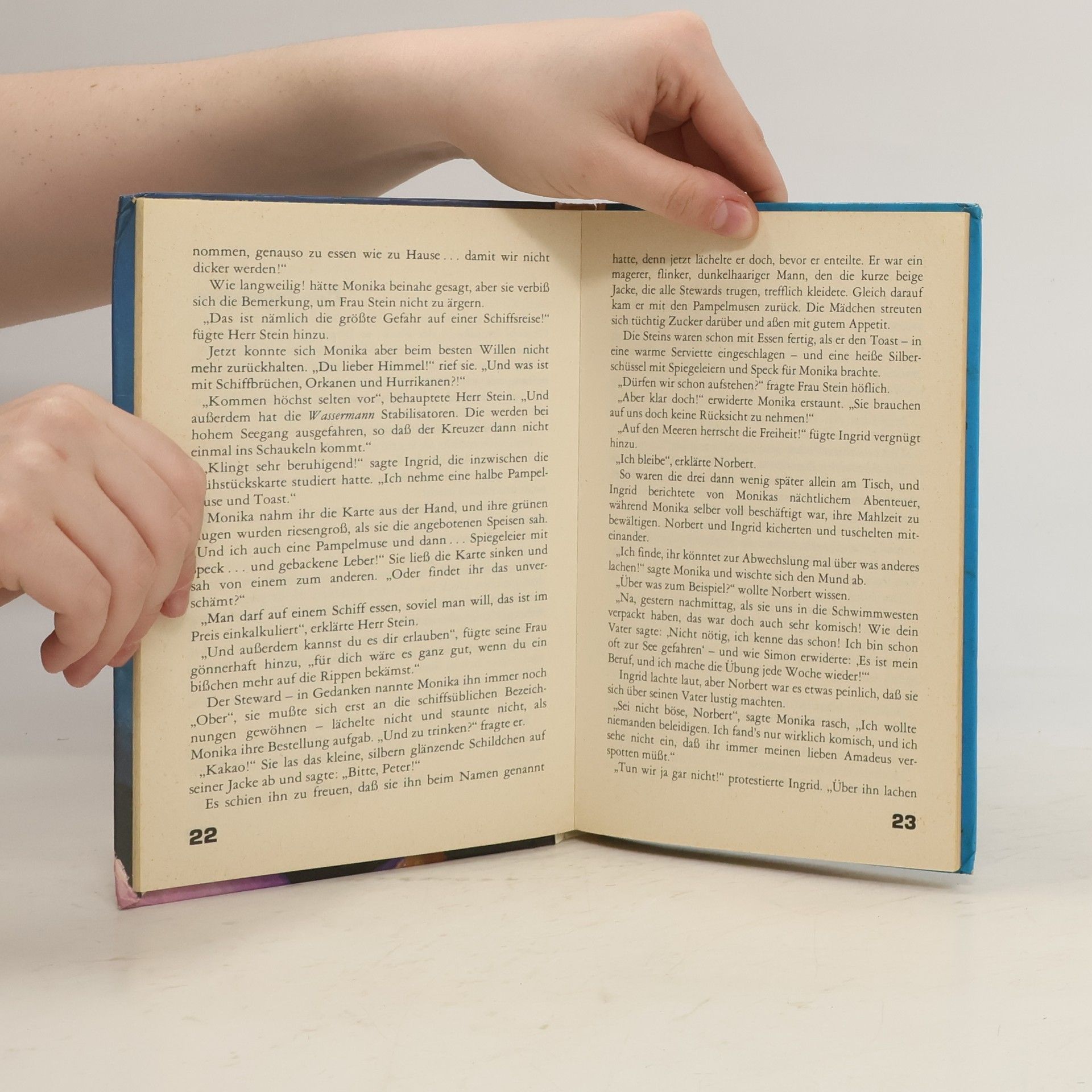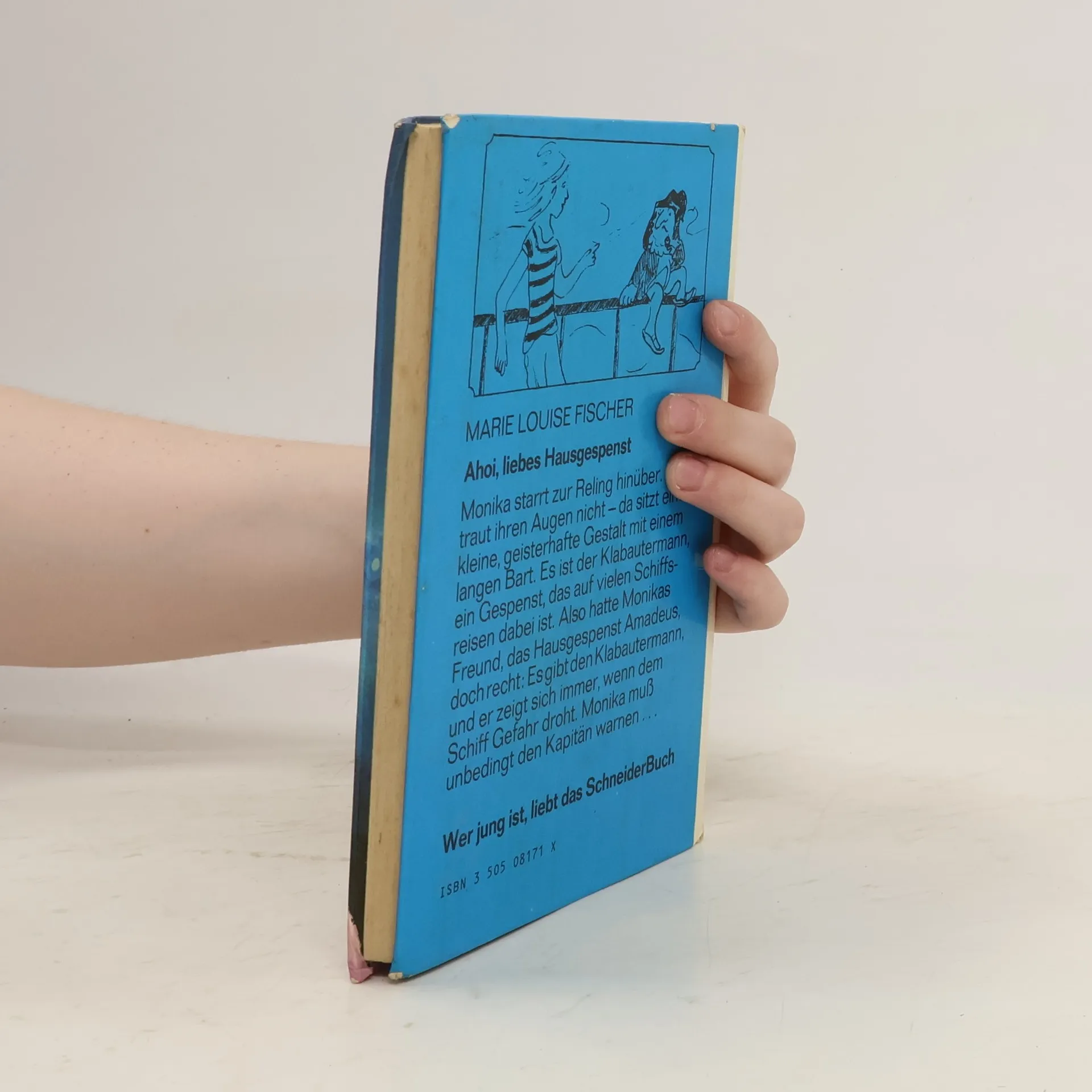 Monika starrt zur Reling hinüber. Sie traut ihren Augen nicht - da sitzt eine kleine, geisterhafte Gestalt mit einem langen Bart. Es ist der Klabautermann, ein Gespenst, das auf vielen Schiffsreisen dabei ist. Also hatte Monikas Freund, das Hausgespenst Amadeus, doch recht: Es gibt den Klabautermann, und er zeigt sich immer, wenn dem Schiff Gefahr droht. Monika muß unbedingt den Kapitän warnen...