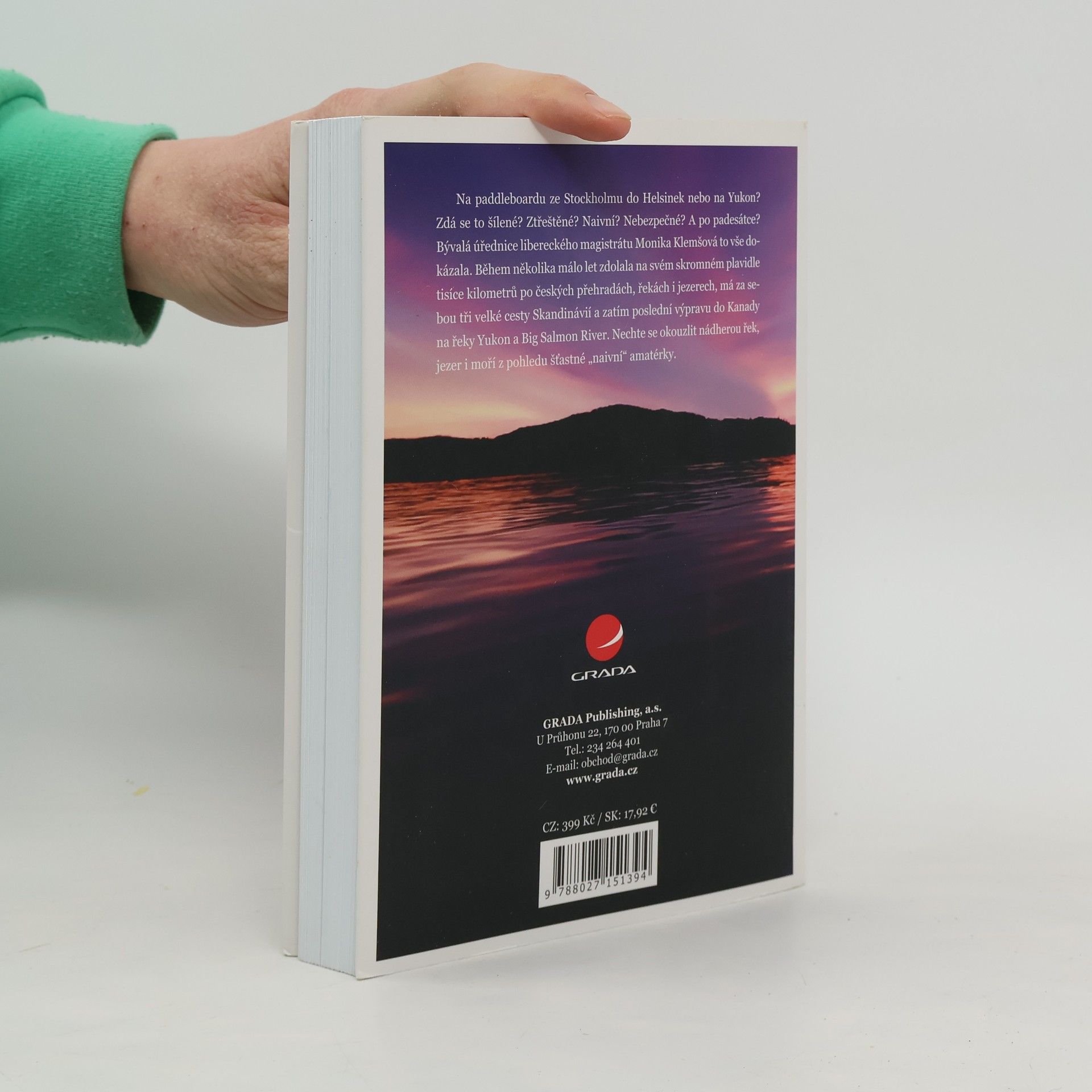 Na paddleboardu ze Stockholmu do Helsinek nebo na Yukon? Zdá se to šílené? Ztřeštěné? Naivní? Nebezpečné? A po padesátce? Bývalá úřednice libereckého magistrátu Monika Klemšová to vše dokázala. Během několika málo let zdolala na svém skromném plavidle tisíce kilometrů po českých přehradách, řekách i jezerech, má za sebou tři velké cesty Skandinávií, a zatím poslední výpravu do Kanady na řeky Yukon a Big Salmon River. Nechte se okouzlit nádherou řek, jezer i moří z pohledu šťastné "naivní" amatérky. Miluju vodu, často u ní jen tak sedím a tiše pozoruju všechno kolem. Je mi u ní dobře možná i proto, že jsem vyrostla u nádherné přehrady v Jizerských horách. Všude, kde najdu jezera, lesy a skály, se cítím tak trochu doma. Pořád znova se divím, kolik je v té vodě síly a energie. Jak umí pohladit tělo i duši, ale i ničit a brát, co se jí zlíbí. Pro někoho je drogou, pro jiného noční můrou, umí být vším, co si jen člověk dokáže představit. Taky se mi líbí pozorovat vodáky, kteří na lodích tančí ve vířících proudech a zpěněných vlnách. Tu jsou nahoře, tu dole, nápadně to připomíná divadlo o životě. Myslím, že voda se podobá i ženám a mužům. Vím, že pro mě se víc hodí klidná voda jezerní. Možná i moře nebo široké řeky. Občas mě potrápí, nakonec ale vždycky přijde to kouzelné zrcadlení zapadajícího slunce na hladině. Jsem za tyhle chvíle nesmírně vděčná. Monika Klemšová