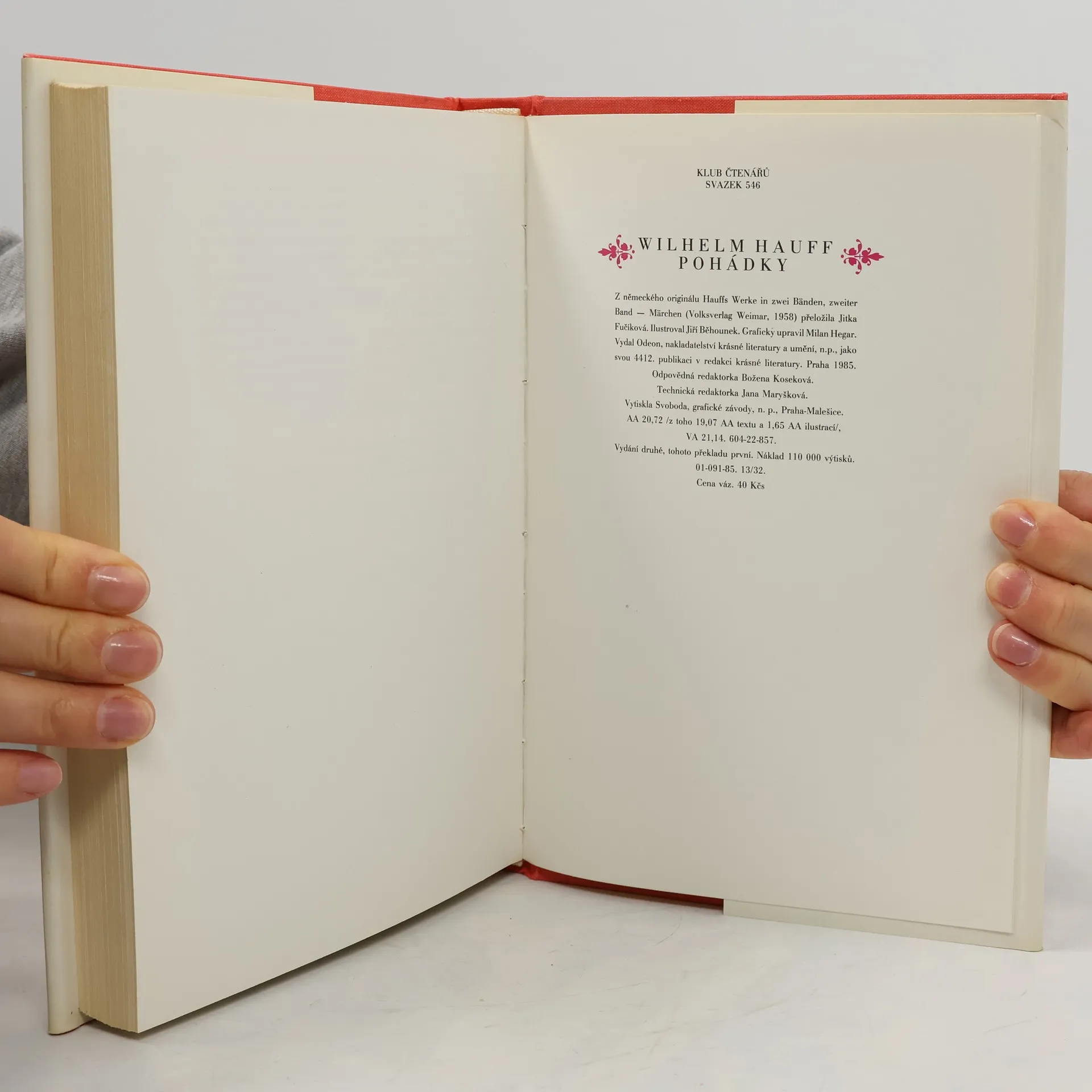Pohádky německého romantického spisovatele, v nichž se dobrodružný a fantastický prvek mísí s rozmarným, humorným. Obsahuje všechny tři almanachy: Karavana (Die Karawane, 1826) Šejk z Alexandrie a jeho otroci (Der Scheik von Alessandria und seine Sklaven, 1827) Hospoda ve Špesartu (Das Wirsthaus im Spessart, 1828) přeloženo z vydání Volksverlag Weimar, 1958 2. vydání, tohoto překladu první Pohádky: Karavana-Příběh o kalifu čápovi, Strašidelná loď, Příběh o uťaté ruce, Osvobození Fátimy, Malý Muk, Nepravý princ. Šejk z Alexandrie a jeho otroci-Trpaslík Nos, Abner, žid, který nic nevěděl, Člověk-opice, Osudy Almansorovy. Hospoda ve Špesartu-Pověst o jelení zlatce, Chladné srdce, Saidovy osudy, Steenfollská jeskyně, Chladné srdce II. Cena knihy v čase vydání: 40.- Kčs.