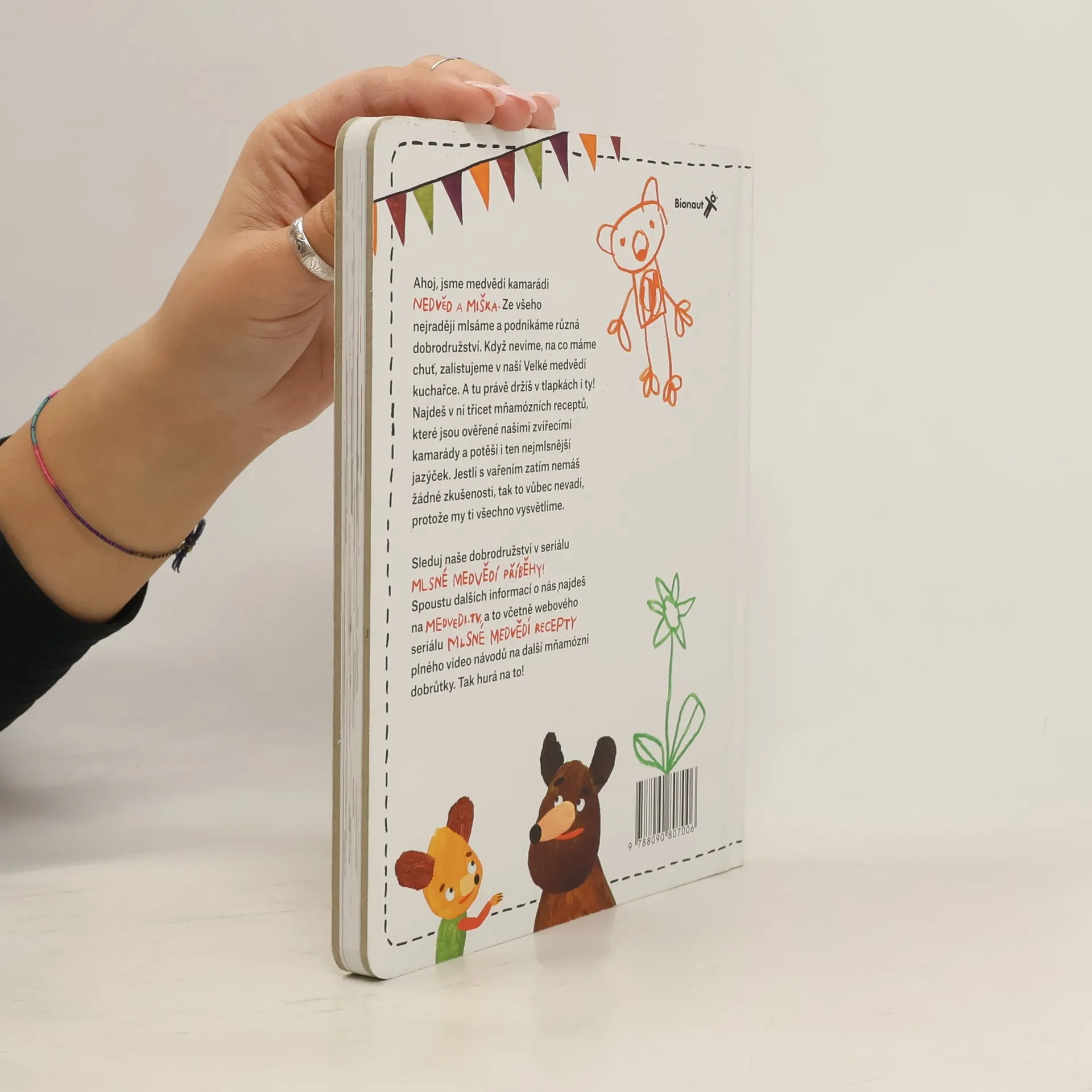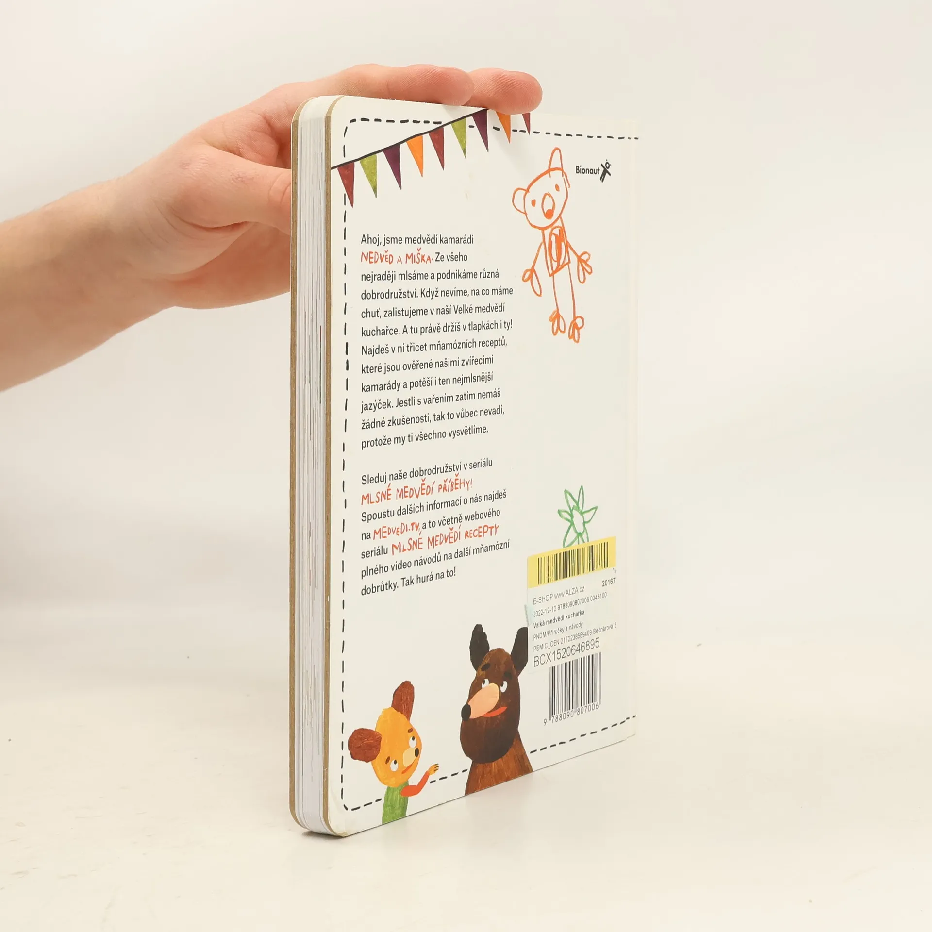 Velká medvědí kuchařka Ahoj, jsme medvědí kamarádi Nedvěd a Miška. Asi nás znáte z večerníčku Mlsné medvědí příběhy (právě běží na České televizi). Ze všeho nejraději mlsáme a podnikáme různá dobrodružství. Když nevíme, na co máme chuť, zalistujeme v naší Velké medvědí kuchařce. A tu právě držíš v tlapách i ty! Najdeš v ní třicet mňamózních receptů, které jsou ověřené našimi zvířecími kamarády a potěší i ten nejmlsnější jazýček. Jestli s vařením zatím nemáš žádné zkušenosti, tak to vůbec nevadí, všechno ti vysvětlíme. Sleduj naše dobrodružství v seriálu Mlsné medvědí příběhy! Spoustu dalších informací o nás najdeš na medvedi.tv, a to včetně webového seriálu Mlsné medvědí recepty, plného návodů na další mňamózní dobrůtky. Tak hurá na to! TV Večerníčky