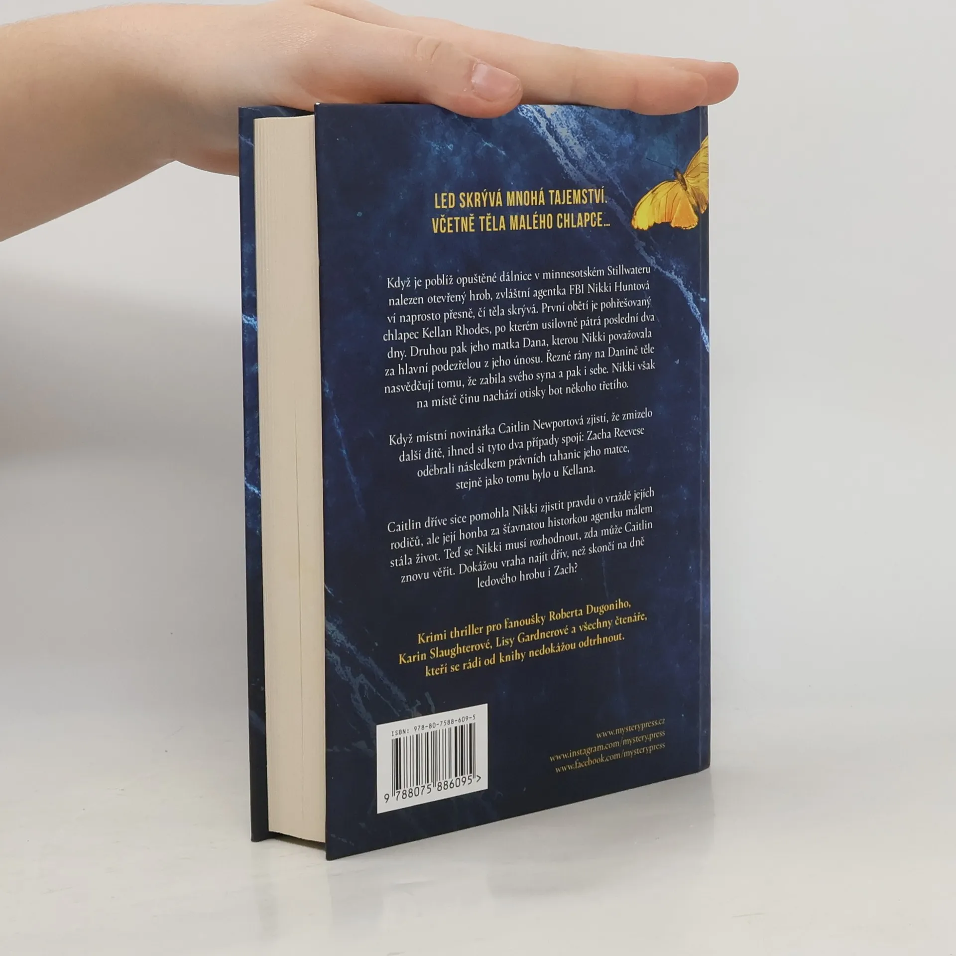 LED SKRÝVÁ MNOHÁ TAJEMSTVÍ. VČETNĚ TĚLA MALÉHO CHLAPCE Když je poblíž opuštěné dálnice v minnesotském Stillwateru nalezen otevřený hrob, zvláštní agentka FBI Nikki Huntová ví naprosto přesně, čí těla skrývá. První obětí je pohřešovaný chlapec Kellan Rhodes, po kterém usilovně pátrá poslední dva dny. Druhou pak jeho matka Dana, kterou Nikki považovala za hlavní podezřelou z jeho únosu. Řezné rány na Danině těle nasvědčují tomu, že zabila svého syna a pak i sebe. Nikki však na místě činu nachází otisky bot někoho třetího. Když místní novinářka Caitlin Newportová zjistí, že zmizelo další dítě, ihned si tyto dva případy spojí: Zacha Reevese odebrali následkem právních tahanic jeho matce, stejně jako tomu bylo u Kellana. Caitlin dříve sice pomohla Nikki zjistit pravdu o vraždě jejích rodičů, ale její honba za šťavnatou historkou agentku málem stála život. Teď se Nikki musí rozhodnout, zda může Caitlin znovu věřit. Dokážou vraha najít dřív, než skončí na dně ledového hrobu i Zach? _____ Krimi thriller pro fanoušky Roberta Dugoniho, Karin Slaughterové, Lisy Gardnerové a všechny čtenáře, kteří se rádi od knihy nedokážou odtrhnout.