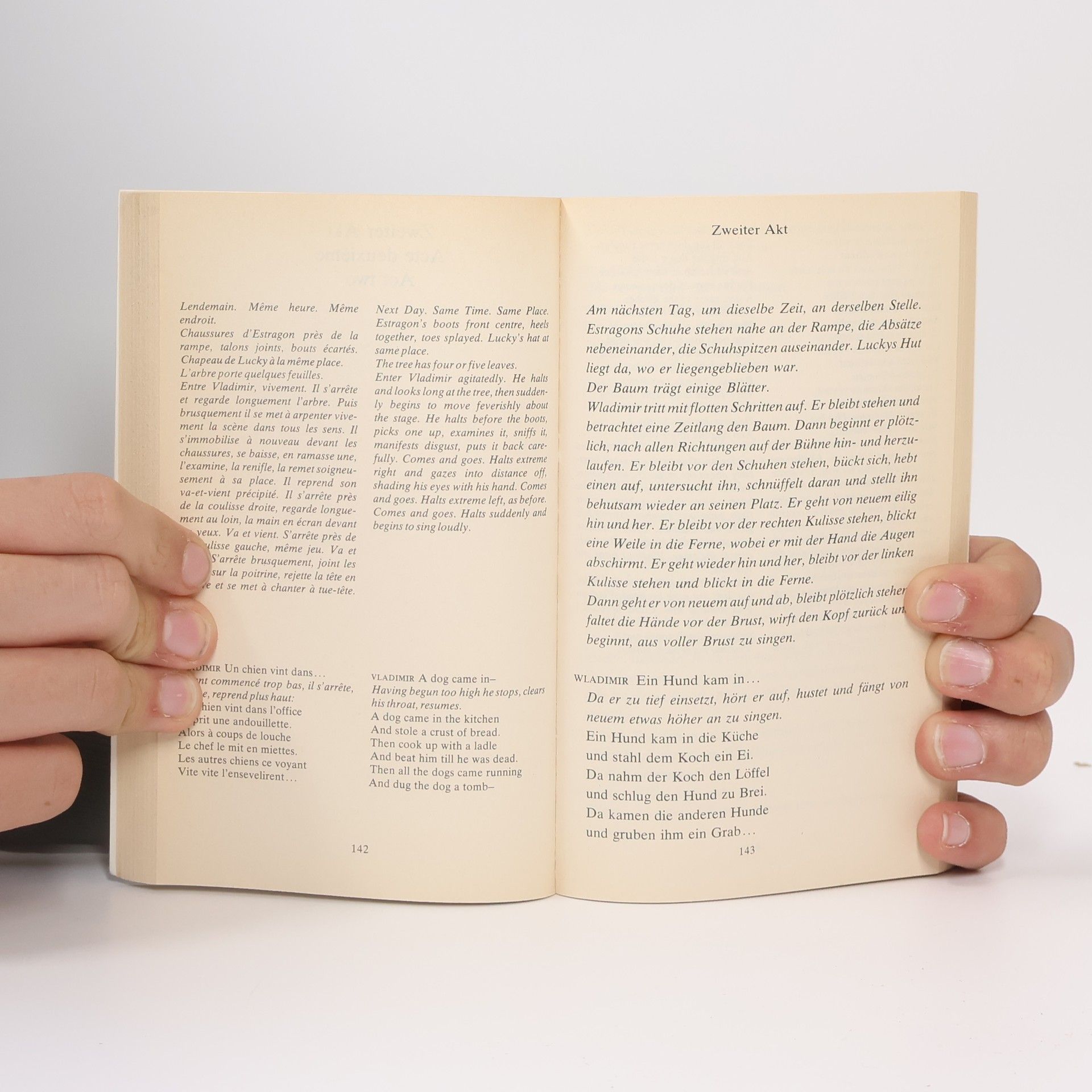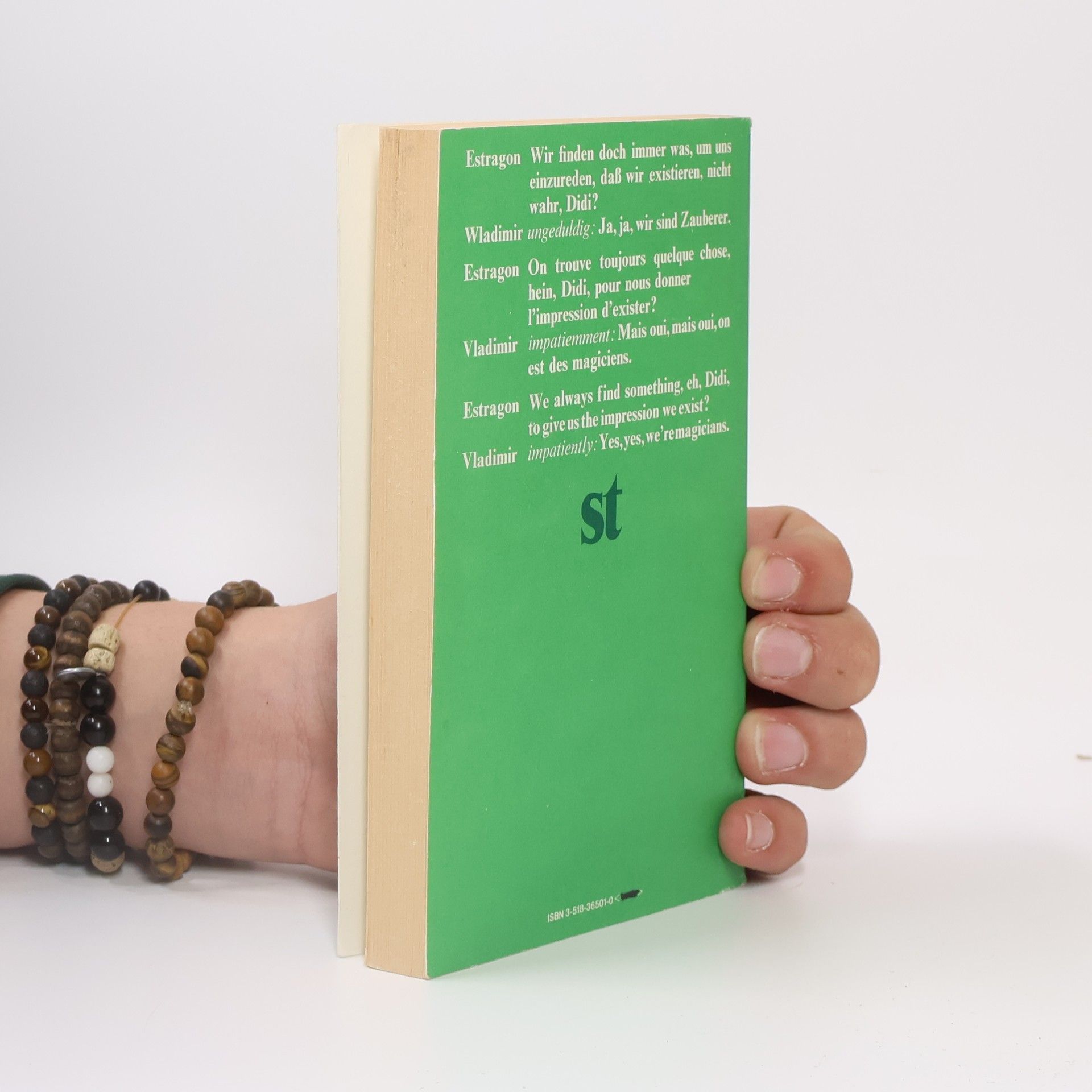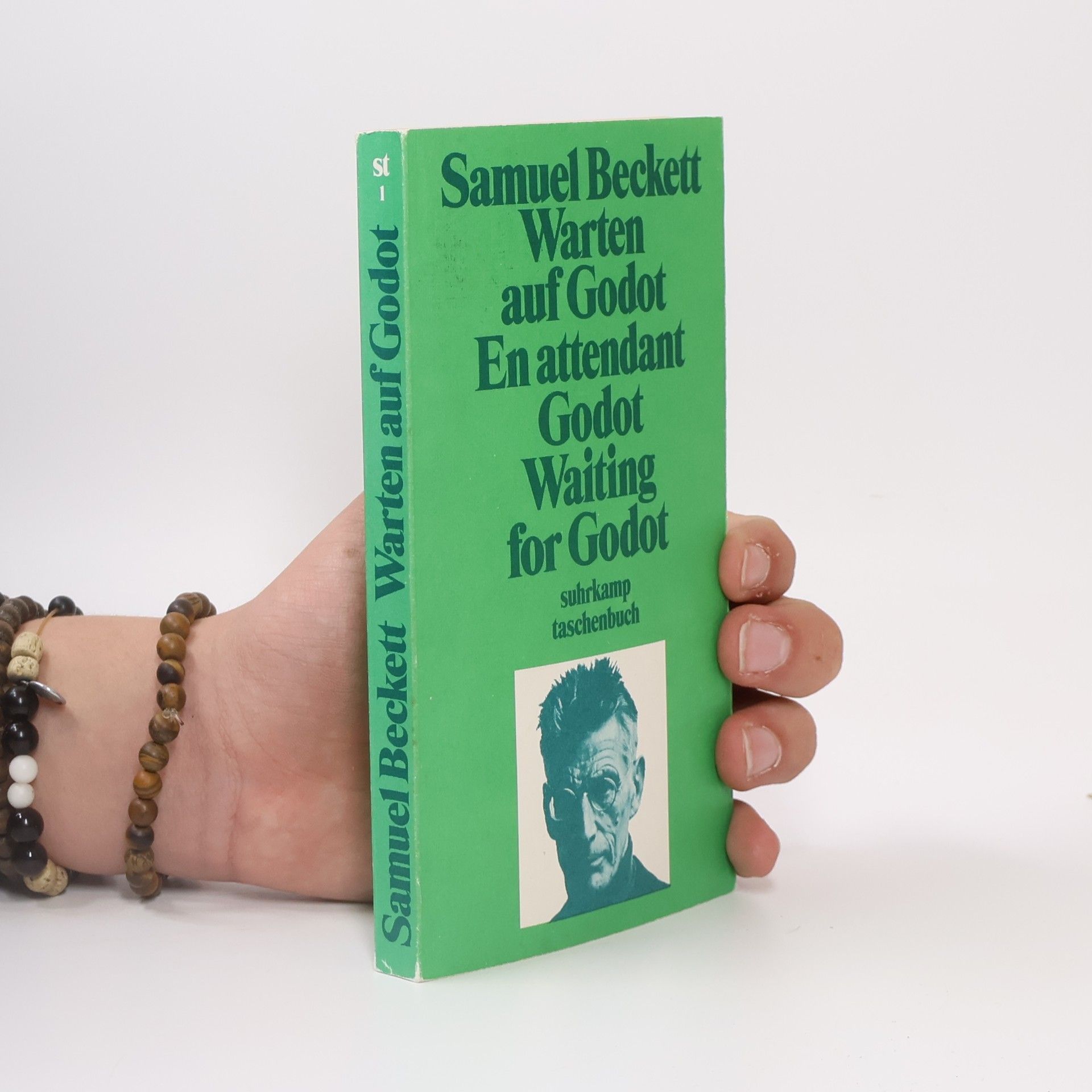 Über dieses Jahrhundertstück des irischen Nobelpreisträgers Samuel Beckett schrieb der Philosoph Günther Anders: »Der Clown ist von einer Traurigkeit, die, da sie das traurige Los der Menschen überhaupt abspiegelt, die Herzen all Menschen solidarisiert und durch diese ihre Solidarisierung erleichtert … Die Farce scheint zum Refugium der Menschenliebe geworden zu sein: die Komplizenhaftigkeit der Traurigen zum letzten Trost. Und weiß auch die Tröstung nicht, warum sie tröstet und auf welchen Godot sie vertröstet – sie beweist, daß Wärme wichtiger ist als Sinn; und daß es nicht der Metaphysiker ist, der das letzte Wort behalten darf, sondern nur der Menschenfreund.« Dreisprachige Ausgabe: Auf den Doppelseiten findet sich auf der linken Seite in der linken Spalte der französische, in der rechten Spalte der englische Originaltext und auf der rechten Seite – etwas größer gedruckt und über die gesamte Seitenbreite – die Übersetzung ins Deutsche.