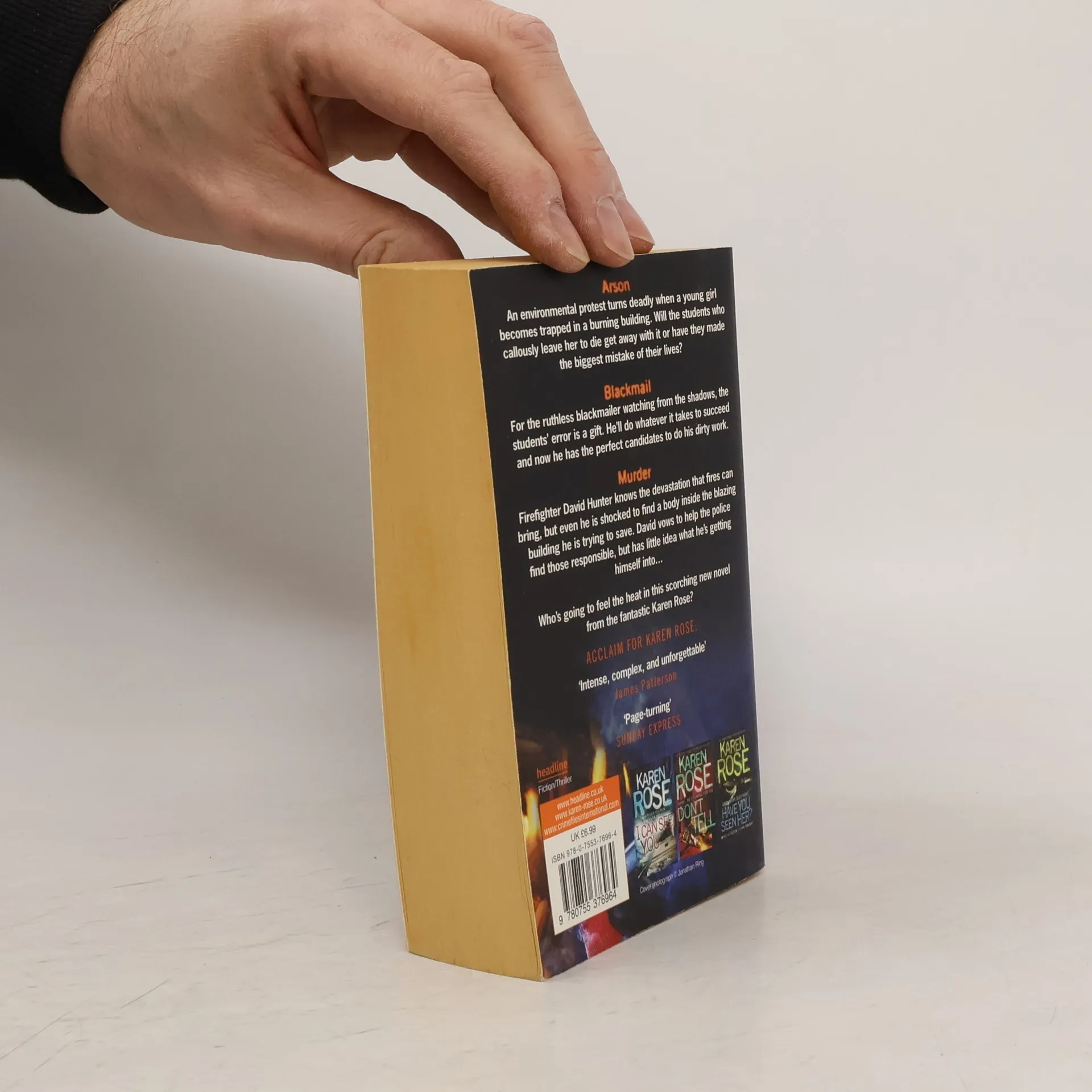 The brilliant thriller from the incomparable Karen Rose, in which an arson leads to murder and blackmail, and David Hunter, who first appeared in DON'T TELL, leads a desperate search for those responsible. Firelight, fire bright... Four kids set fire to a supposedly empty condominium block. But when they see the girl at an upper-floor window desperately banging on the glass, they realise their mistake. Although they don't all agree, the group leave the girl to her certain death, little realising that someone watching their every move. Someone who has a nasty habit of blackmail... For local fire fighter David Hunter, getting the blaze under control is hard enough, but when he finds the girl's body he realises that this arson attack has become a murder case and the homicide cops are immediately called in. Now, as David works with the cops, it's a race to find the arsonists, and the blackmailer, before events escalate out of all control.