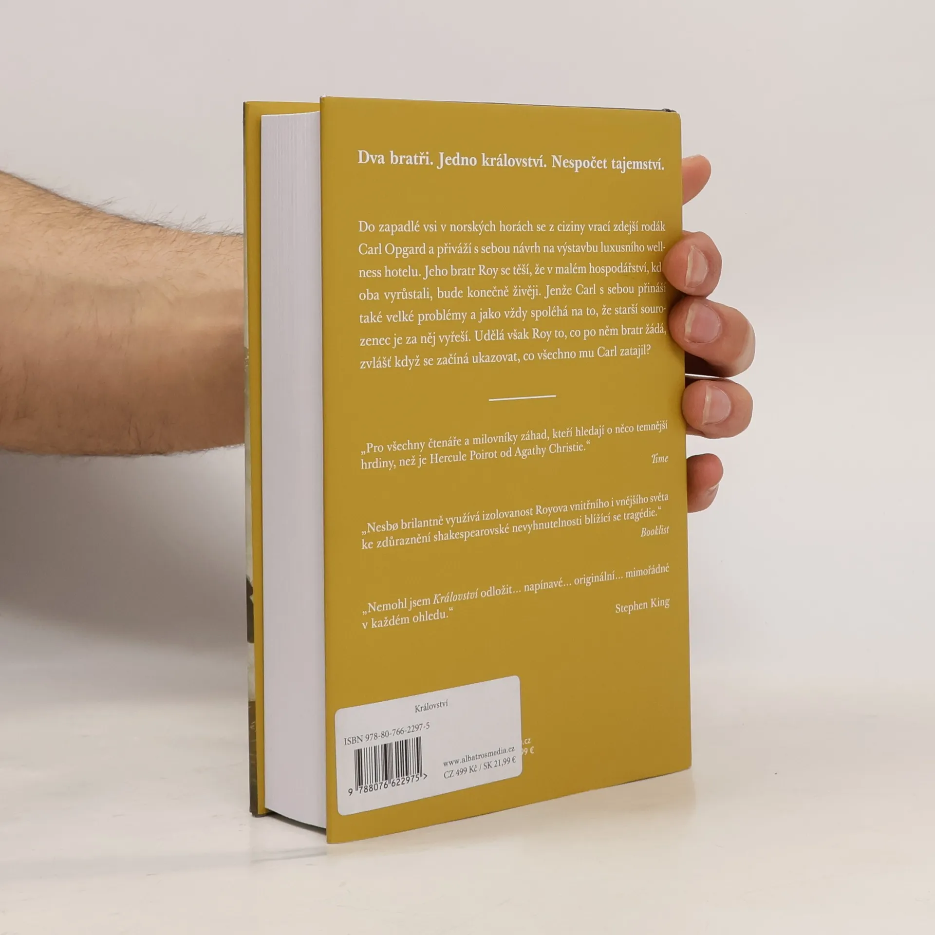 Dva bratři. Jedno království. Nespočet tajemství. Do zapadlé vsi v norských horách se z ciziny vrací zdejší rodák Carl Opgard se svou barbadoskou manželkou Shannon a přiváží s sebou návrh na výstavbu luxusního wellness hotelu. Jeho bratr Roy, který ve vsi provozuje benzínovou pumpu, se těší, že v malém hospodářství, kde po smrti rodičů oba vyrůstali, bude konečně živěji. Jenže Carl s sebou přináší také velké problémy a jako vždy spoléhá na to, že starší sourozenec je za něj vyřeší. Udělá však Roy to, co po něm bratr žádá, zvlášť když se začíná ukazovat, co všechno mu Carl zatajil? „Pro všechny čtenáře a milovníky záhad, kteří hledají o něco temnější hrdiny, než je Hercule Poirot od Agathy Christie.“ Time „Nesbo brilantně využívá izolovanost Royova vnitřního i vnějšího světa ke zdůraznění shakespearovské nevyhnutelnosti blížící se tragédie.“ Booklist „Nemohl jsem Království odložit… napínavé… originální… mimořádné v každém ohledu.“ Stephen King