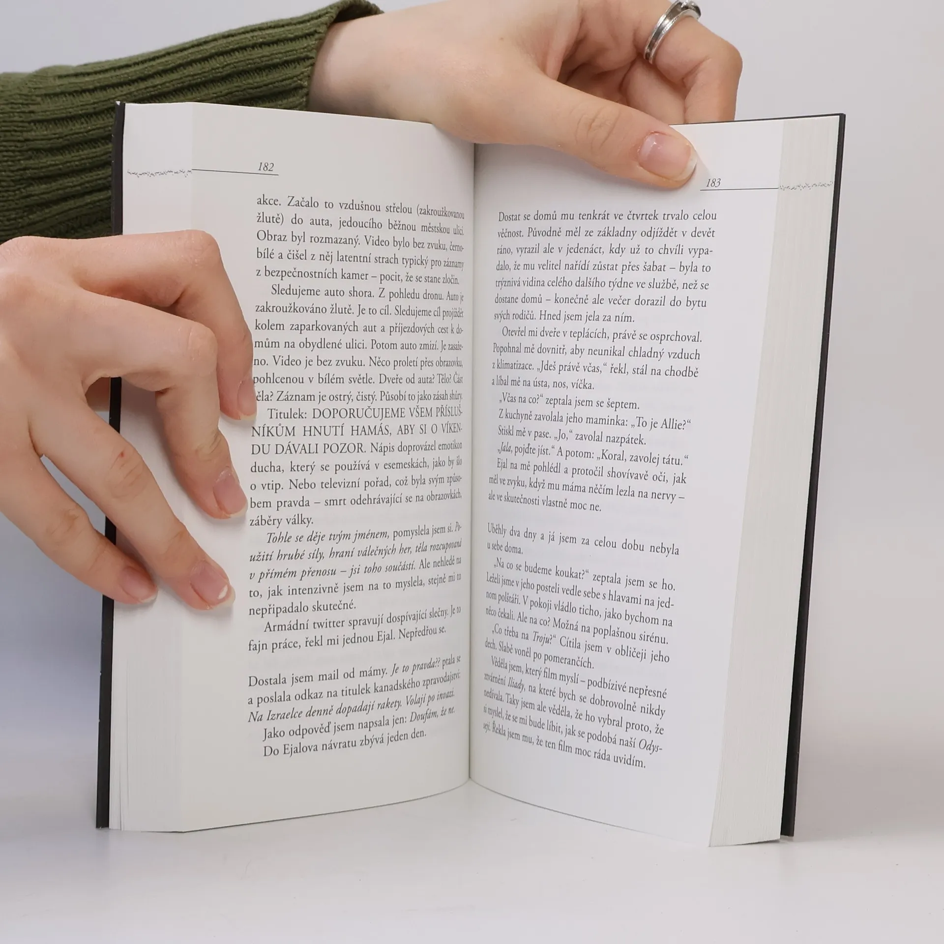 Na pozadí milostného příběhu autorka odkrývá tragické důsledky roky trvajícího bolestného konfliktu mezi Židy a Palestinci v Izraeli. Milostný příběh dospělé Kanaďanky a mladičkého vojáka odkrývá na pozadí nečekané invaze izraelské armády do Gazy palčivé otázky ohledně vlastní identity. Allison, která do Izraele přijíždí studovat, se zamiluje do země, exotického jazyka a Ejala, devatenáctiletého chlapce na vojně. Do jejich vášnivé romance ale zasáhne invaze a události, které nečekaně syrově odkrývají, kam každý z milenců dokáže zajít, aby ochránil své blízké nebo sám sebe. Poklidný život v přímořském Tel Avivu protínají zvuky sirény, obyvatelé izraelských měst se schovávají v protileteckých krytech, zatímco jejich arabští sousedé vzpomínají na hrůzy války v roce 1948, kdy přišli o své domovy. Allison navštěvuje arabské město, židovskou osadu na západním břehu, ale i přednášky o Talmudu a musí se sama rozhodnout, kam patří. Její rozhodnutí však bude mít svou cenu. Nakladatelská anotace.