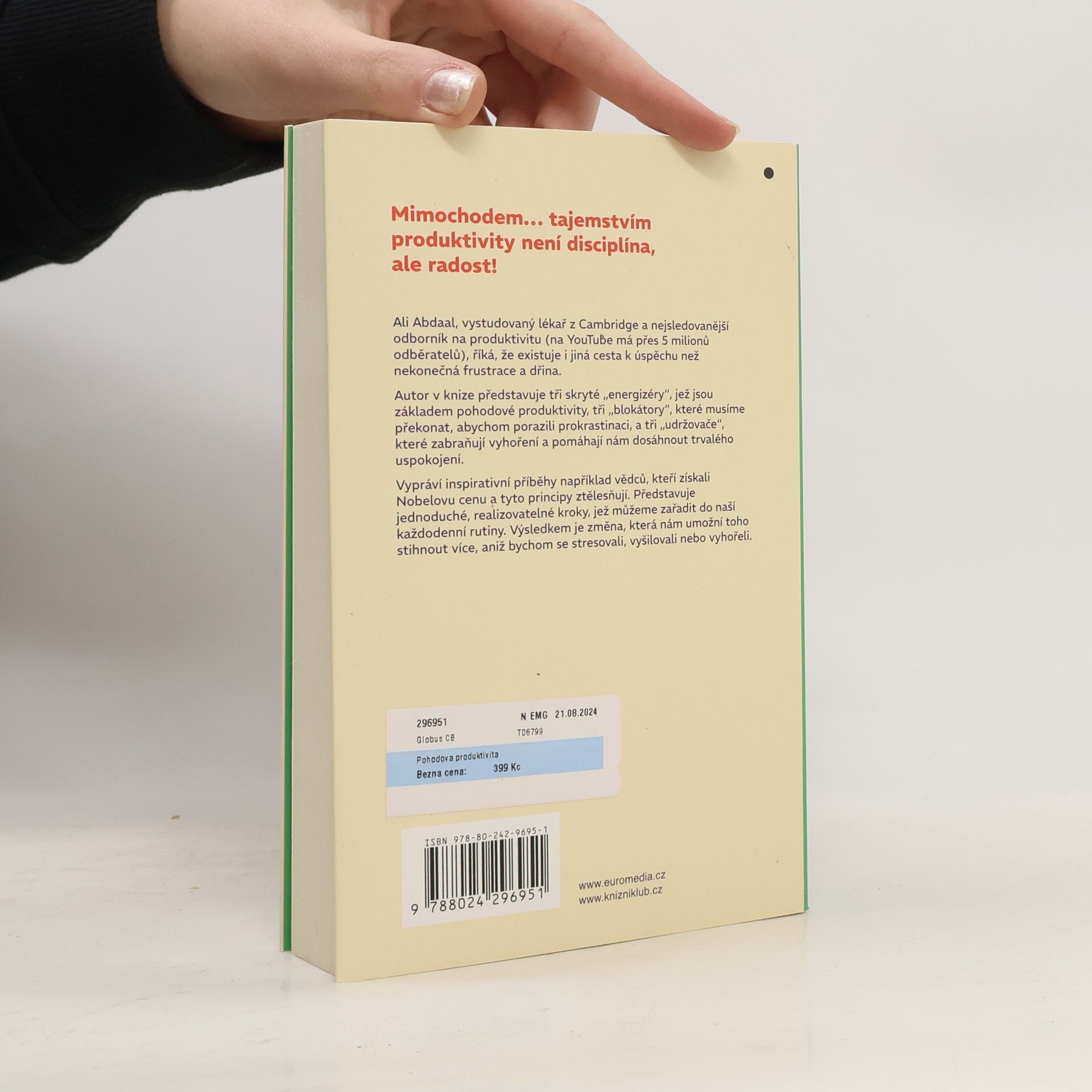 Tajemstvím produktivity není disciplína, ale radost. Ali Abdaal, vystudovaný lékař z Cambridge a nejsledovanější odborník na produktivitu (na YouTube má přes 5 milionů odběratelů) říká, že existuje i jiná cesta k úspěchu než nekonečná frustrace a dřina. Autor v knize představuje tři skryté "energizéry", které jsou základem pohodové produktivity, tři "blokátory", které musíme překonat, abychom porazili prokrastinaci, a tři "udržovače", které zabraňují vyhoření a pomáhají nám dosáhnout trvalého uspokojení. Vypráví inspirativní příběhy například vědců, kteří získali Nobelovu cenu a kteří tyto principy ztělesňují. Představuje jednoduché, realizovatelné kroky, které můžeme zařadit do naší každodenní rutiny. Výsledkem je změna, která nám umožní toho stihnout více, aniž bychom se stresovali, vyšilovali nebo vyhořeli.
