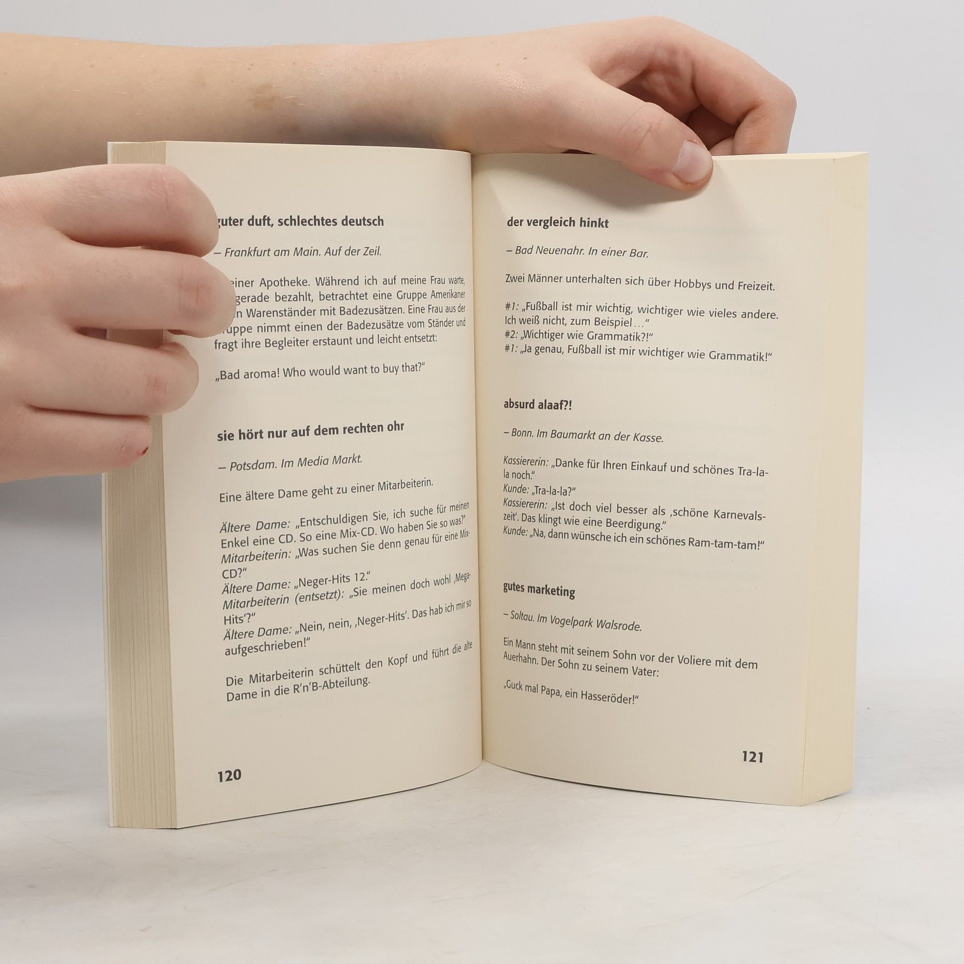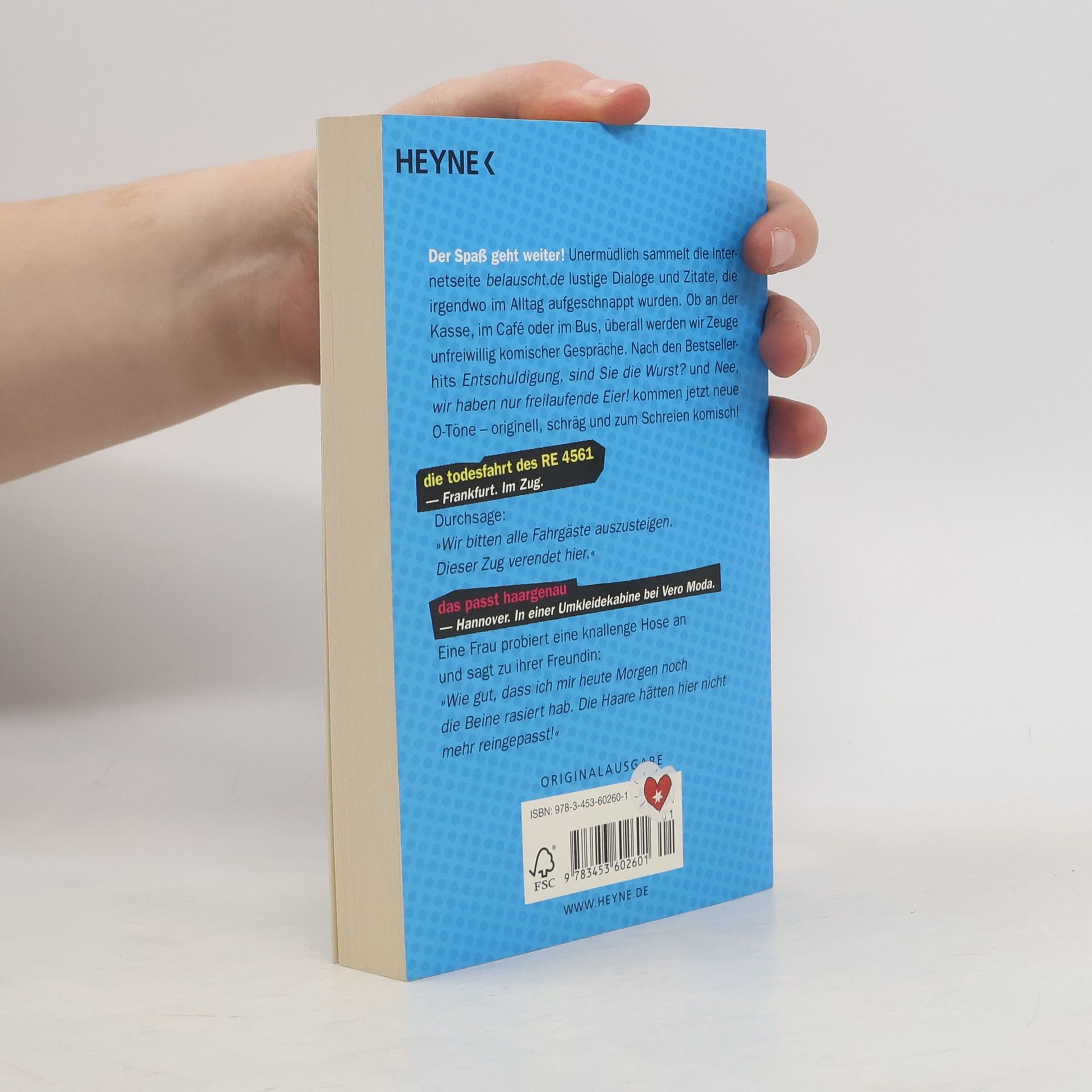 Der Spaß geht weiter! Unermüdlich sammeln die Betreiber der Internetseite 'belauscht.de' lustige Dialoge und Zitate, die irgendwo im Alltag aufgeschnappt wurden. Ob an der Kasse, im Café oder im Bus, überall werden wir Zeuge unfreiwillig komischer Gespräche. Nach den Bestsellerhits 'Entschuldigung, sind Sie die Wurst?' und 'Nee, wir haben nur freilaufende Eier!' kommen jetzt neue O-Töne aus Deutschland – originell, schräg und zum Schreien komisch!