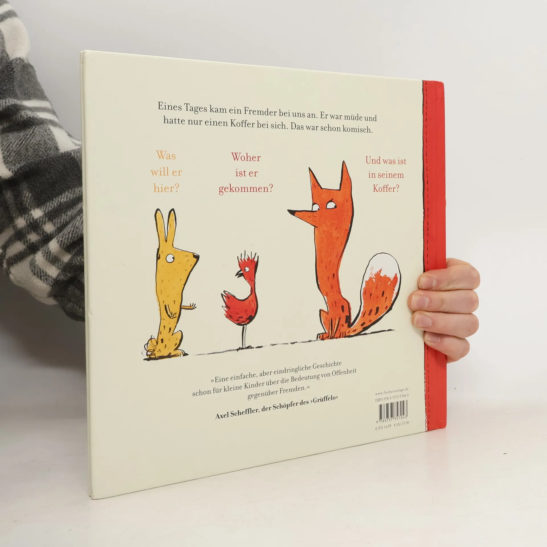 Eine einfache und liebevolle Bilderbuchgeschichte zum Thema Toleranz und Mitmenschlichkeit. Eines Tages kam ein Fremder an. Er war müde und hatte nur einen Koffer bei sich. Das war schon komisch. Was will er hier? Woher ist er gekommen? Und was ist in seinem Koffer? Hase Vogel und Fuchs sind misstrauisch und glauben dem Fremden nicht, als er erzählt, dass er seine Lieblingstasse und auch sein Zuhause in seinem Koffer hat . Als der vor Erschöpfung einschläft, brechen sie aus lauter Neugier den Koffer auf. Sie finden tatsächlich eine zerbrochene Tasse und ein Photo von seinem Zuhause. Sie haben ein schlechtes Gewissen , kleben die Tasse und bauen eine Hütte für den Fremden. Und jetzt wollen sich alle besser kennenlernen. Eine Bilderbuchgeschichte, die schon kleinen Kindern erzählt, wie wichtig es ist, Fremden mit Offenheit zu begegnen.