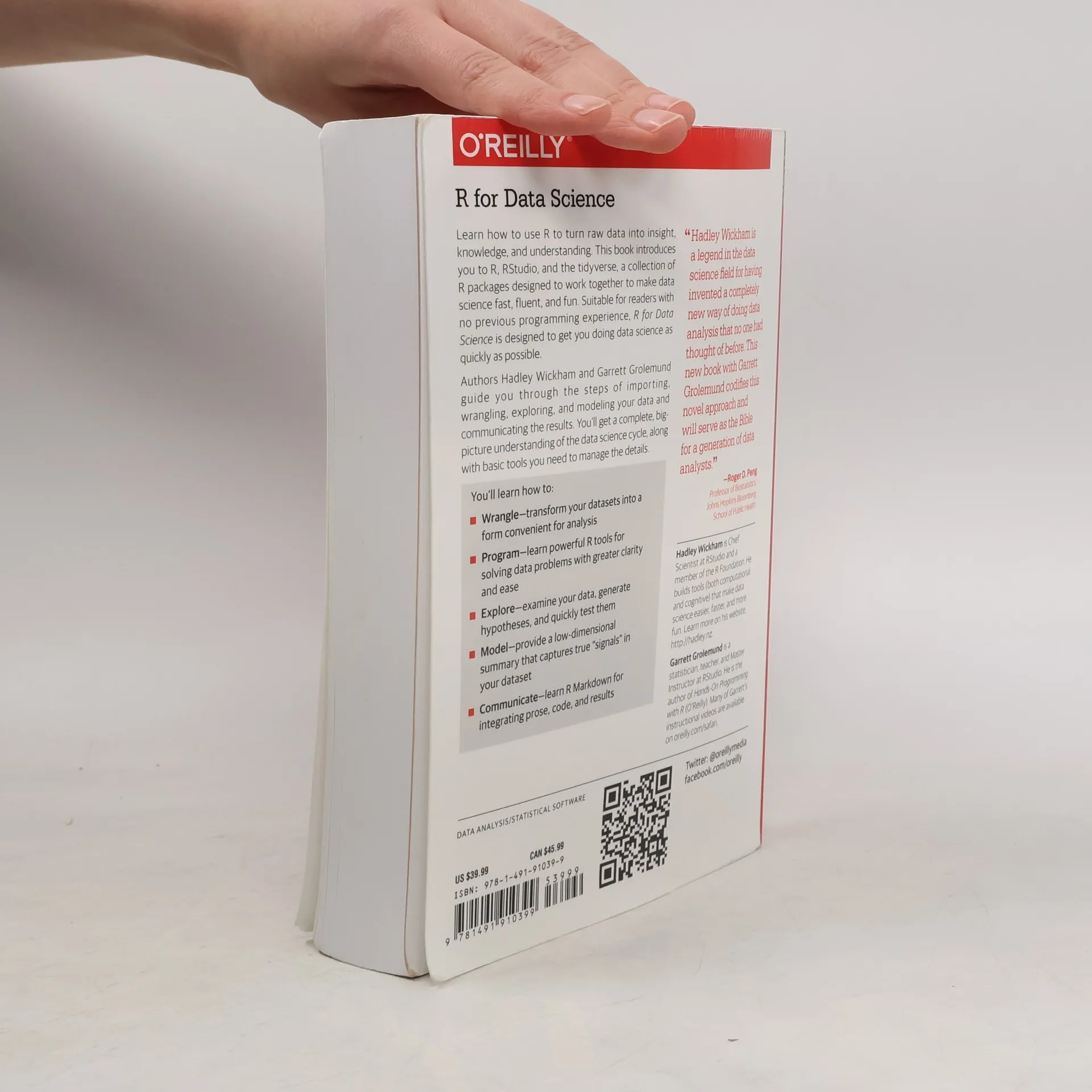 Learn how to use R to turn raw data into insight, knowledge, and understanding. This book introduces you to R, RStudio, and the tidyverse, a collection of R packages designed to work together to make data science fast, fluent, and fun. Suitable for readers with no previous programming experience, R for Data Science is designed to get you doing data science as quickly as possible. Authors Hadley Wickham and Garrett Grolemund guide you through the steps of importing, wrangling, exploring, and modeling your data and communicating the results. You'll get a complete, big-picture understanding of the data science cycle, along with basic tools you need to manage the details. Each section of the book is paired with exercises to help you practice what you've learned along the way. You'll learn how to: Wrangle-transform your datasets into a form convenient for analysis Program-learn powerful R tools for solving data problems with greater clarity and ease Explore-examine your data, generate hypotheses, and quickly test them Model-provide a low-dimensional summary that captures true "signals" in your dataset Communicate-learn R Markdown for integrating prose, code, and results
