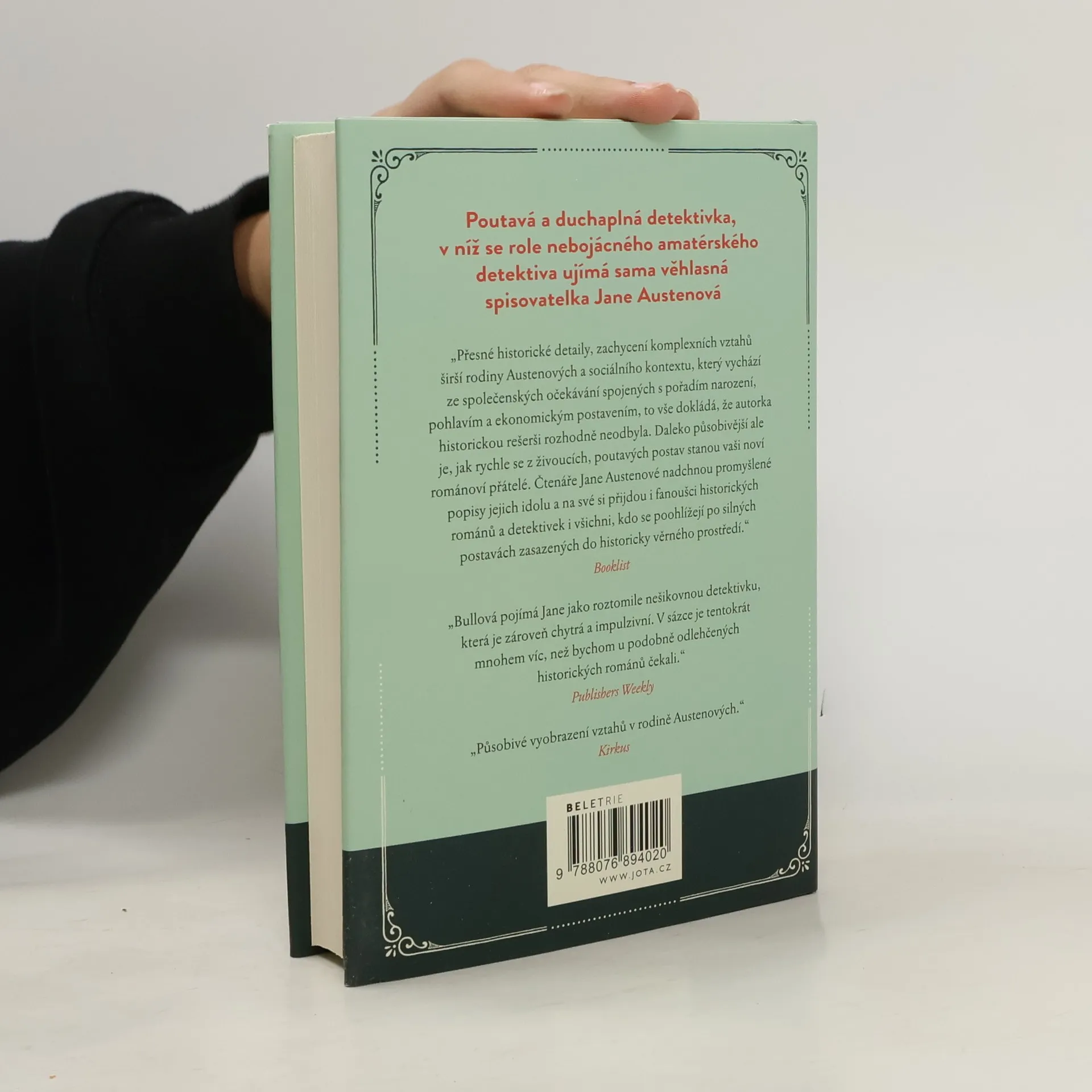 Poutavá a duchaplná detektivka, v níž se role nebojácného amatérského detektiva ujímá sama věhlasná spisovatelka Jane Austenová. Vše začíná během plesu na sousedním panství. V zamčené místnosti je nalezena mrtvá kloboučnice, a tak se kurážná a neuvěřitelně chytrá Jane ocitne ve víru záhady. Když se následně ukáže, že její bratr Georgy u sebe přechovává šperk zavražděné, mají vyšetřovatelé jasno a na obzoru se pomalu rýsuje stín šibenice. Jane nepochybuje, že její bratr je nevinný a případ je složitější, než se navenek zdá. Pátrání ji zavede do všech vrstev místní společnosti a její seznam podezřelých narůstá. Aby případ vyřešila a bratra zachránila, bude muset svůj pozorovací talent podrobit náročné zkoušce. Chytrý příběh se špetkou romantiky, který vás vtáhne do života a doby oblíbené spisovatelky Jane Austenové.