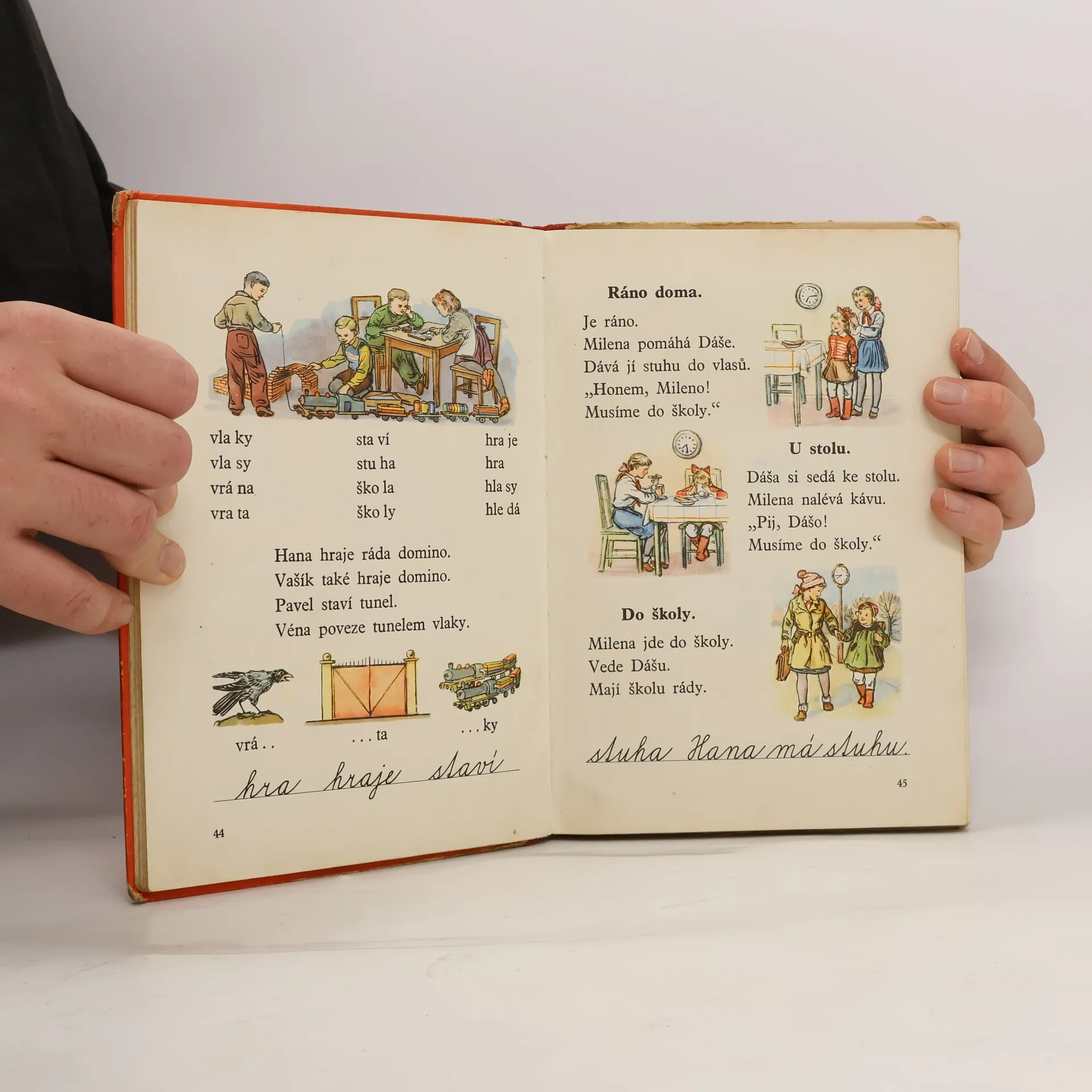 Učebnice pro 1. ročník základních škol. Kapitoly: Slova se slabikou otevřenou, Slova se slabikou zavřenou, Slova trojslabičná, Slova začínající slabikou typu vla, Mezinárodní den žen, Slova typu kočka, Práce v lese-Z. Zaoral, Veverka-Frant. Hrubín, Jaro je tady, Velký nepřítel, Slova s ě ase slabikami di, ti, ni, Havíř, Před 1. májem, 1. máj-J.V. Svoboda, Májový průvod. Práce, Ve vlaku-podle Bukvaru, Vítek, Vrátili nám svobodu, Zachránili tátu a mámu-J.V. Svoboda, Kaňka, Početní úkol podle Bukvaru, Oheň, Řepa-národní pohádky, V sadě, Pěšina, Vraník-J.V.Sládek, Kůň, Zvířata, Oříšek-J.V. Sládek, Továrna, K mezinárodnímu dni dětí, Co psal pionýr, Co si děti povídaly o našem panu presidentovi, Na louce, Silák-J.V.Sládek, Na potoce, Říkadla-národní, Jak šlo šídlo do lesa-národní pohádka, Čtyři přání podle K.D. Ušinského, Koblížek, Dobrá rada podle První čítanky, O kohoutu a psu-národní pohádka, Červen-Oto Ježek, Jahody, Kukačka-národní, Znáš písmena ?-Abeceda.
