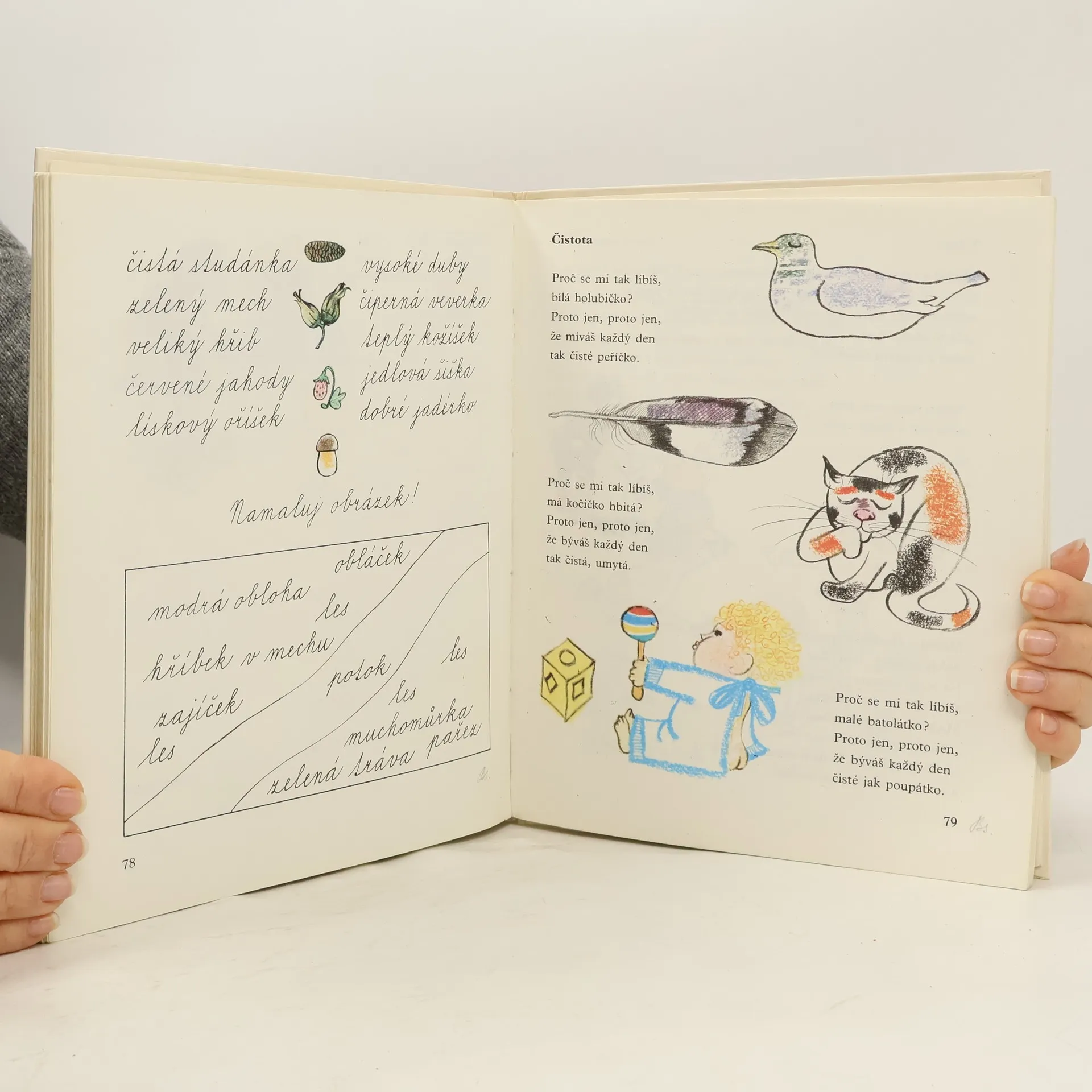 Učebnice obsahuje slabiky a slova pro nácvik uvědomělého čtení, dětské básně, říkadla a krátké příběhy s častou frekvencí přímé řeči. Slabikář byl oceněn Zlatou stuhou 1993 a téhož roku získal i Cenu Comeniana.