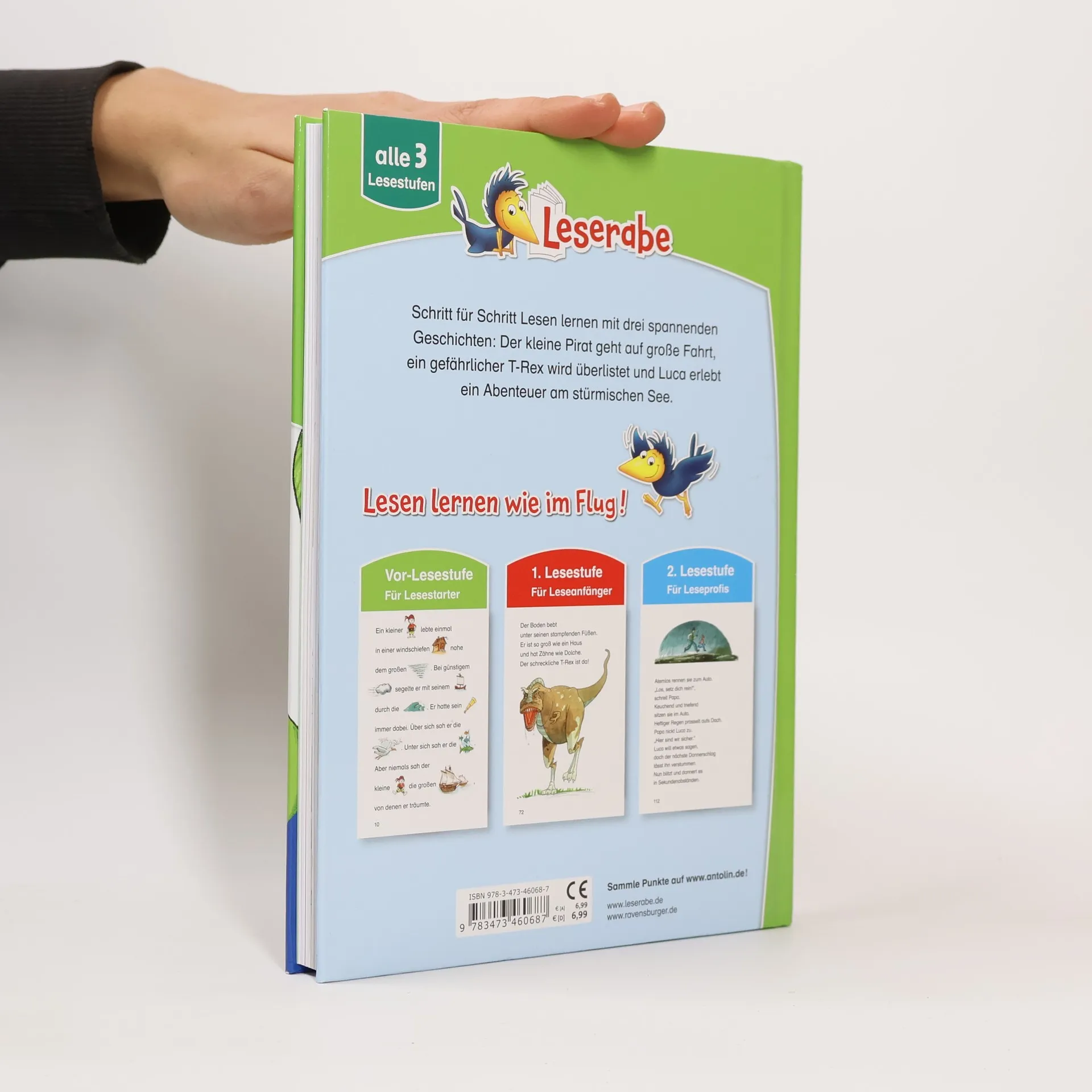 3 spannende Abenteuergeschichten in einem Band: Der kleine Pirat geht auf große Fahrt, ein gefährlicher T-Rex wird überlistet und Lucas erlebt gemeinsam mit seinem Papa Abenteuer am stürmischen See. Lesen lernen wie im Flug! Die Kinderbücher der Reihe Leserabe wurden mit Pädagogen entwickelt und richten sich an Leseanfänger ab dem Vorschulalter. Das große Leserabe-Leselernbuch enthält 3 Texte für Erstleser mit unterschiedlichem Schwierigkeitsgrad. Die Vor-Lesestufe ermöglicht, Kindern im Vorschulalter und deren Eltern als Leseteam erste gemeinsame Leseerlebnisse. Die kurzen Texte der 1. Lesestufe sind in großer Fibelschrift geschrieben, sichern erste Leseerfolge und steigern die Lesekompetenz. Spannende Geschichten in Fibelschrift wecken in der 2. Lesestufe die Lesemotivation. So werden Leseanfänger Schritt für Schritt zum Leseprofi! Empfohlen von Stiftung Lesen. Weitere Informationen auf leserabe. de.