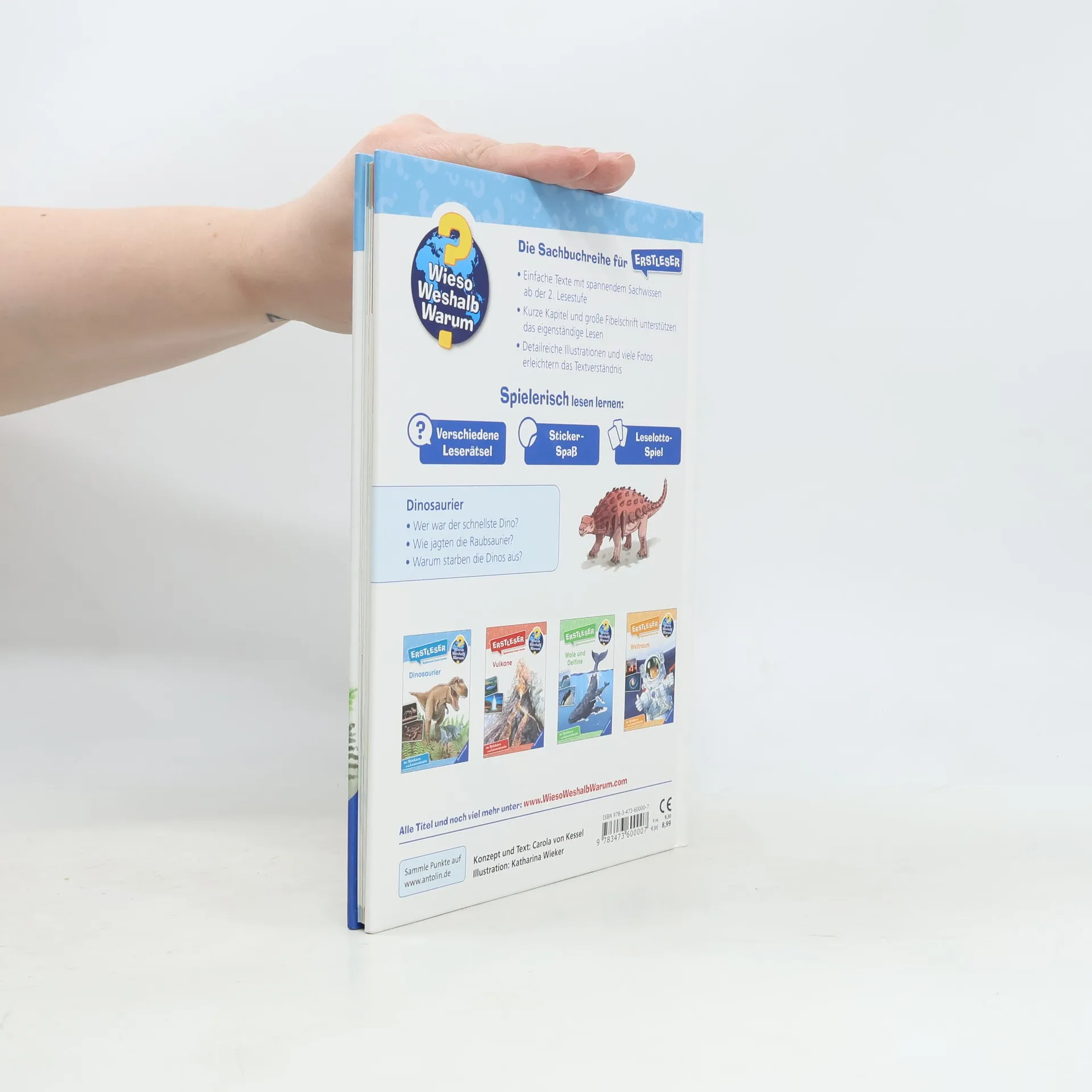 Viele Jahrmillionen waren sie die Herrscher unseres Planeten: die Dinos. Ob T-Rex, Triceratops oder Stegosaurus – hier können Erstleser die Welt der gigantischen Echsen selbständig entdecken. Sie erfahren, wie die Urzeitriesen lebten, warum sie ausstarben und wie man Fossilien erforscht. Leicht verständliche Texte, anschauliche Illustrationen und Fotos helfen beim Lesen lernen. Und für jede Menge Spaß sorgen Sticker, ein Spiel und viele Rätsel. Wieso? Weshalb? Warum? Erstleser Die Sachbuchreihe für Kinder ab der 2. Lesestufe Lesetraining, Sachwissen und Spielspaß in einem! Mit der Reihe Wieso? Weshalb? Warum? Erstleser erschließen sich Kinder ihre Lieblingsthemen selbst. In vier Kapiteln beantworten die Bücher brennende Kinderfragen in kurzen, leicht verständlichen Sätzen. Wie lebt man auf einer Raumstation? Welche Sprache sprechen Wale? Wie gefährlich ist ein Vulkan? Illustrationen und Fotos helfen den Kindern dabei, das Gelesene zu verstehen. Zusätzlich gibt es am Ende jedes Kapitels Buchstaben- und Kreuzworträtsel, Suchbilder, Sudokus und vieles mehr. Ganze acht Seiten mit unterschiedlichsten Rätseln und ein Lesequiz laden zum Knobeln ein. Ein Leselotto-Spiel hilft beim Verständnis schwieriger Wörter. Auf einer Stickerseite zeigen Texte, wo welcher Aufkleber hingehört. Spielerisch lesen lernen wird hier großgeschrieben.