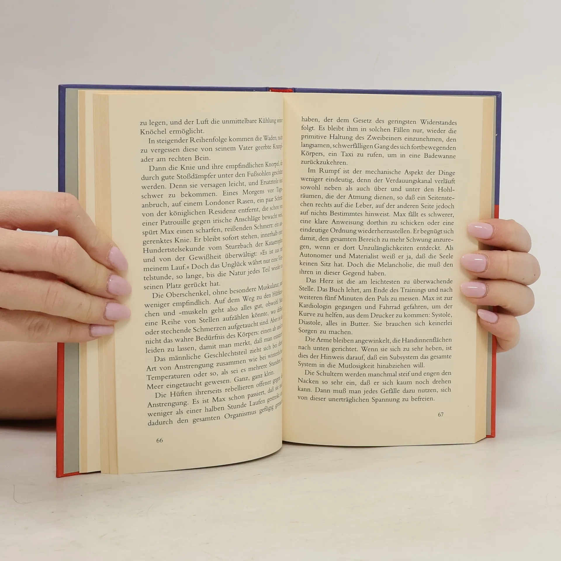 Die blaue Linie auf den Straßen New Yorks markiert den Weg durch die fünf Stadtteile, die die 250 000 Marathonläufer durchqueren, bevor sie nach 26 Meilen beim Central Park ihr Ziel erreichen. Max, der im Widerspruch zwischen erfolgreichem Architekten heute und politischem Aktivisten damals lebt, hat sich eine Zeit unter vier Studen vorgenommen. Während des Rennens wird Vergangenes wieder gegenwärtig. In diesem Roman zwischen Fiktion und literarischer Aneignung wird die Biographie einer Generation geschildert.