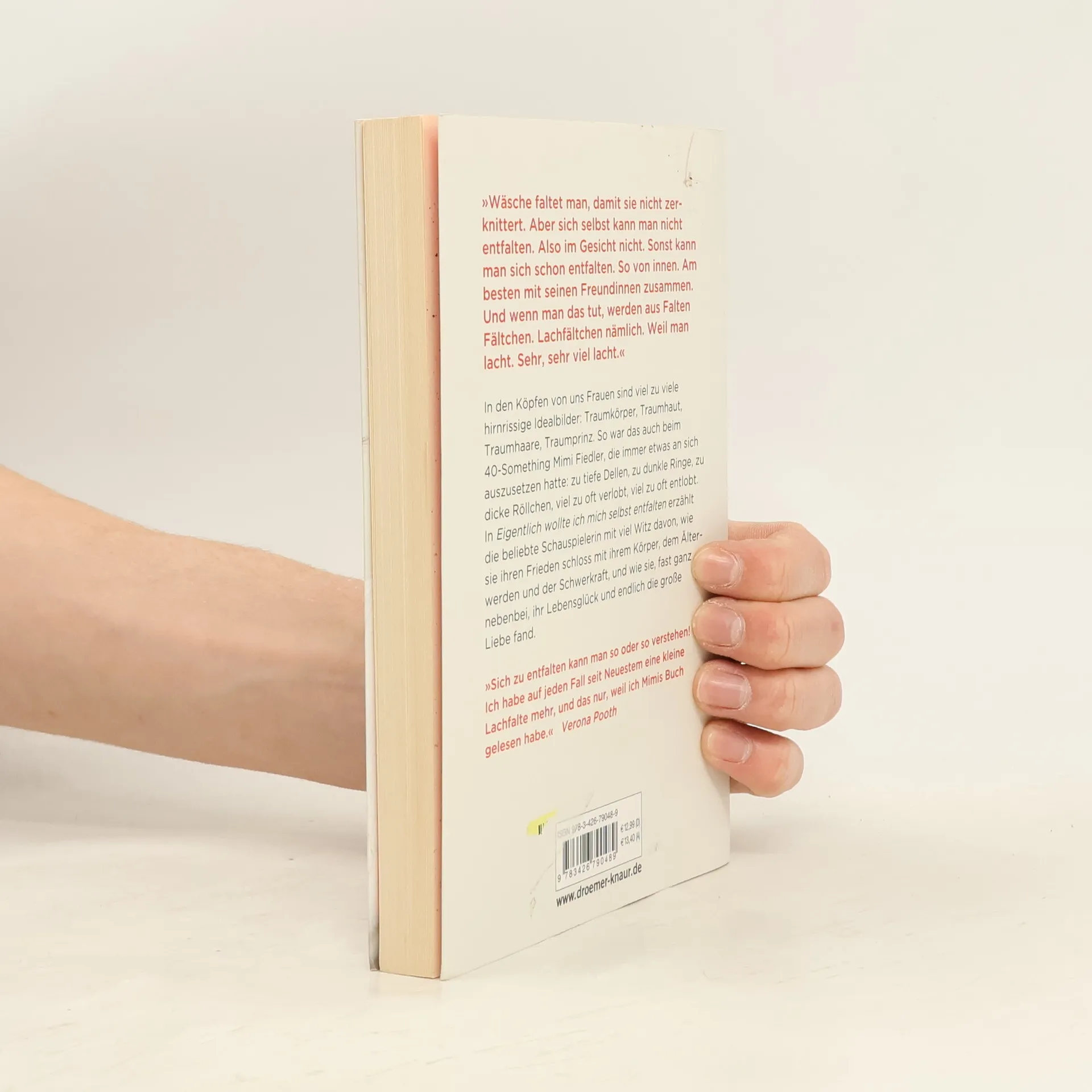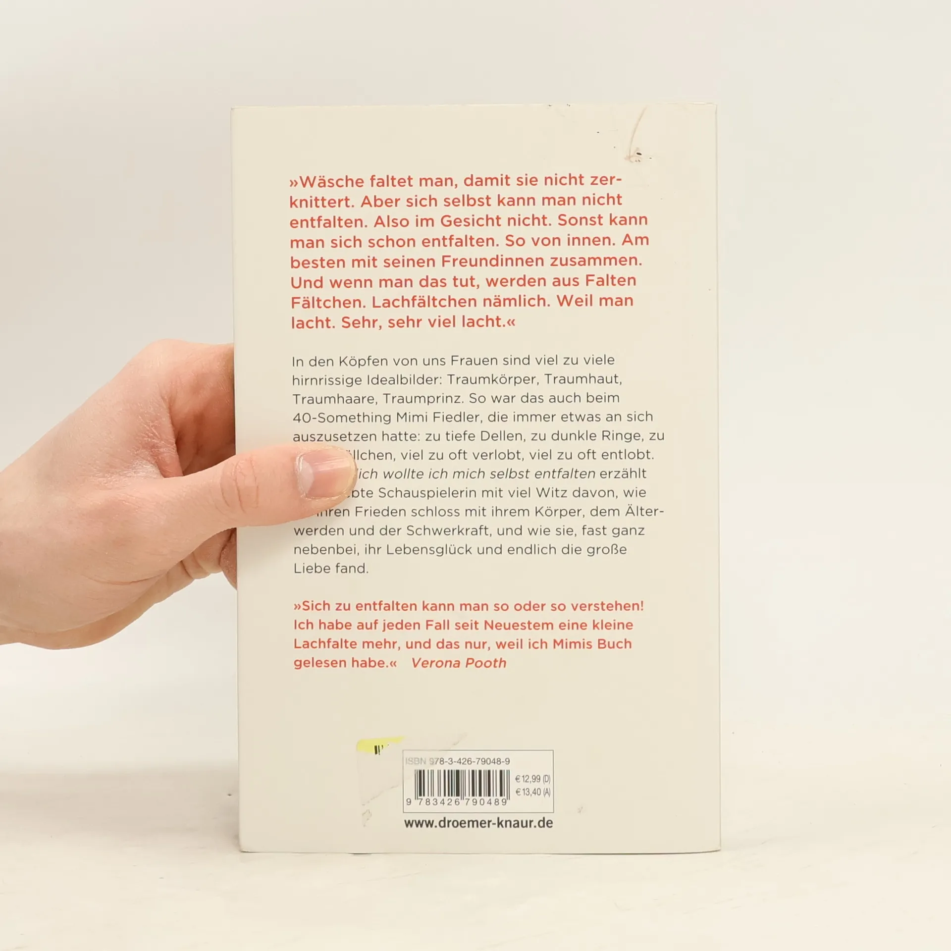 In den Köpfen vieler Frauen existieren unrealistische Idealbilder: Traumkörper, Traumhaut, Traumhaare, Traumprinz. So erging es auch der 40-jährigen Mimi Fiedler, die stets an sich selbst herumkritisierte: zu viele Dellen, dunkle Ringe, dicke Röllchen, häufige Verlobungen und Entlobungen. Mit viel Witz erzählt die beliebte Schauspielerin, wie sie Frieden mit ihrem Körper, dem Älterwerden und den Herausforderungen des Lebens schloss und dabei ihr Lebensglück sowie die große Liebe fand. Das Älterwerden bringt sowohl Gelassenheit als auch unerwünschte äußere Veränderungen mit sich – die Folgen von Sonne, Pasta und dem Leben selbst. Mimi Fiedler beschreibt selbstironisch ihre Schockmomente (wie Orangenhaut an der Wade!) und zahlreiche Versuche, den unaufhaltsamen Verfall aufzuhalten. Gleichzeitig schildert sie, wie sie in der Lebensmitte ankommt, sich selbst und ihren Mr. Right findet. Das sympathische Fazit: Jede Frau ist in ihrer Individualität okay, superokay, knallerokay. „Wäsche faltet man, damit sie nicht zerknittert. Aber sich selbst kann man nicht ent-falten. Im Gesicht nicht. Sonst kann man sich schon entfalten. So von innen. Am besten mit seinen Freundinnen zusammen. Und wenn man das tut, werden aus Falten Fältchen. Lachfältchen nämlich. Weil man lacht. Sehr, sehr viel lacht.“