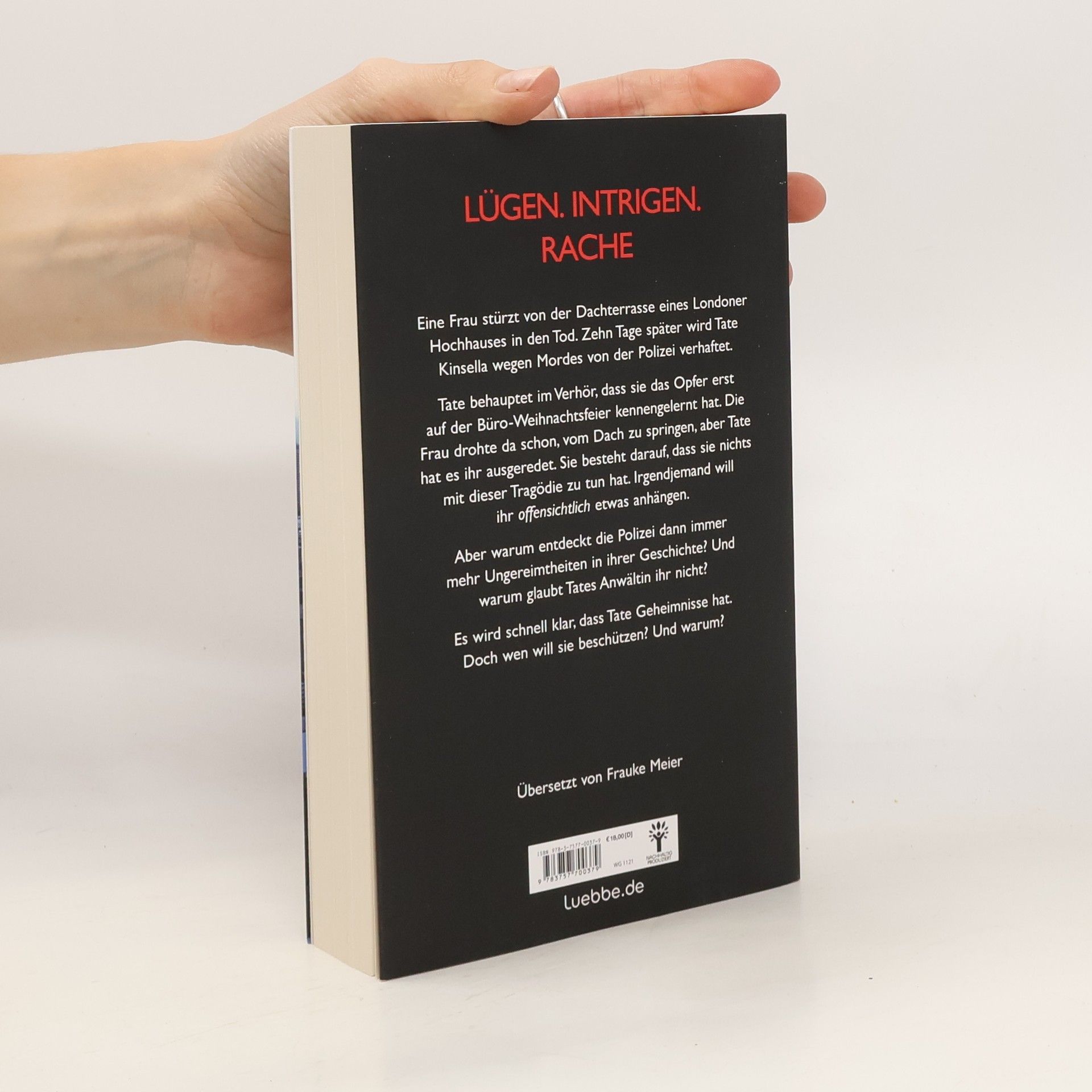 Lügen. Intrigen. Rache Eine Frau stürzt von der Dachterrasse eines Londoner Hochhauses in den Tod. Zehn Tage später wird Tate Kinsella wegen Mordes von der Polizei verhaftet. Tate behauptet im Verhör, dass sie das Opfer erst auf der Büro-Weihnachtsfeier kennengelernt hat. Die Frau drohte da schon, vom Dach zu springen, aber Tate hat es ihr ausgeredet. Sie besteht darauf, dass sie nichts mit dieser Tragödie zu tun hat. Irgendjemand will ihr offensichtlich etwas anhängen. Aber warum entdeckt die Polizei dann immer mehr Ungereimtheiten in ihrer Geschichte? Und warum glaubt Tates Anwältin ihr nicht? Es wird schnell klar, dass Tate Geheimnisse hat. Doch wen will sie beschützen? Und warum?
